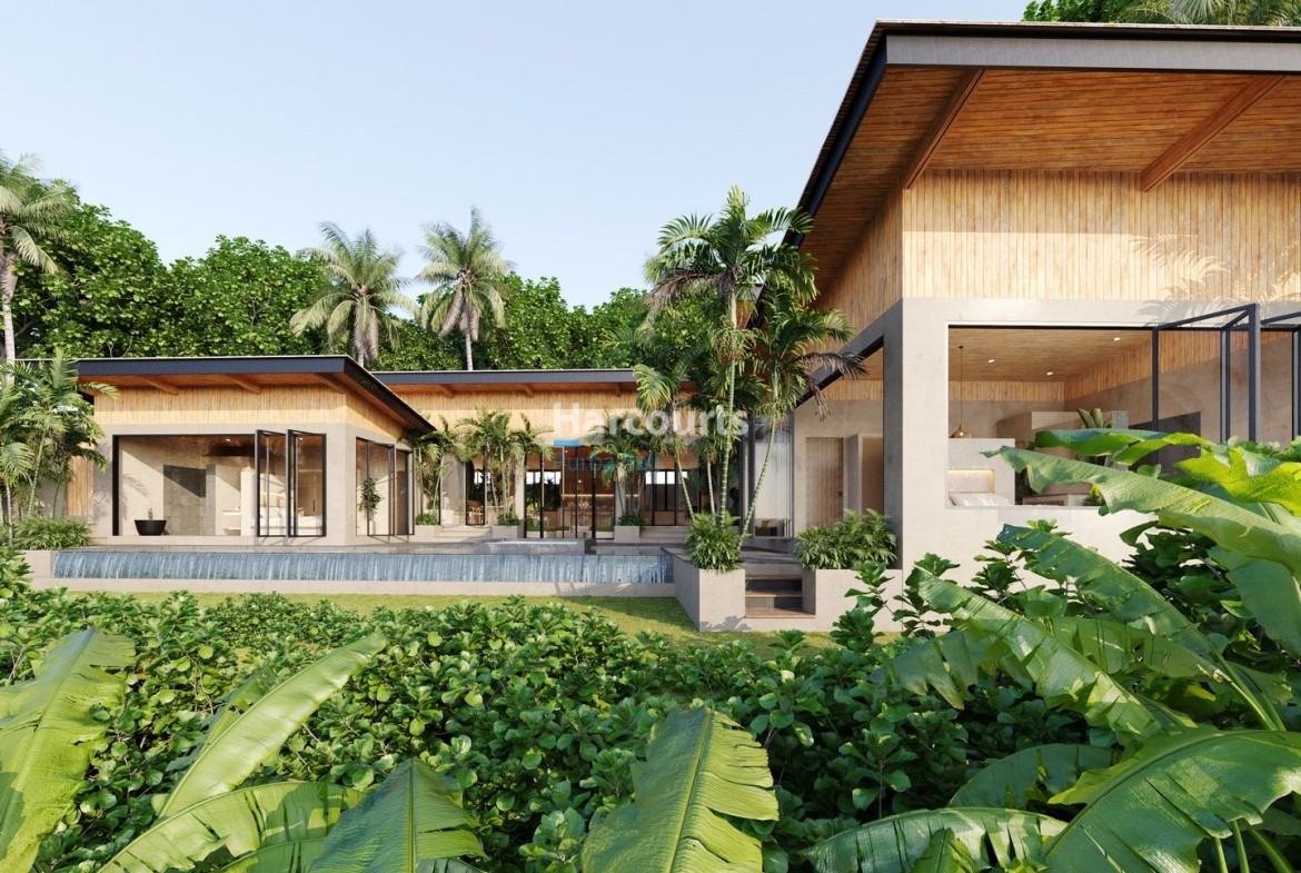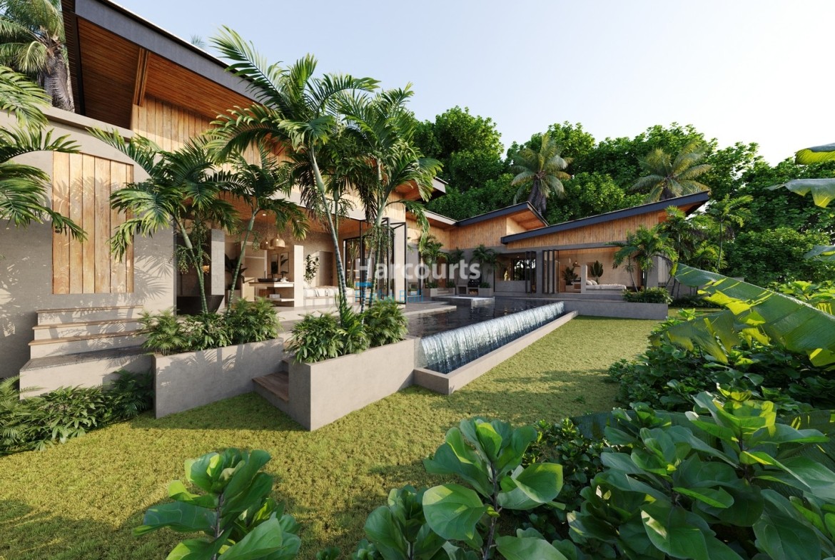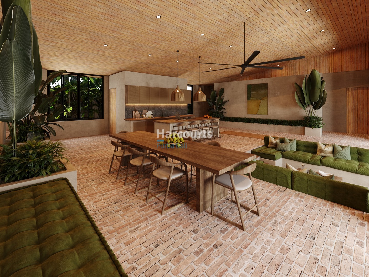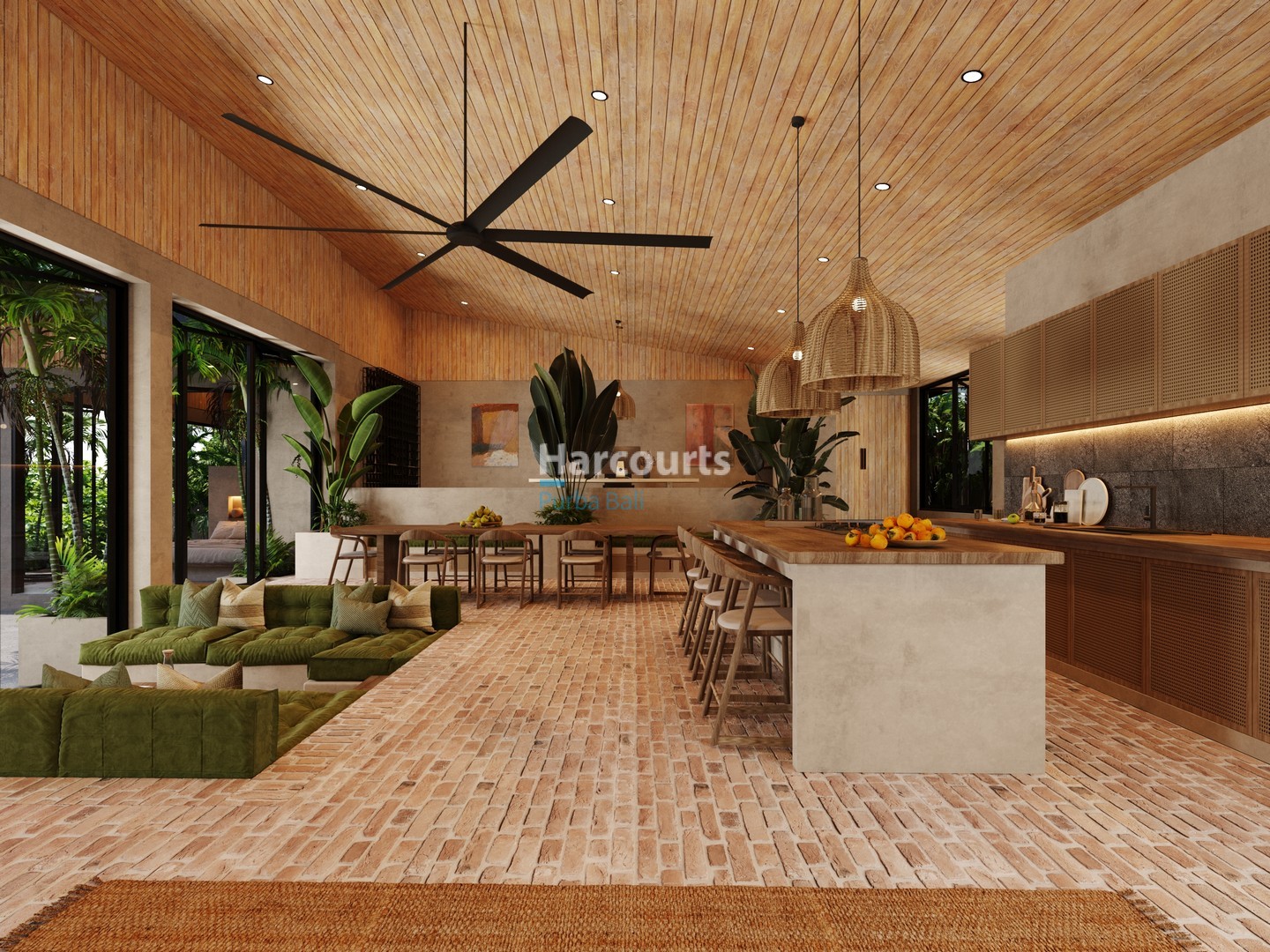 Set on 1,000 m² of land with 450 m² of living space, the villa’s distinctive step-down design creates a natural flow between levels and enhances a sense of openness throughout. The elevated entrance leads to a spacious open-plan pavilion overlooking the tropical gardens and pool, offering seamless indoor-outdoor living.