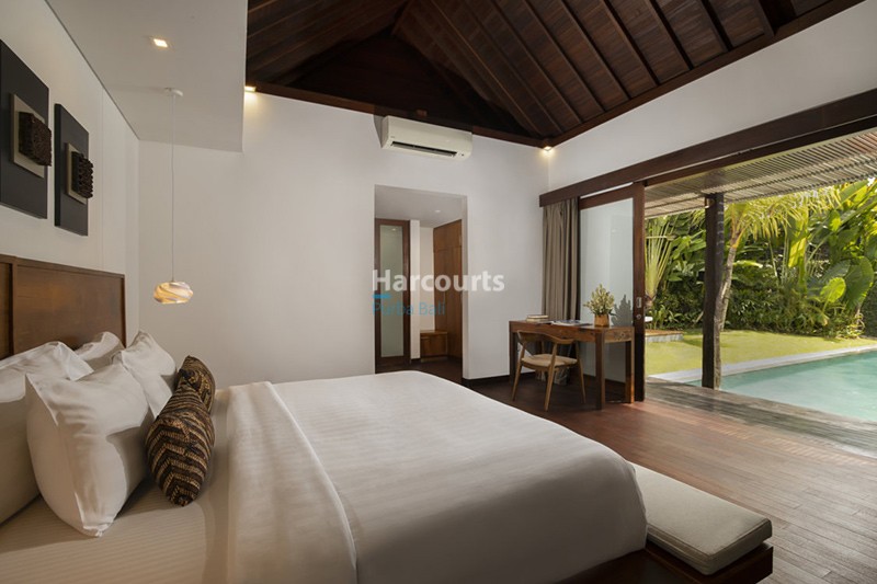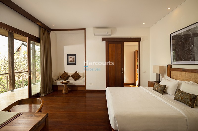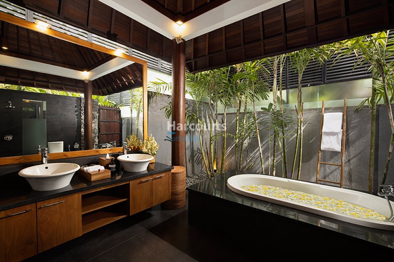 The villa features three spacious bedrooms, each with direct access to the outdoors. The master suite exudes understated luxury with soaring wooden ceilings, polished timber floors, and an en-suite bathroom that includes a freestanding bathtub surrounded by greenery for a spa-like atmosphere. The additional bedrooms are equally inviting, making this villa ideal for families or guests.