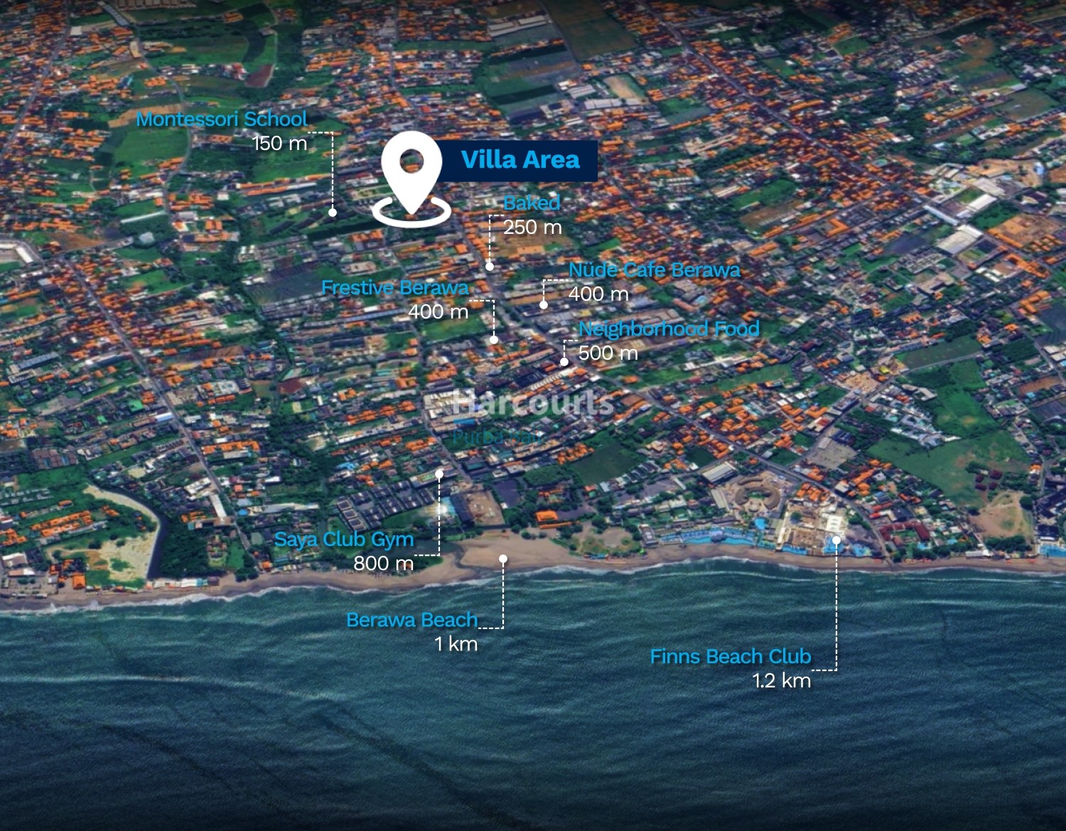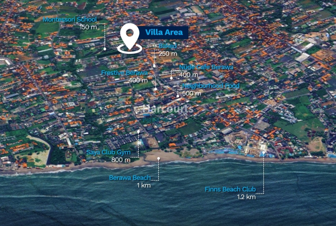 Nearby: Montessori School 150 m, Baked 250 m, Frestive Supermarket 400 m, Nüde Cafe Berawa 400 m, Neighborhood Food 500 m, Saya Club Gym 800 m, Berawa Beach 1 km, Finns Beach Club 1.2 km