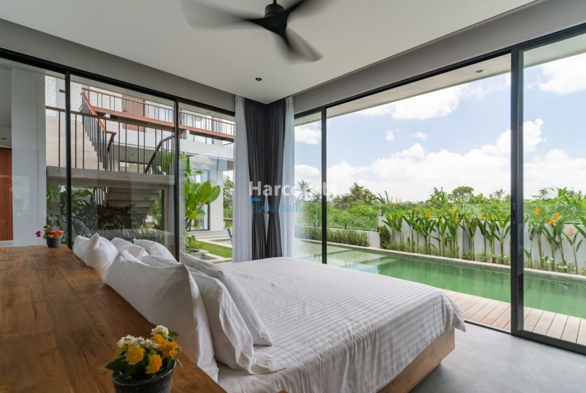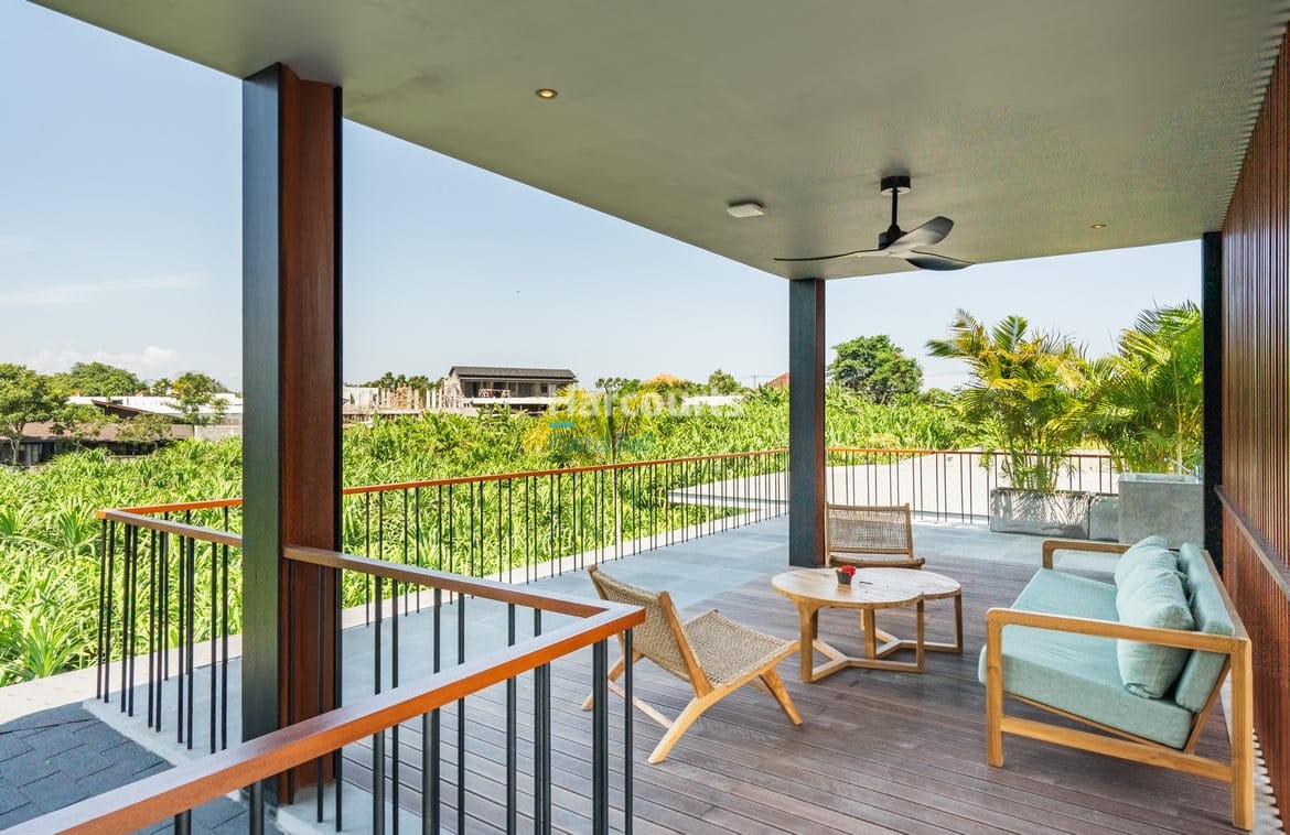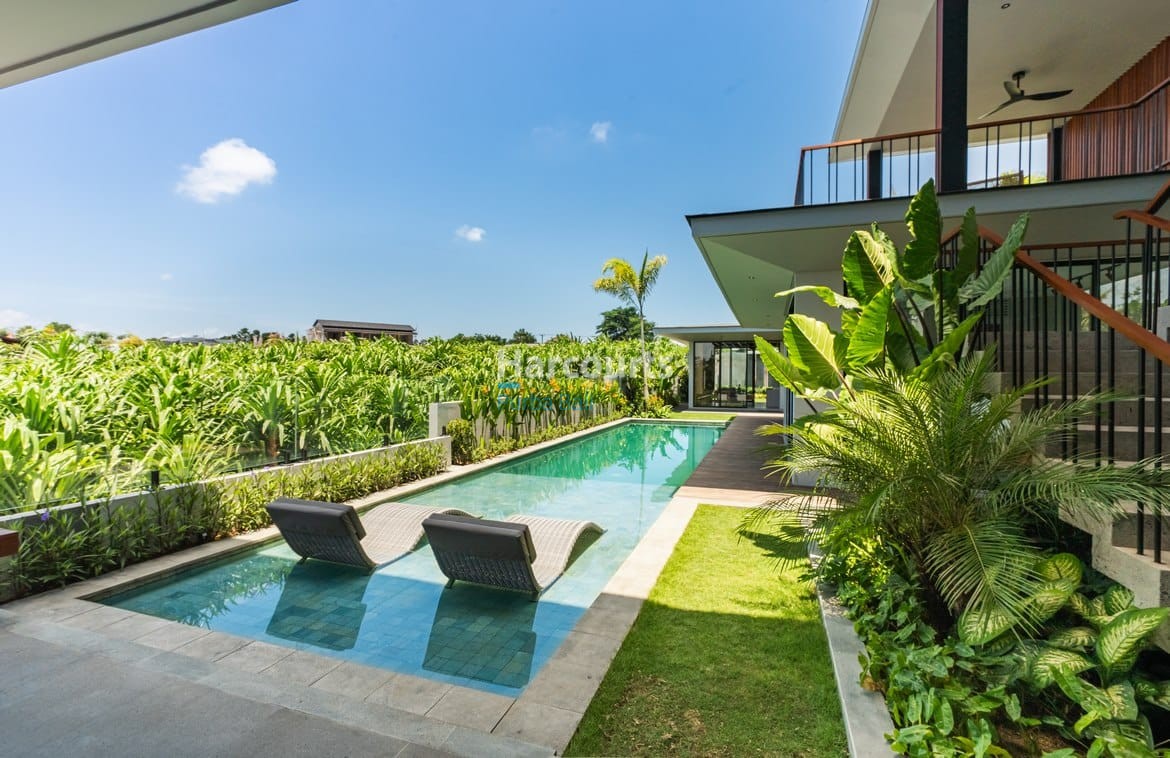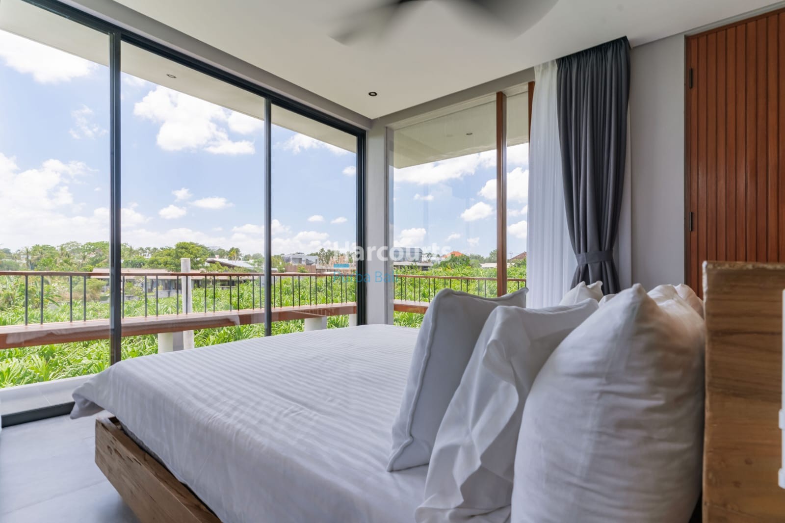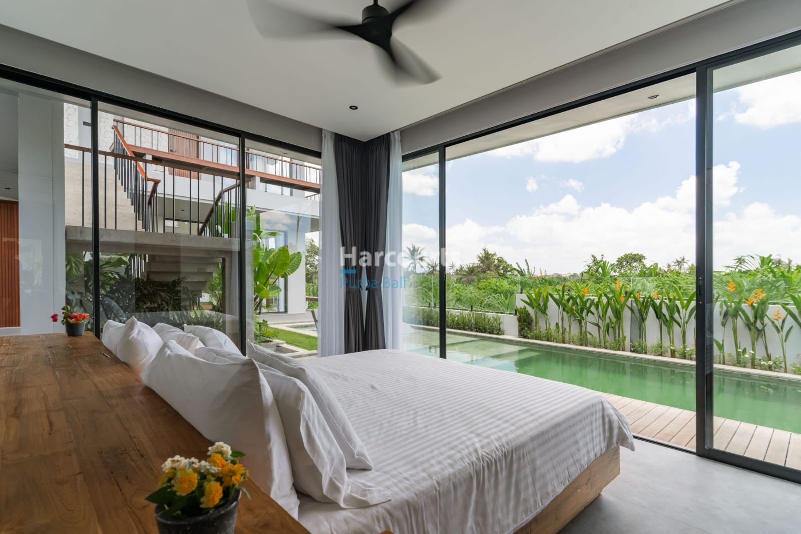 Resting on 490 sqm next to verdant rice fields with views of iconic volcanos on clear days, this modern villa is located in serene Tumbak Bayuh. Nestled in a neighborhood that embraces natural beauty while remaining close to amenities and the vibrant offerings of Canggu, this villa presents an ideal living space for families or professional remote workers.