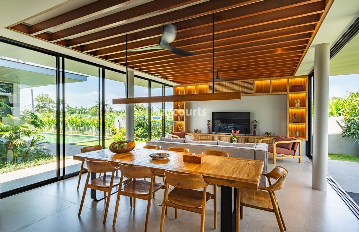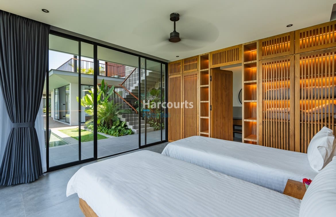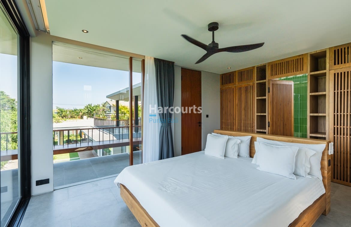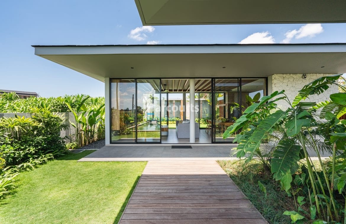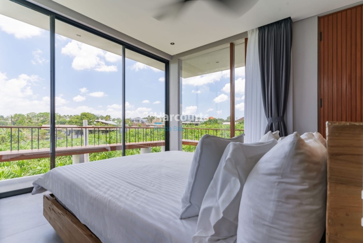 Resting on 490 sqm next to verdant rice fields with views of iconic volcanos on clear days, this modern villa is located in serene Tumbak Bayuh. Nestled in a neighborhood that embraces natural beauty while remaining close to amenities and the vibrant offerings of Canggu, this villa presents an ideal living space for families or professional remote workers.