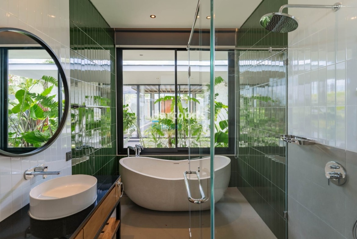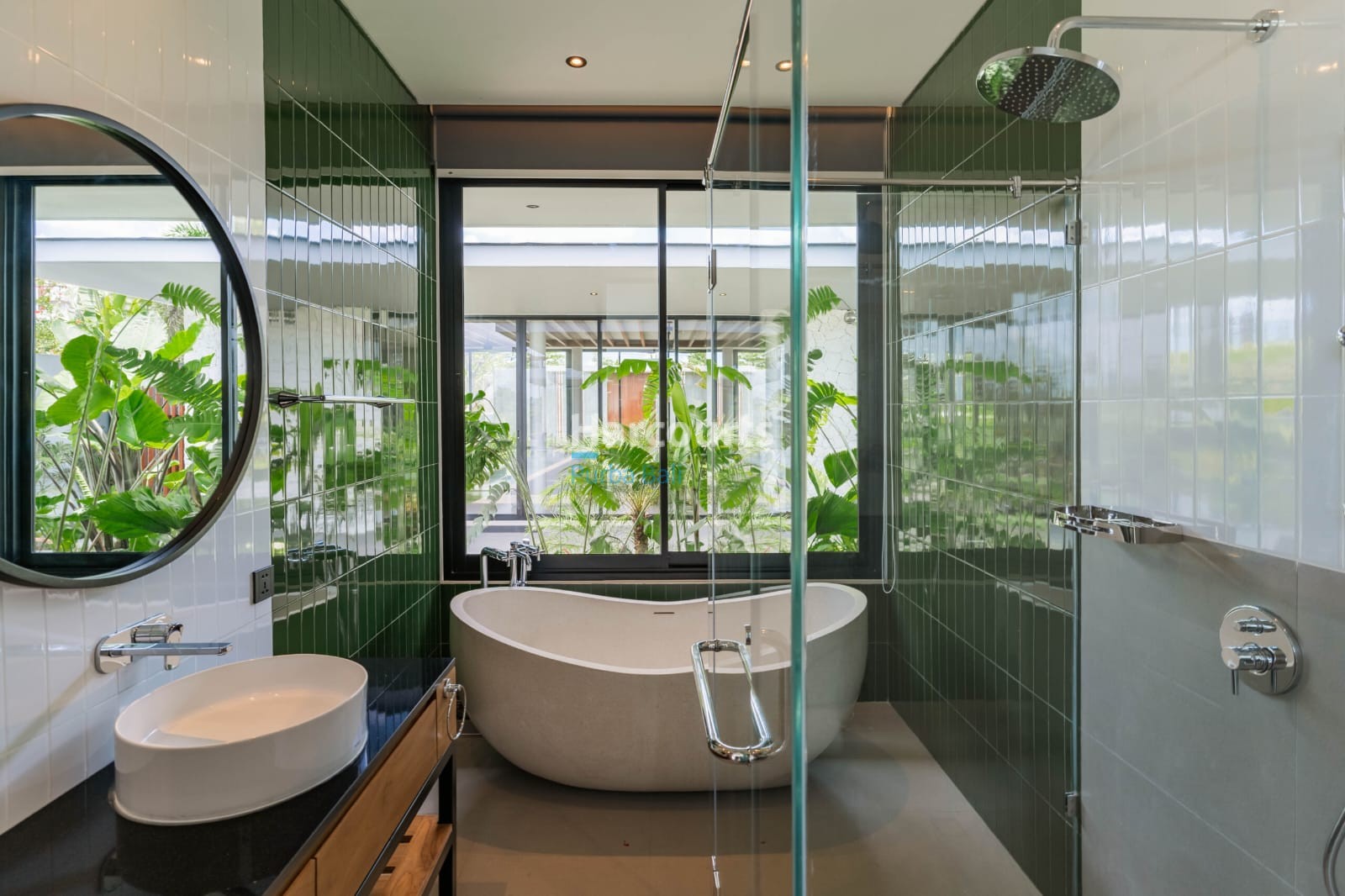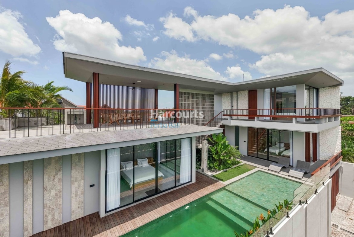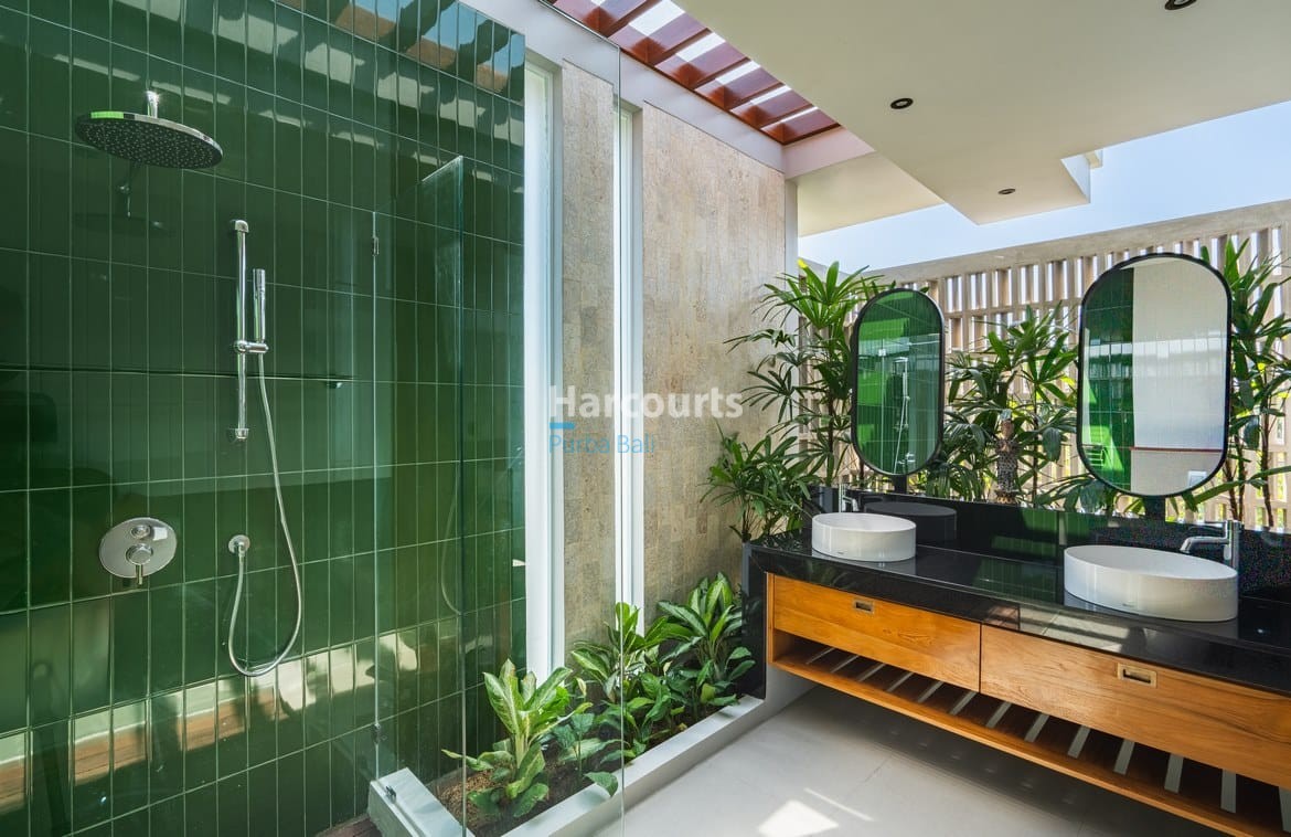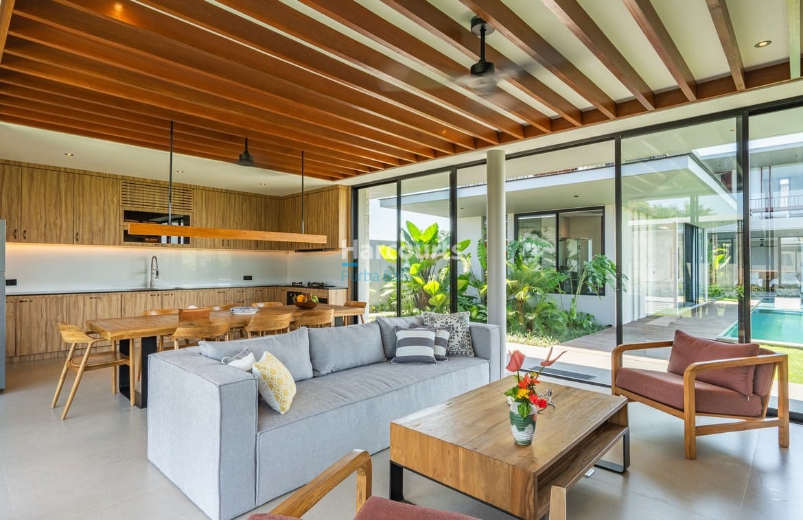 Resting on 490 sqm next to verdant rice fields with views of iconic volcanos on clear days, this modern villa is located in serene Tumbak Bayuh. Nestled in a neighborhood that embraces natural beauty while remaining close to amenities and the vibrant offerings of Canggu, this villa presents an ideal living space for families or professional remote workers.