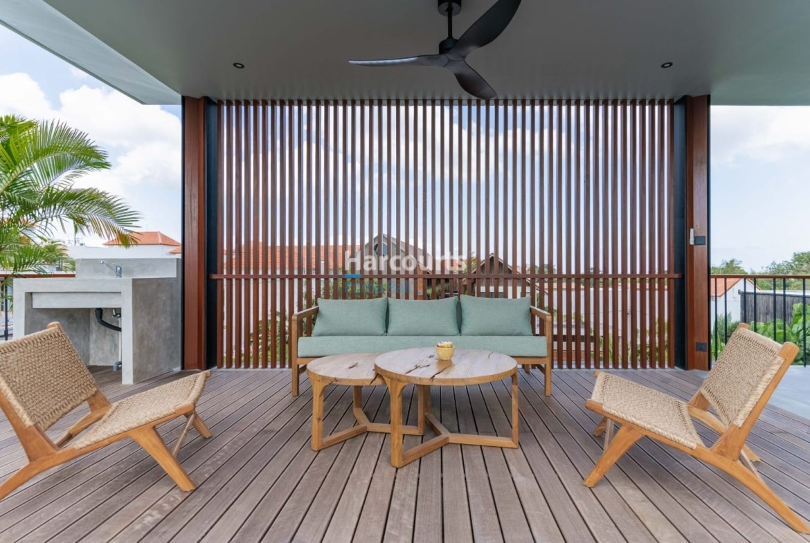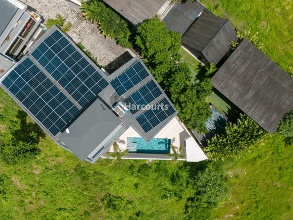 Sold on a lease of 32 years (until 2057), the villa features three well-appointed bedrooms, each with its ensuite bathroom—two bedrooms on the ground floor and one on the upper level. The spacious living area opens to views of the 14-meter swimming pool, complemented by a dining area that seats eight. The designer kitchen is fully equipped, perfect for both everyday meals and entertaining. The first-floor terrace offers another space to relax, complete with comfortable lounges.