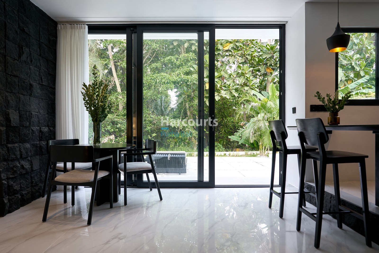 The villa sits on 233 square meters of land, with 168 square meters of living space spread over two floors. The ground level features two bedrooms and two bathrooms, alongside a spacious living room integrated with the kitchen and dining area. Upstairs, a second lounge opens to wide glass windows with lush jungle views, creating a serene retreat for work or relaxation.