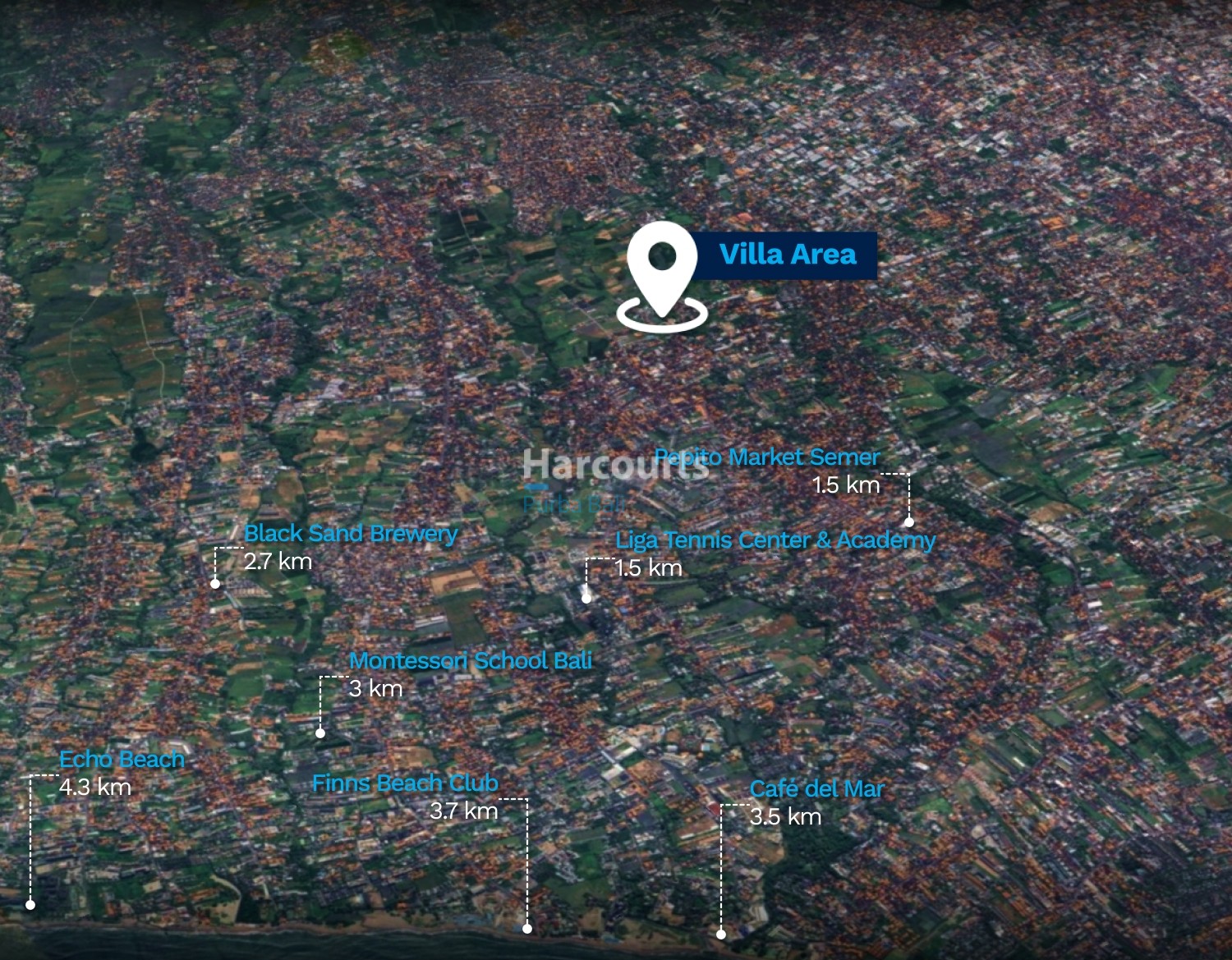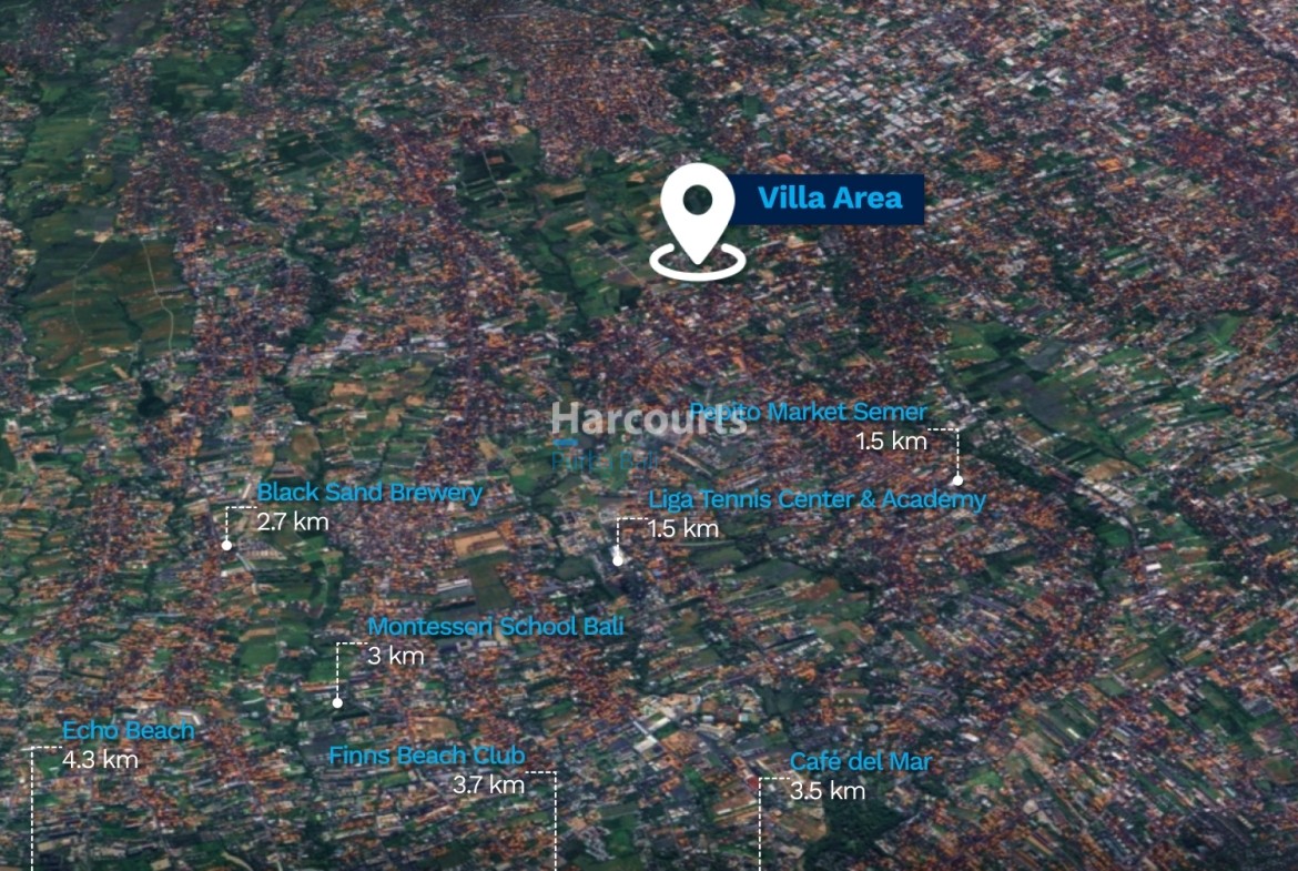 Nearby: Pepito Market Semer 1.5 km, Liga Tennis Center & Academy 1.5 km, Black Sand Brewery 2.7 km, Montessori School Bali 3 km, Café del Mar 3.5 km, Finns Beach Club 3.7 km, Echo Beach 4.3 km.