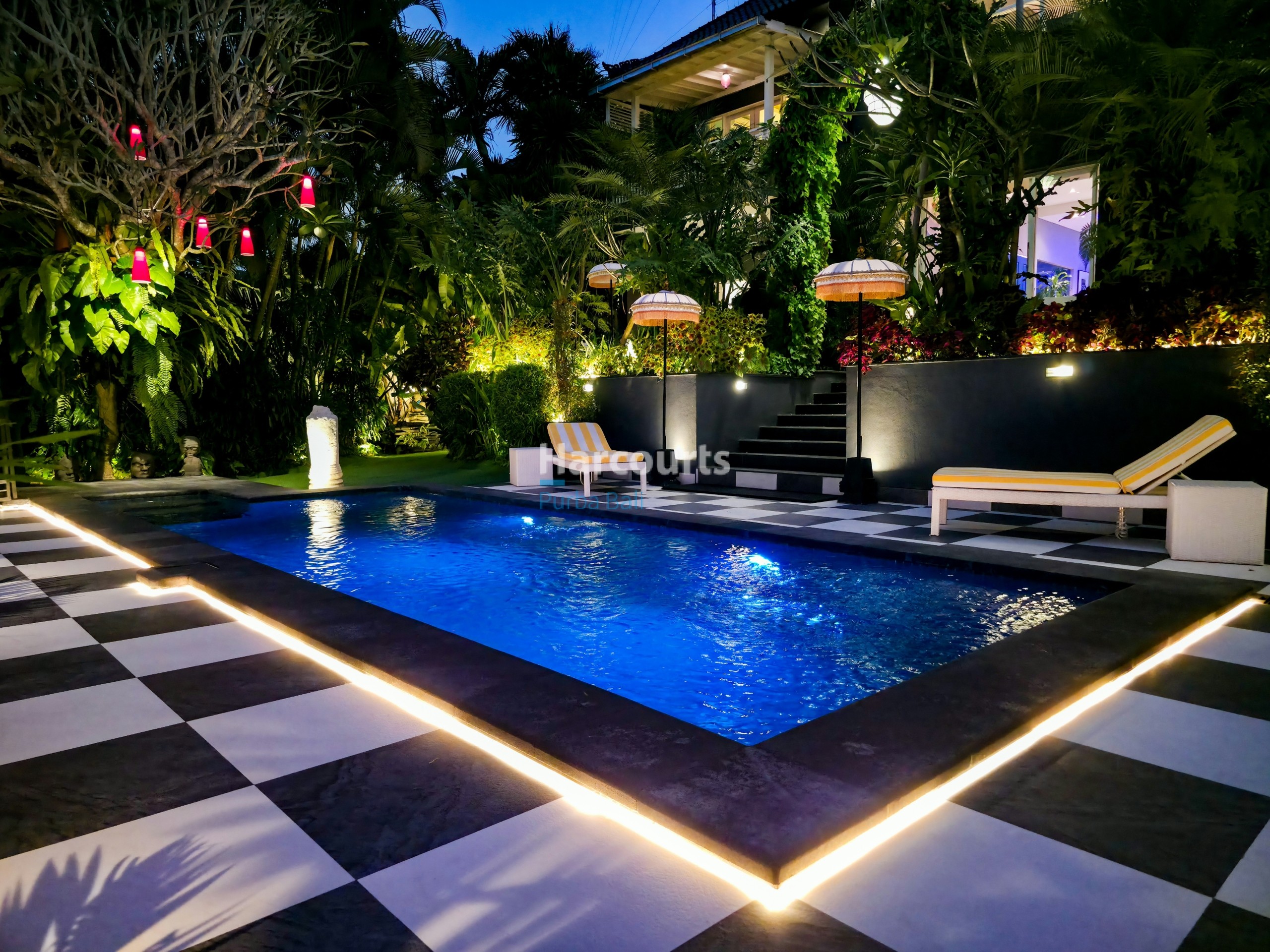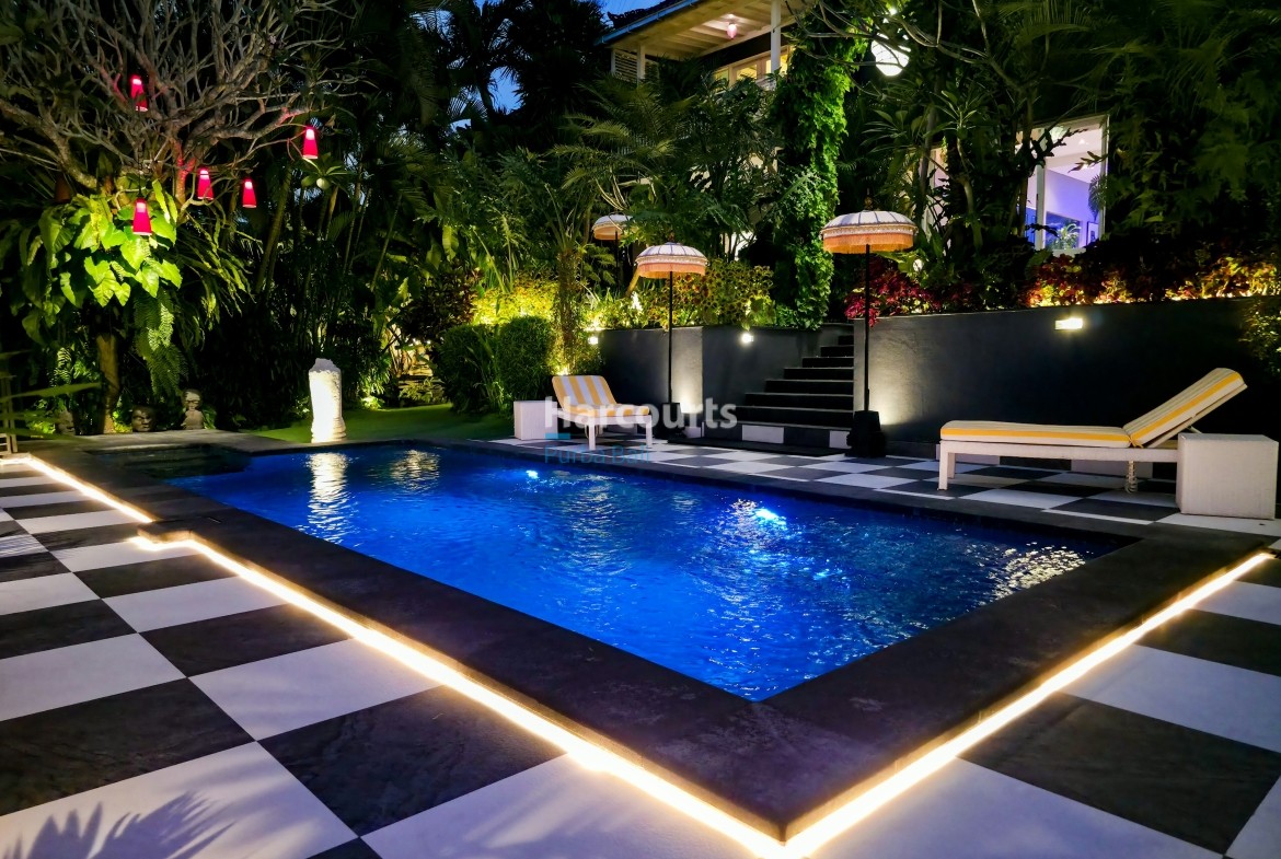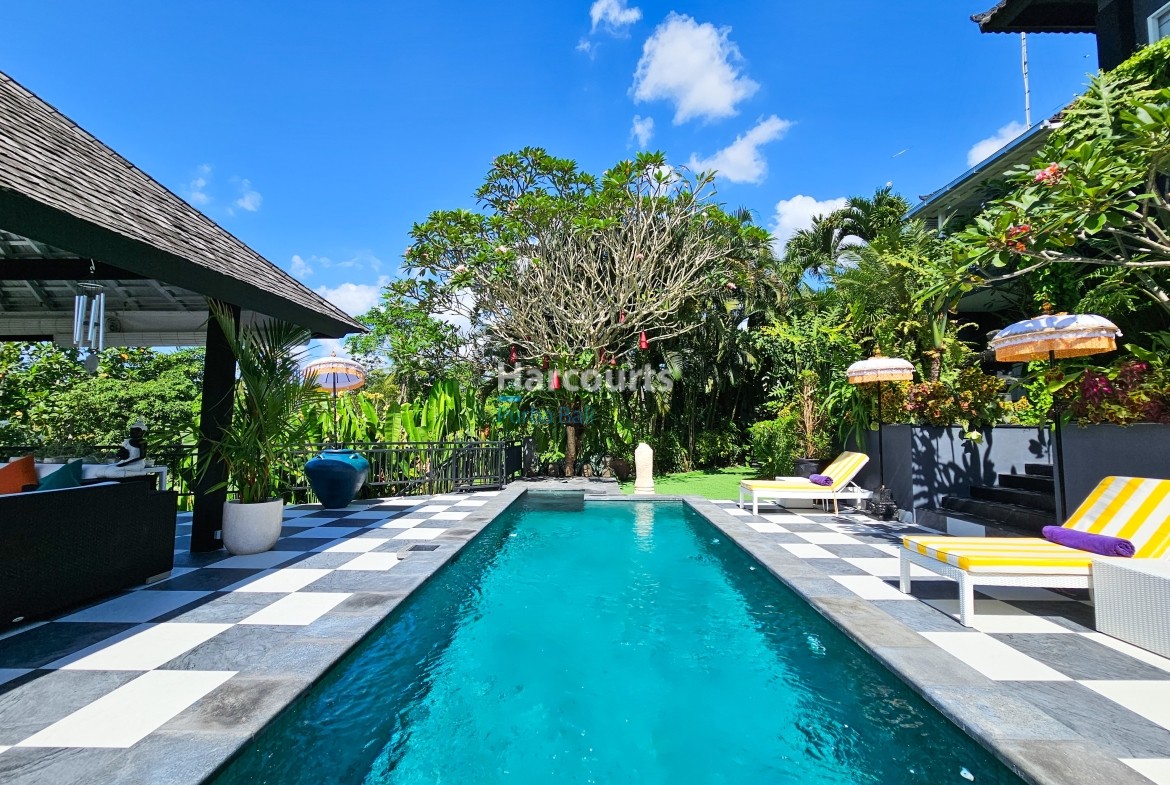 The villa features three generously sized bedrooms, each with ensuite bathrooms equipped with bathtubs, rain showers, and modern amenities. A fully equipped closed kitchen and an enclosed living and dining area create a cozy, private atmosphere for entertaining or family living. The property’s lush tropical garden is complemented by a stunning rectangular pool (9 x 4 meters), perfect for relaxing while enjoying the serene surroundings.