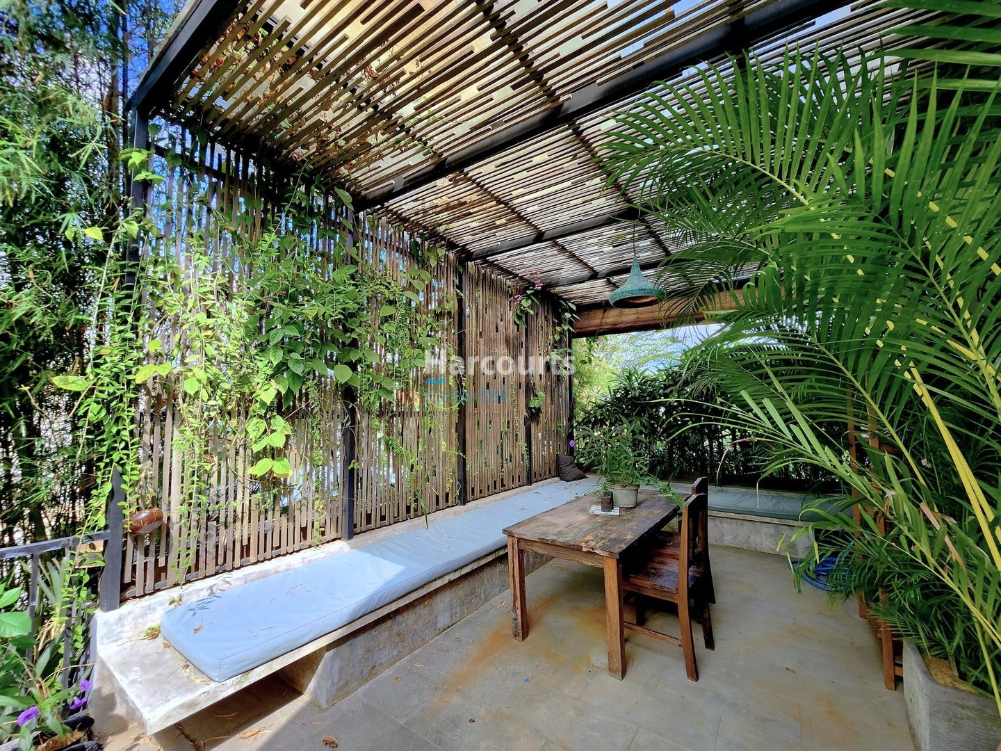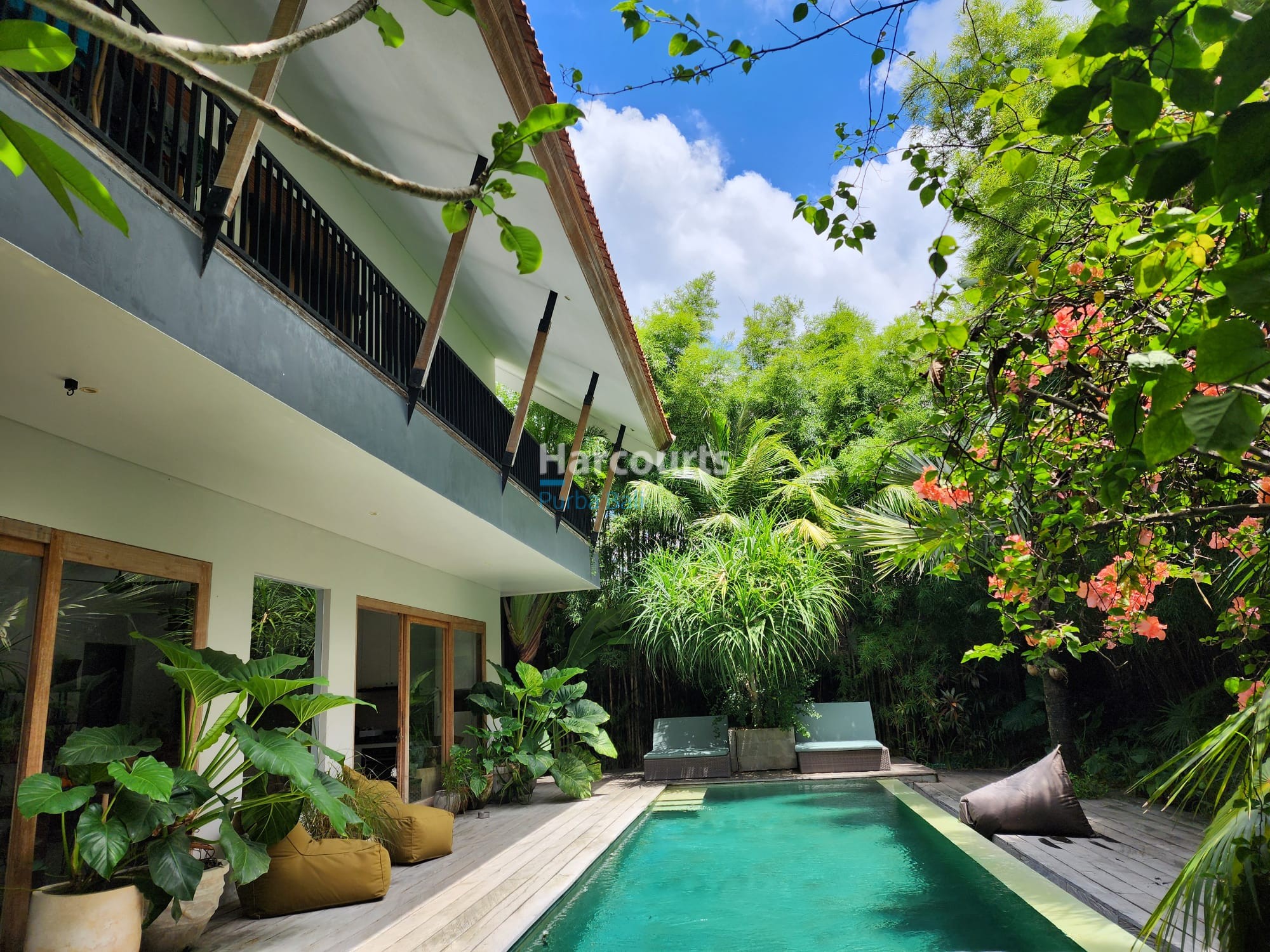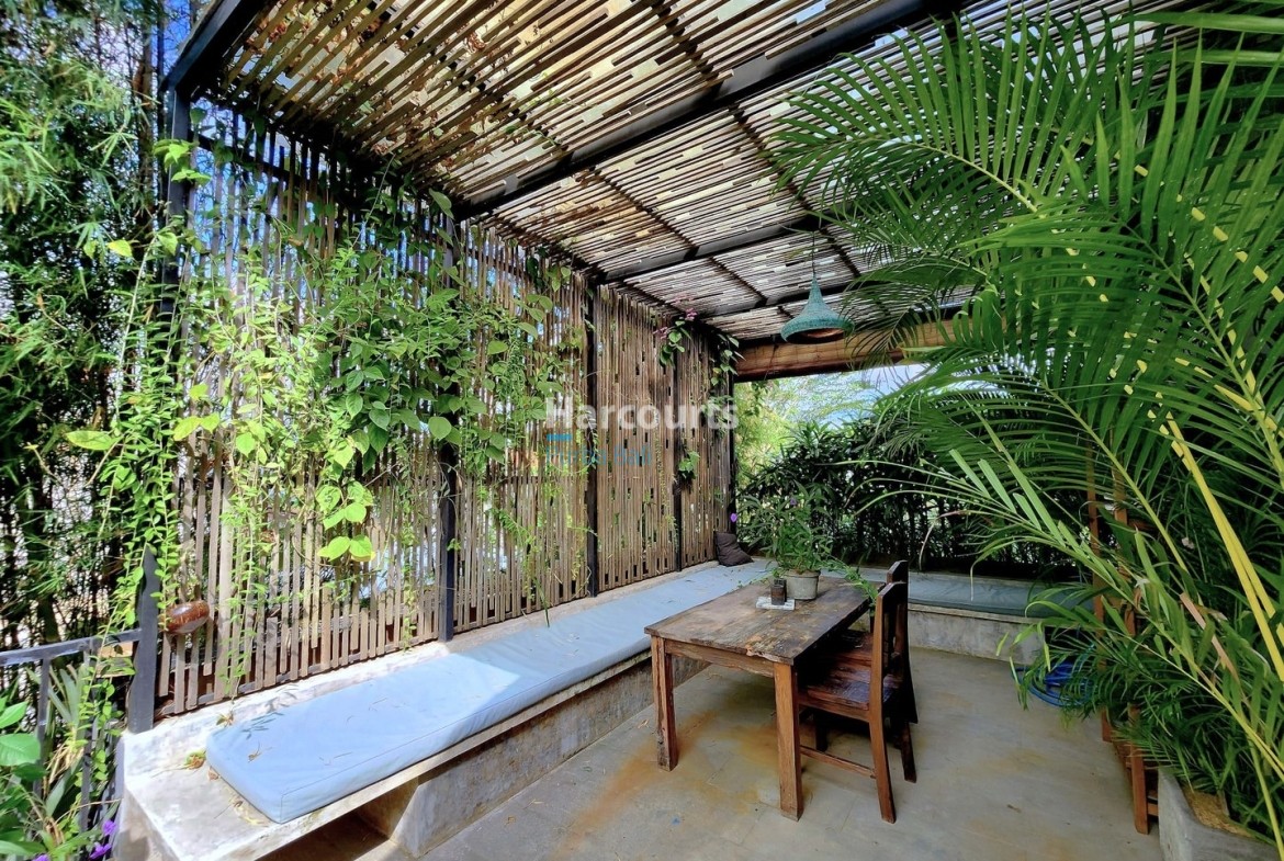 Outdoors, the property feels like a private retreat — a long, narrow pool runs alongside timber decking surrounded by lush palms and vines, while a covered lounge with a bamboo roof, wooden slats and built-in cushioned bench creates shaded seating for relaxed afternoons. The two-story façade and balcony overlook the garden, and a secure parking area for two cars plus a full perimeter wall complete the sense of secluded comfort.
