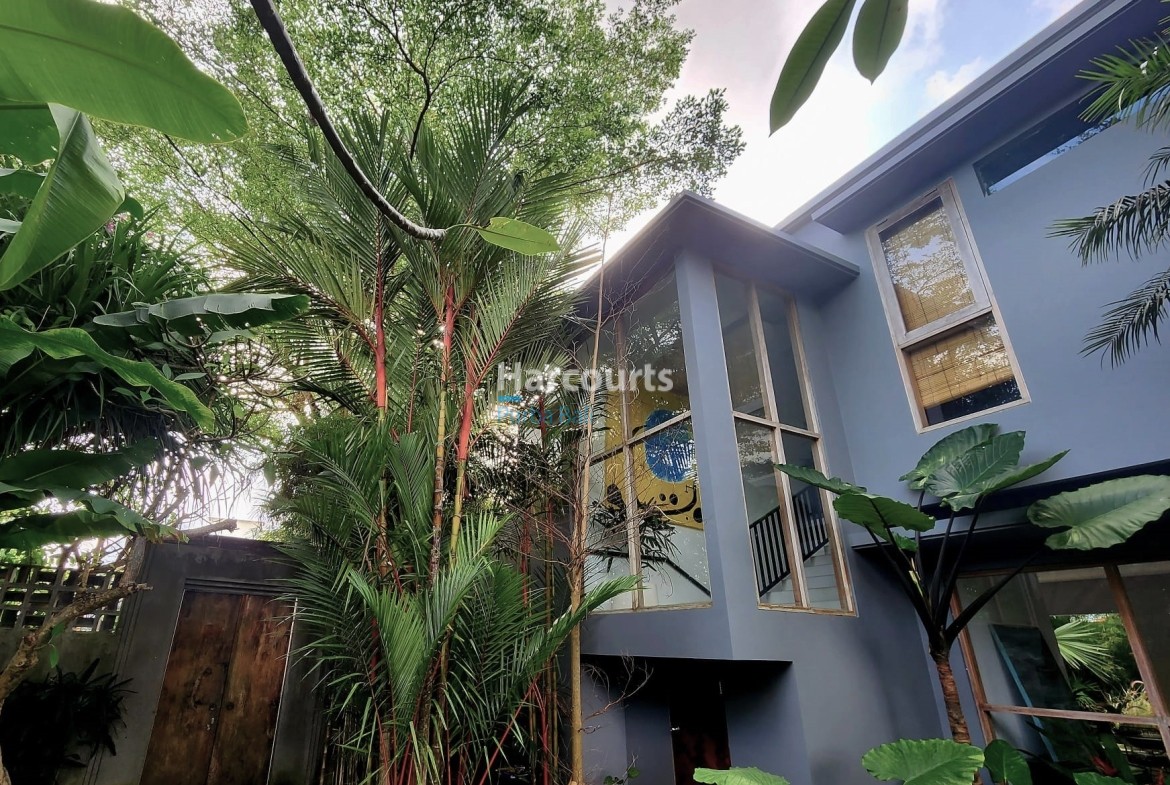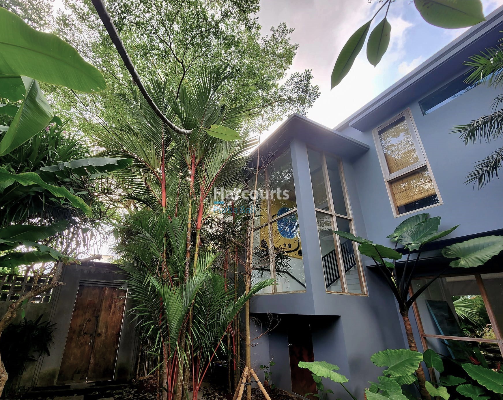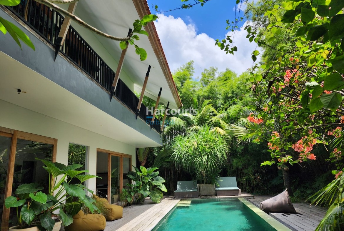 Outdoors, the property feels like a private retreat — a long, narrow pool runs alongside timber decking surrounded by lush palms and vines, while a covered lounge with a bamboo roof, wooden slats and built-in cushioned bench creates shaded seating for relaxed afternoons. The two-story façade and balcony overlook the garden, and a secure parking area for two cars plus a full perimeter wall complete the sense of secluded comfort.