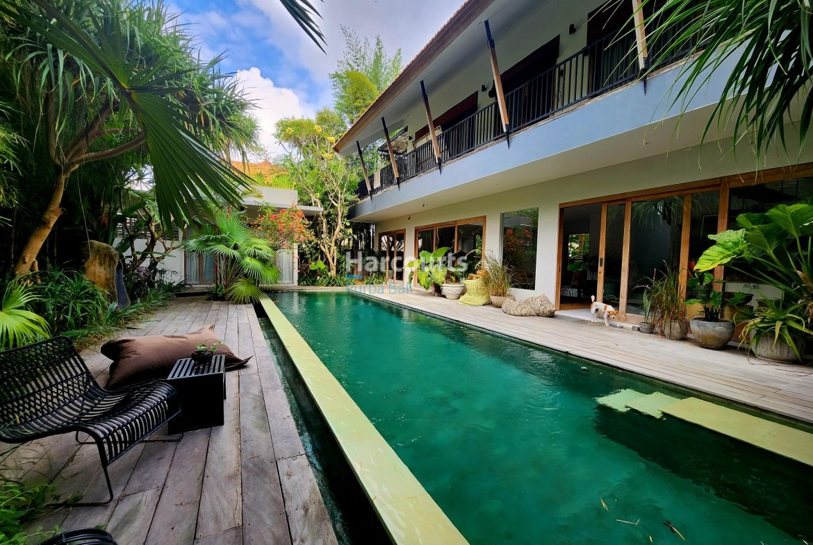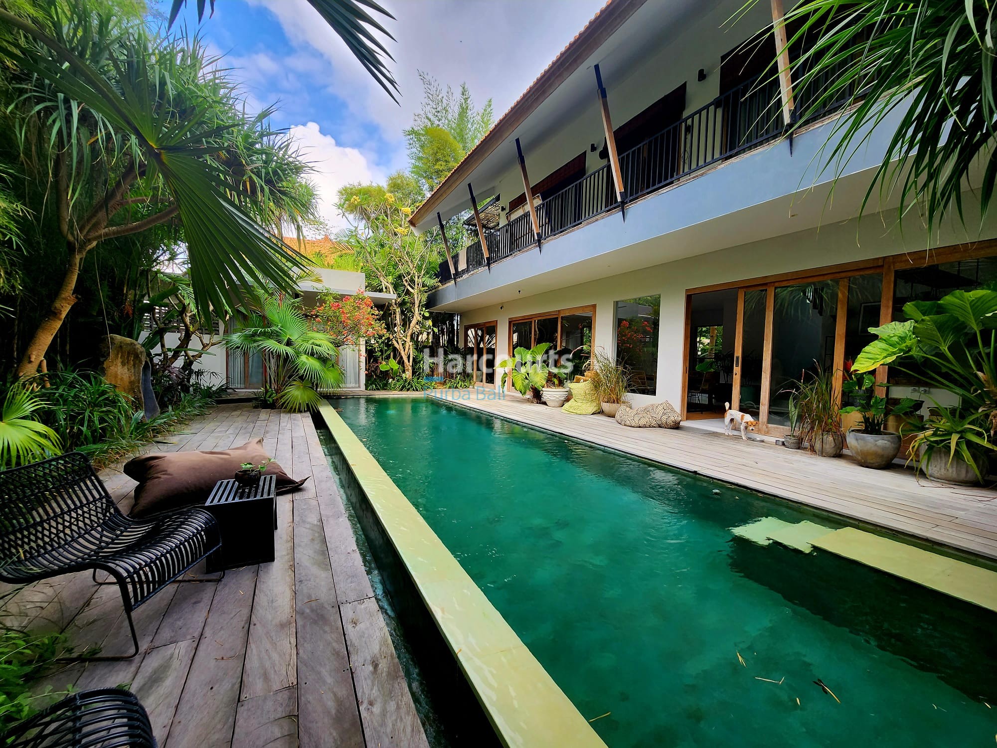 Located in the coveted Nelayan pocket of Canggu, and only 700m to the beach via a beautiful street – ocean, yoga, coffees, massages all within walking distance. This fully furnished 5-bedroom, 5-bathroom villa on Leasehold (Hak Sewa) — 24 years remaining offers a rare combination of privacy, proximity to the beach and an exceptional 15‑metre swimming pool as its centerpiece. Built in 2015 and set across a generous 6‑are (~600 m²) plot with a 300 m² build, the two-story layout is designed for flexible family living or a high-performing rental asset. The property features a main villa with two large bedrooms , a separate guest house offering a super cozy bedroom and a half outdoor bathroom , and flexible room spaces including a small mini bedroom (or yoga room) and a large, dedicated office.
