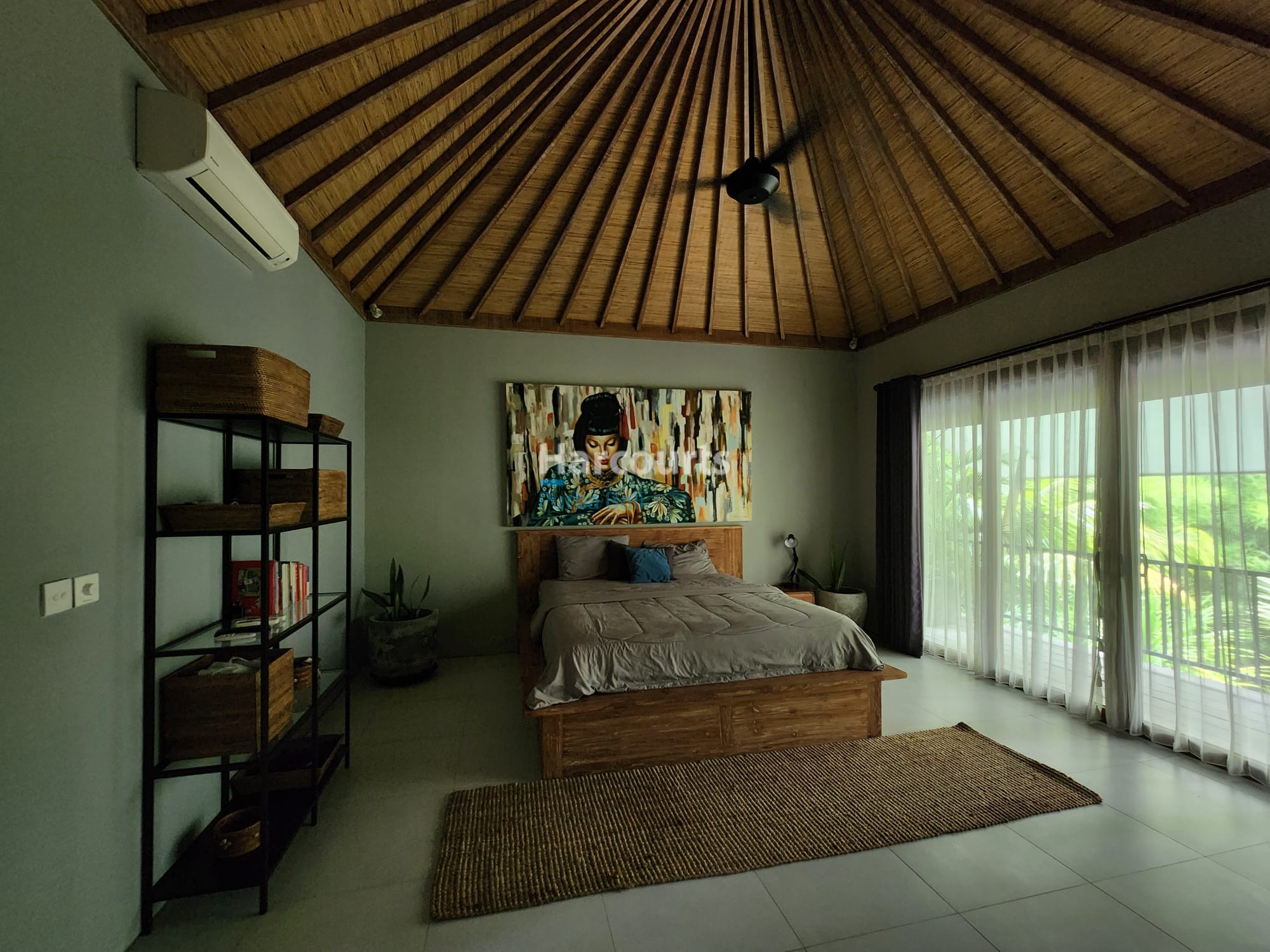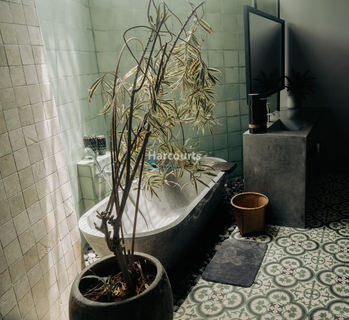 Interiors balance tropical textures with contemporary finishes: a principal room features a high thatched ceiling with exposed wooden beams, floor‑to‑ceiling windows dressed in sheer curtains and curated details such as a colourful wall artwork. A light, contemporary bathroom anchors the scheme with a freestanding curved bathtub, concrete vanity and patterned green-and-white floor tiles; abundant storage and large glass doors ensure a bright, natural flow between rooms and garden.