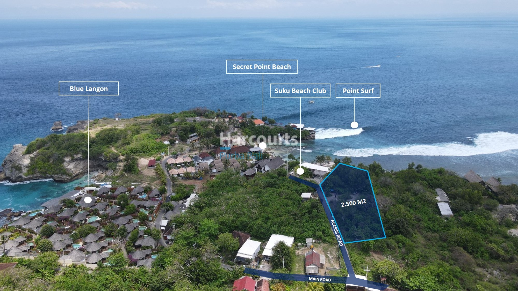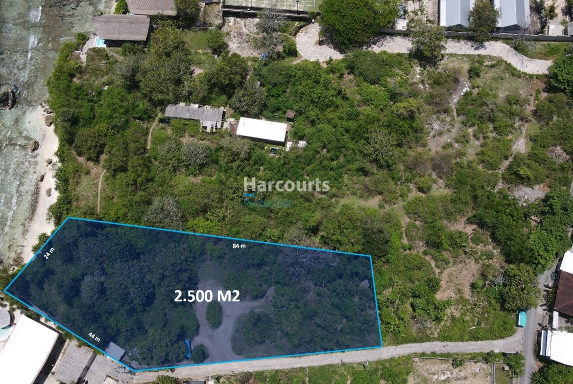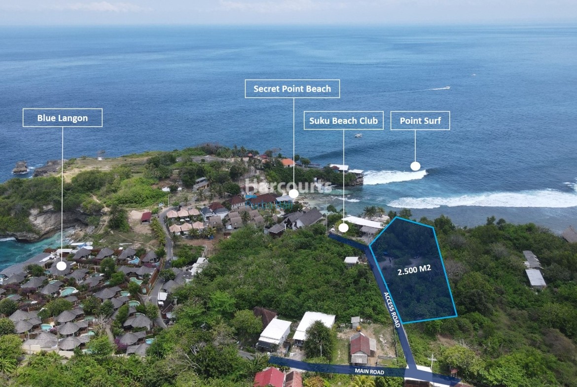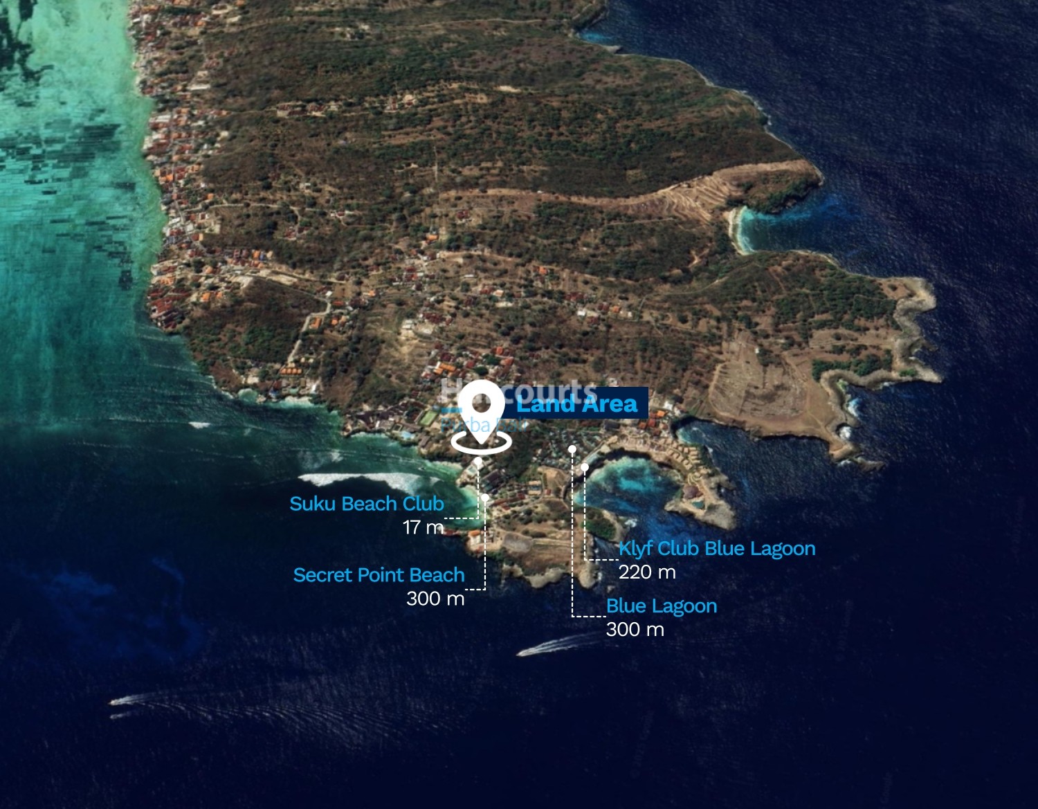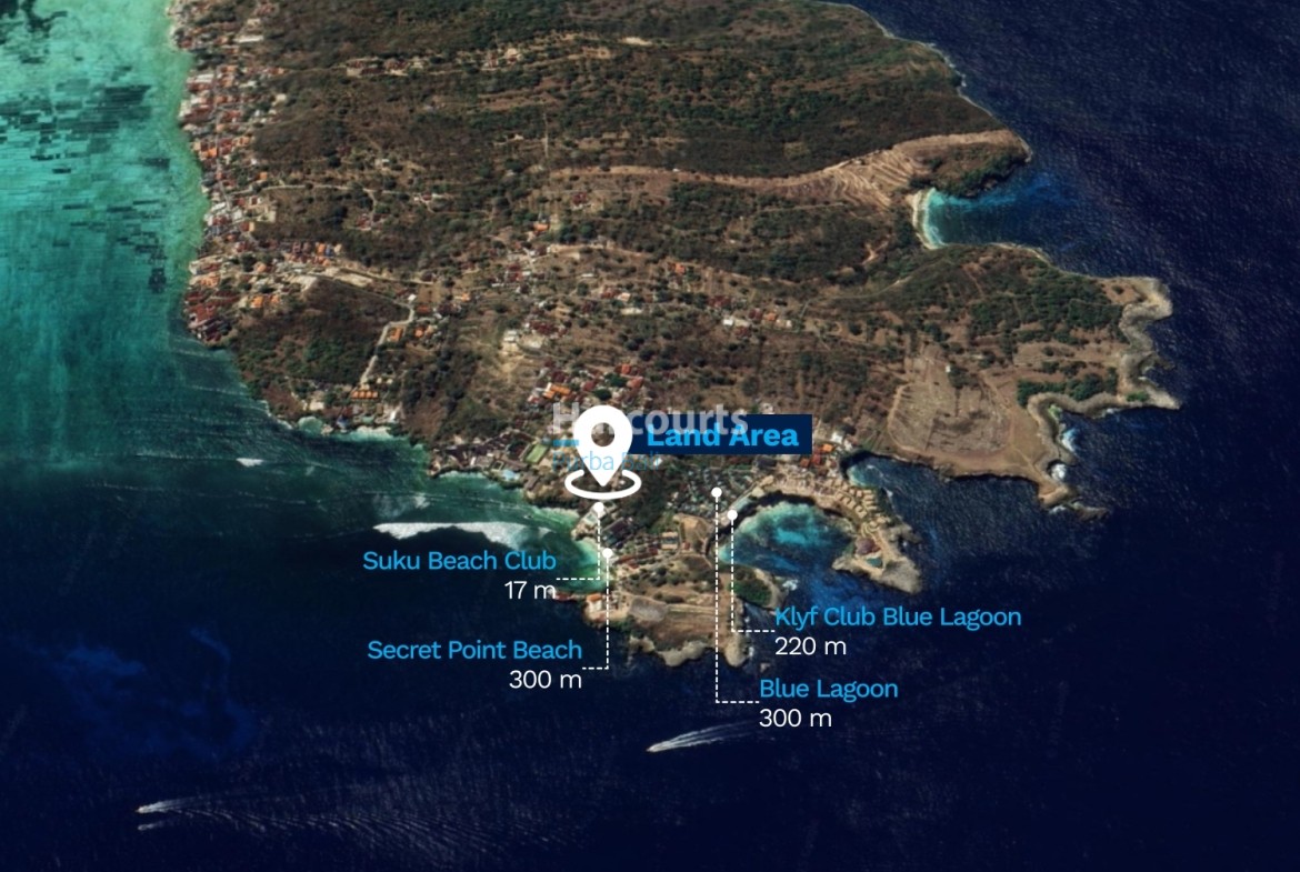 From the land you will look over clear blue water, a rocky shoreline with sandy pockets and boats gently moored offshore, while rolling green hills frame the distant horizon. The plot is partially tree-covered and surrounded by lush tropical vegetation, with a cluster of resort-style buildings and traditional cottages nearby; well-known local points such as Secret Point Beach, Point Surf, Suku Beach Club and Blue Langon sit within the neighbourhood.