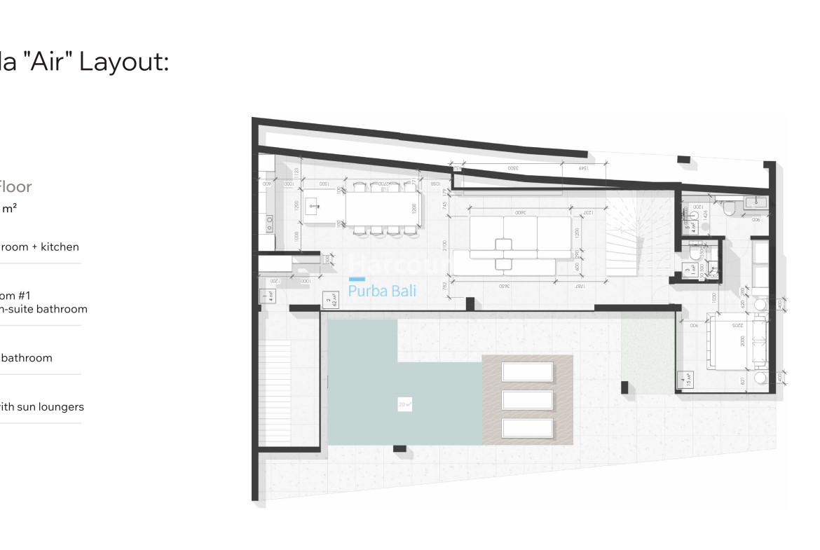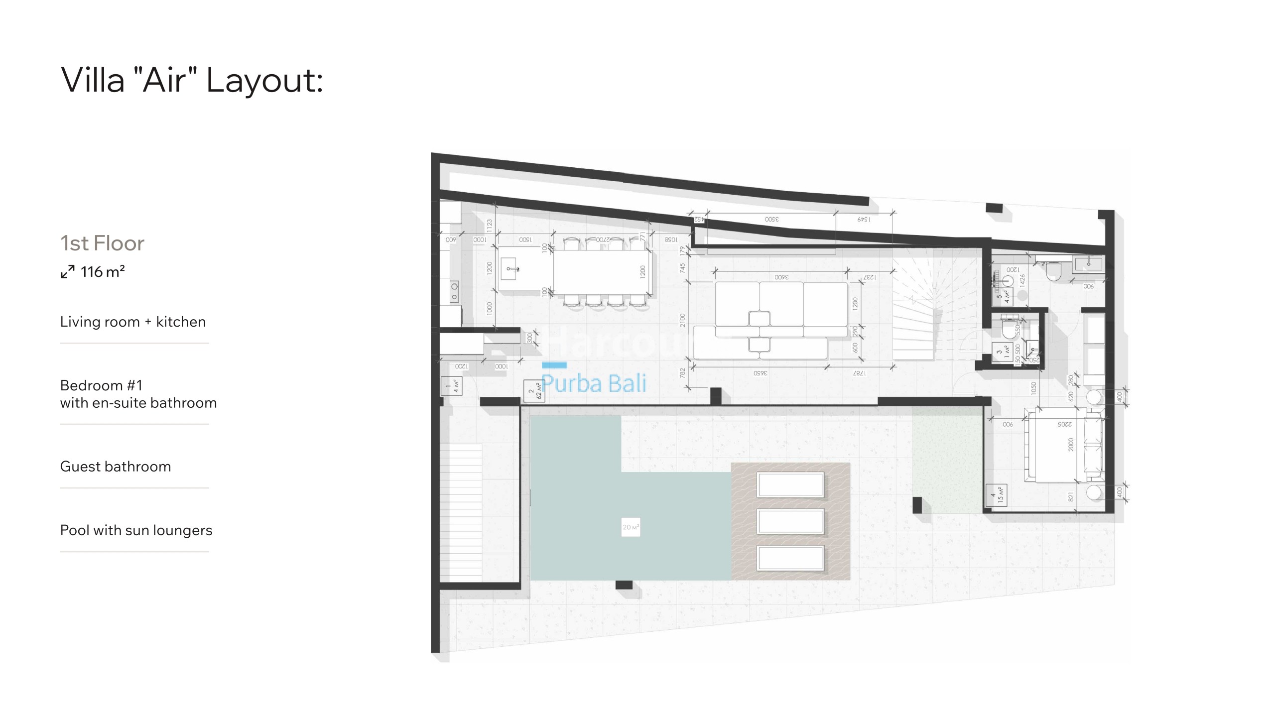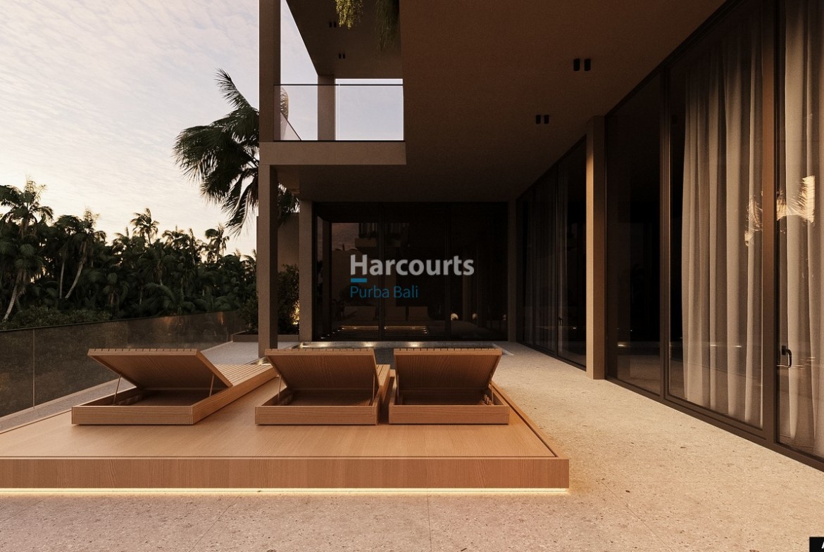 Outdoors, a 20 m² swimming pool is set into a private terrace furnished with lounge chairs and an al fresco dining area, while an upper-level balcony with glass balustrades provides the perfect spot for sunsets and sea breezes. Lush landscaping and high perimeter walls ensure privacy, and the villa is further distinguished by secure underground parking—an uncommon feature in Bali.