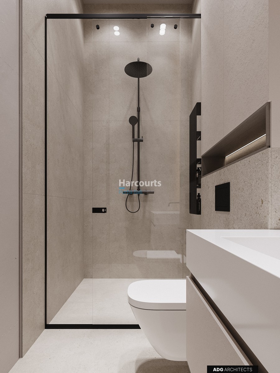 The interior palette emphasizes balance and sophistication, with light wood flooring, dark cabinetry, and expansive glazing that floods the home with natural light. The kitchen is centered around a minimalist stone island with black fittings and upholstered stools, illuminated by sculptural pendant lighting. Living areas are styled with a neutral sectional sofa, a wall-mounted TV, and sheer full-height curtains that frame the views while adding softness to the space. Bedrooms continue the theme with upholstered beds, textured headboards, and compact workspaces, designed to combine comfort and function.