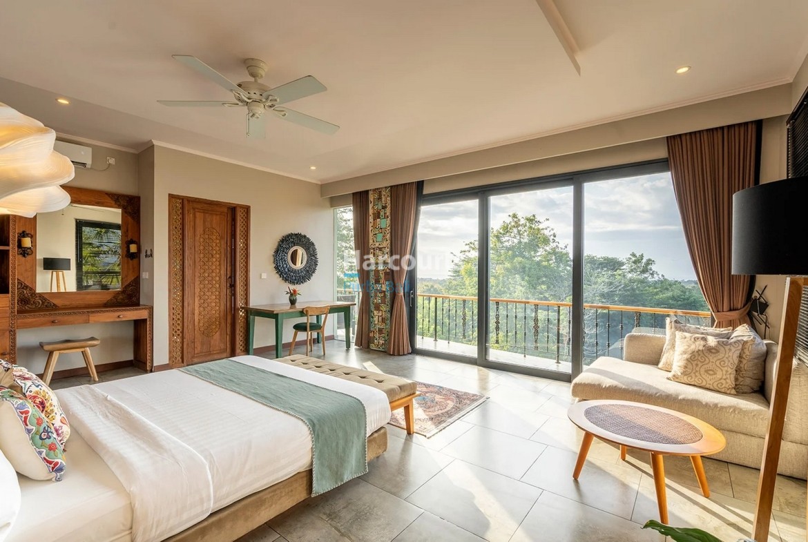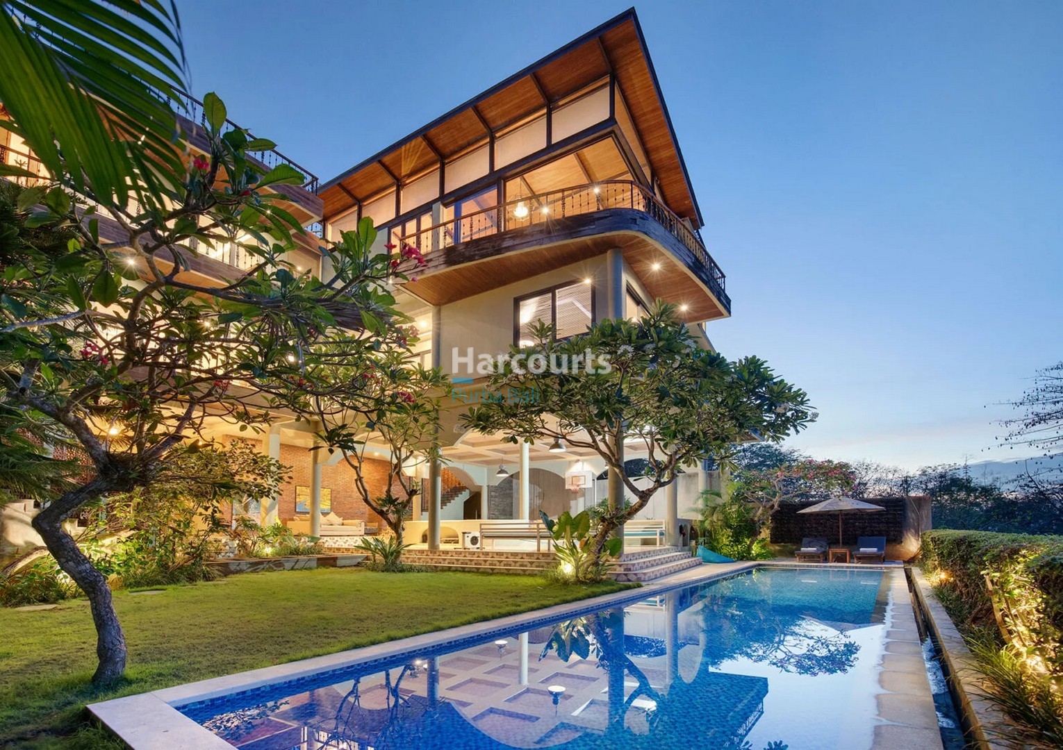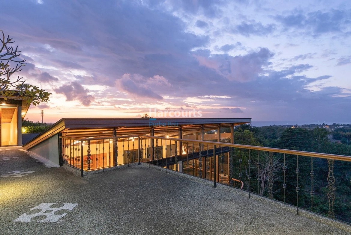 Built in 2016, this contemporary FREEHOLD villa has amazing ocean views towards Jimbaran Bay and beyond. Covering 1400 sqm of land and 900 sqm of floor space (over 3 levels), the north facing villa consists of 4 spacious ensuite bedrooms all with balconies to take in the views, an open/closed living room including dining area and modern kitchen with an island.
