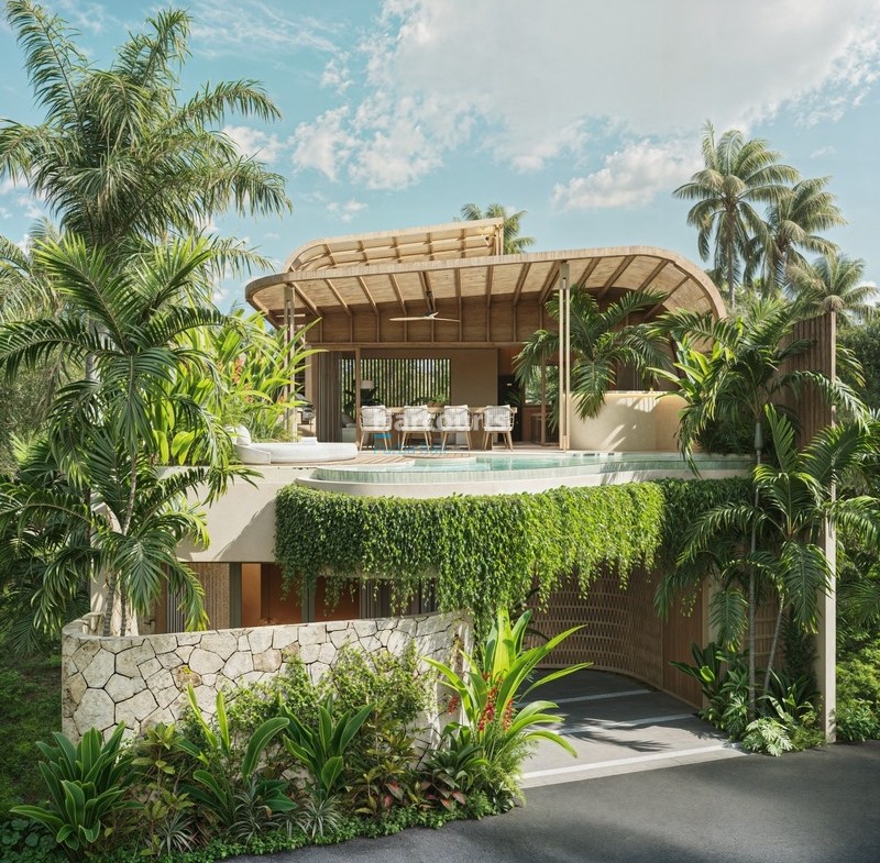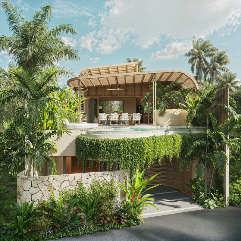 Outdoor living is integral: the first floor extends to an outdoor lounge with an infinity edge pool, integrated dining area and built‑in BBQ, while a lower level stone wall and lush tropical landscaping of palms and flowering plants create privacy and a sense of seclusion. A small circular pool and deck areas are woven into the design, and the rooftop pergola pavilion offers panoramic sunset vantage points. The property sits on 1.33 are (~134 m²) of land and includes private parking.