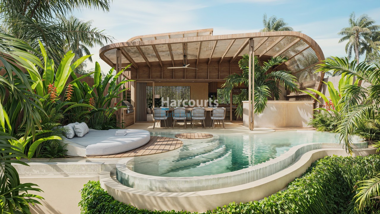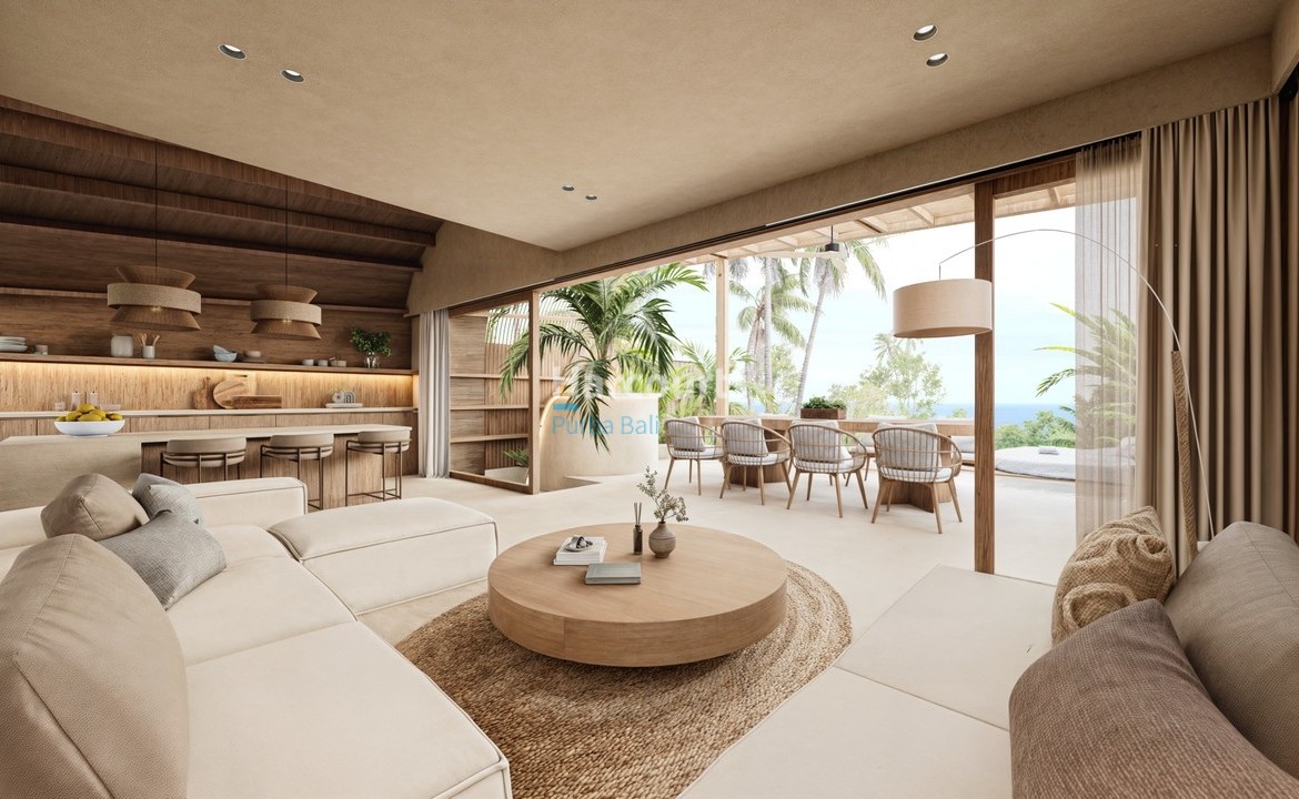 The interior flows effortlessly from a sunken lounge to an open-plan dining area and modern kitchen, where a long counter with bar stools, pendant lighting and large sliding glass doors frame the view. Warm natural materials and timber detailing—including a subtly curved wooden roof—sit against a neutral beige palette, recessed lighting and a light-coloured sectional sofa with a round wooden coffee table, creating an inviting, relaxed atmosphere. The ground floor provides three tranquil en‑suite bedrooms, two generous master suites with private bathtubs, and direct access to small private gardens.