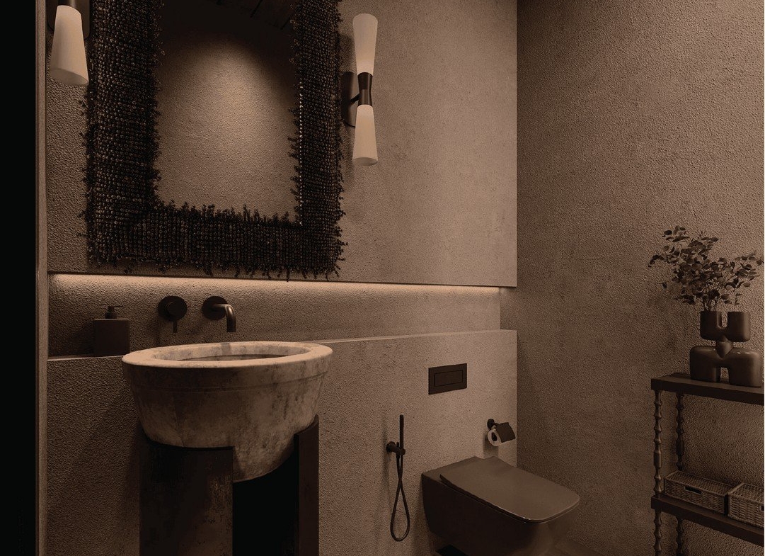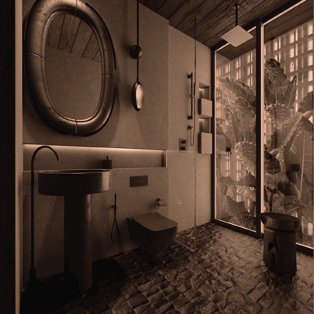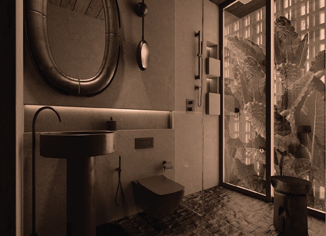 Both bathrooms continue the restrained, tactile palette: textured stone tiles underfoot, a round stone basin on a dark pedestal, round metallic mirrors, wall-mounted toilets and rainfall showerheads framed by large glass panels that invite views of the surrounding greenery. Ambient wall sconces and a timber ceiling in one bathroom reinforce the villa’s refined, natural materiality.