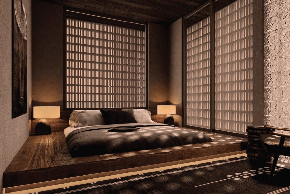 Inside, the open-plan layout is enlivened by large patterned windows that filter soft natural light across warm, textured walls and timber accents. The living area features a low wooden console beneath a wall-mounted black television, an L-shaped sofa dressed with decorative cushions and a textured pendant overhead, while a wooden staircase with floating steps leads to the upper loft. The bedroom presents a low wooden platform bed with layered bedding, bedside lamps and a calm seating nook—subtle touches such as artwork and a decorative niche add considered warmth.