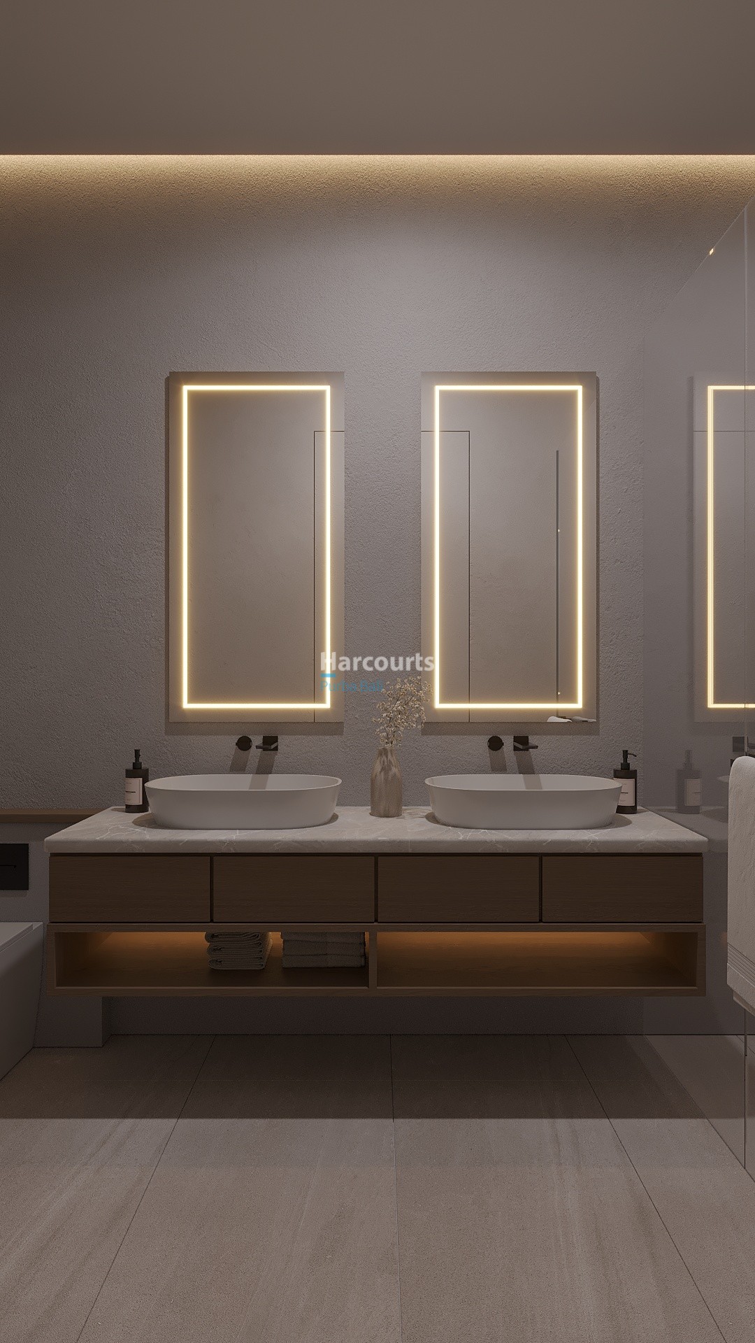 Arranged over 180 m² across two floors plus a rooftop terrace, the villa is offered fully furnished and designed for a balance of indoor comfort and outdoor leisure. The enclosed, air-conditioned living and dining area flows into a contemporary kitchen finished in light tones with abundant natural light. Bathrooms feature double marble-topped vanities, rain showers, and illuminated mirrors. Bedrooms provide calm, modern retreats with timber accents, built-in storage, and workspace.