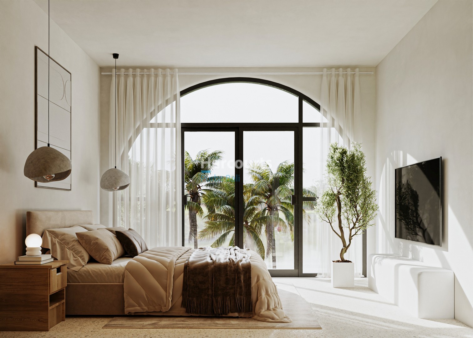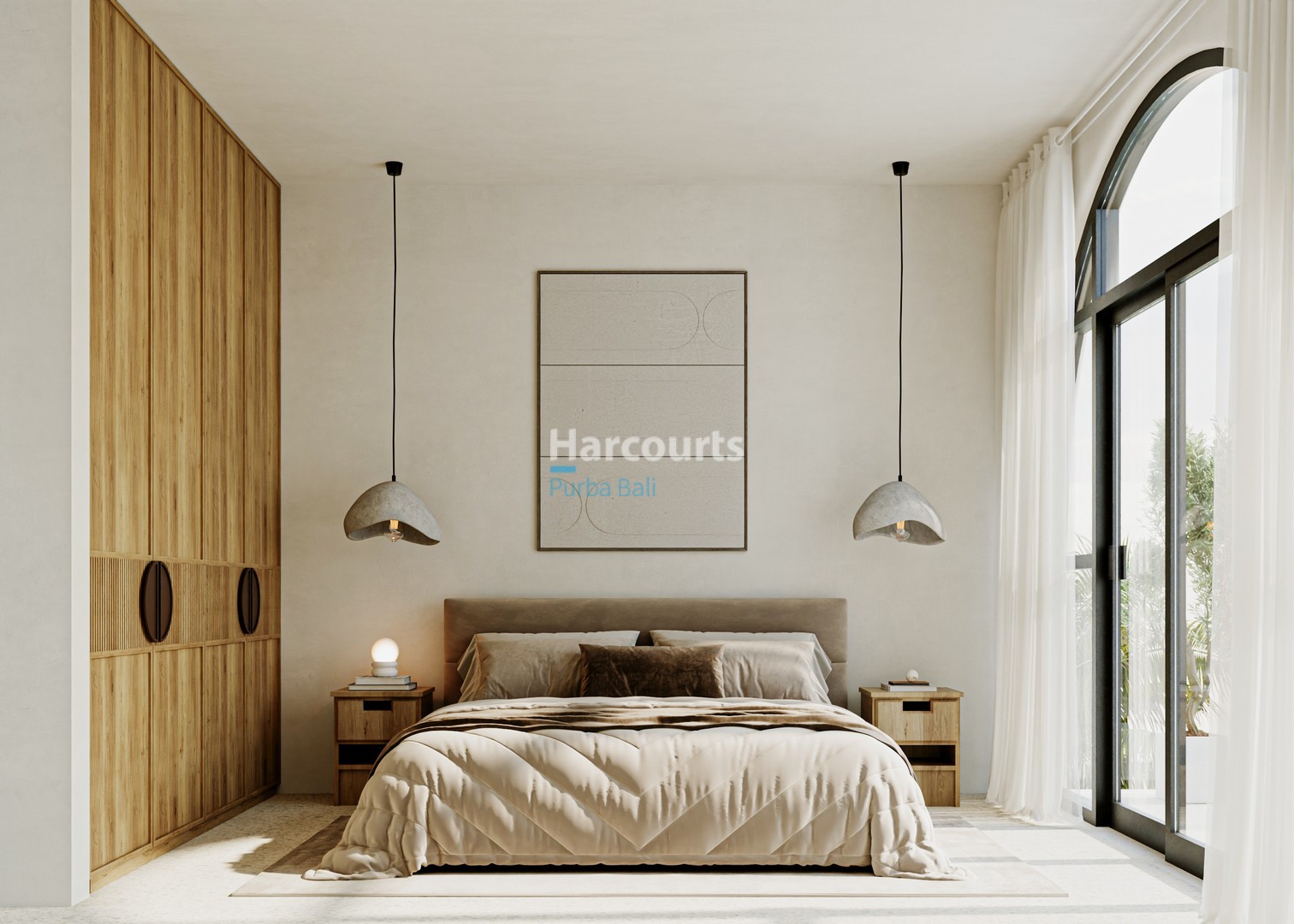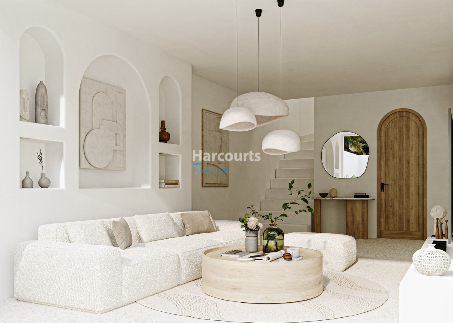 Thoughtfully laid out across 135 m² over two levels, the interior prioritises light and flow. A pale kitchen with wooden accents and open shelving sits beside a round dining table beneath a woven pendant, while large windows frame views of the garden. The living room is appointed with a plush sofa, round coffee table and sculptural pendant lights, with decorative wall niches and an arched wooden door providing subtle architectural interest. Bedrooms continue the calm palette with beige bedding, textured walls, ambient pendant lighting and a timber feature wall with circular cutouts; large glass doors and an arched window bring the outdoors in. Bathrooms feature light textured tiling, a wooden vanity with stone countertop, twin round mirrors and white vessel basins on a speckled floor.