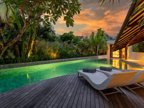 Nestled down a peaceful lane just over 500 meters from the beach, this spacious villa boasts a king size bedroom which opens out onto the living area and pool sun deck patio and links to a stylish ensuite, with decadent marble-topped vanities. This pool villa is both a perfect oasis in which to chill in on your own or from which to take a short stroll to the heart of Petitenget.