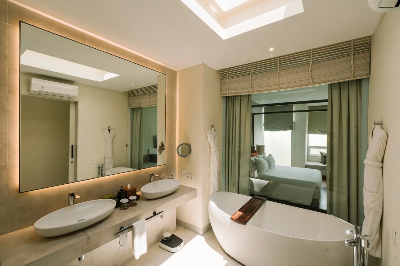 Interiors are arranged for effortless flow: air-conditioned living and dining areas open to an equipped kitchen, forming the home’s social hub. Finishes include warm wooden flooring, recessed lighting and large glass doors that invite natural light. The living room features an L-shaped grey sofa and wooden coffee table opposite a wall-mounted television. The master suite is appointed with a classic four-poster king bed dressed in white linens with orange accents and a window seat; the second bedroom adapts between twin or king layouts and includes an extra pull-out bed, light-toned walls and ample natural light. Both bathrooms echo tropical luxury with en-suite layouts, one fitted with a double sink and illuminated mirror and a freestanding bathtub with a wooden accent beneath a skylight.