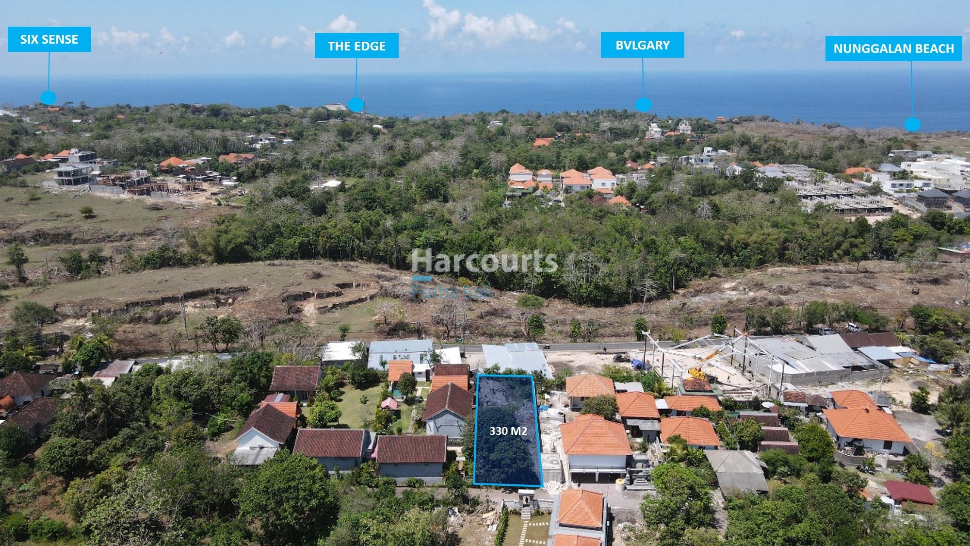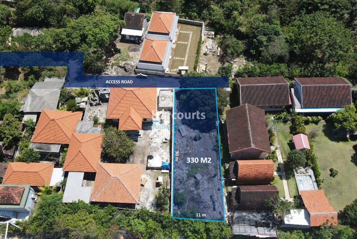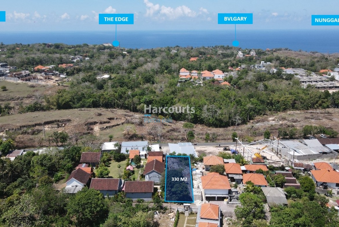 The plot measures approximately 30 m by 11 m and fronts Jalan Raya Uluwatu, offering strong visibility and logistical ease. The immediate setting combines clusters of red-tiled residences, semi-wooded pockets of trees and some active construction nearby, while a distant ocean glimpse provides a valuable coastal aspect and orientation for future design schemes.