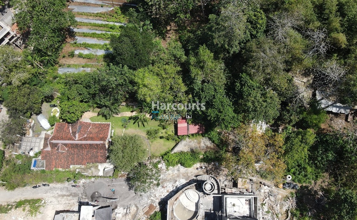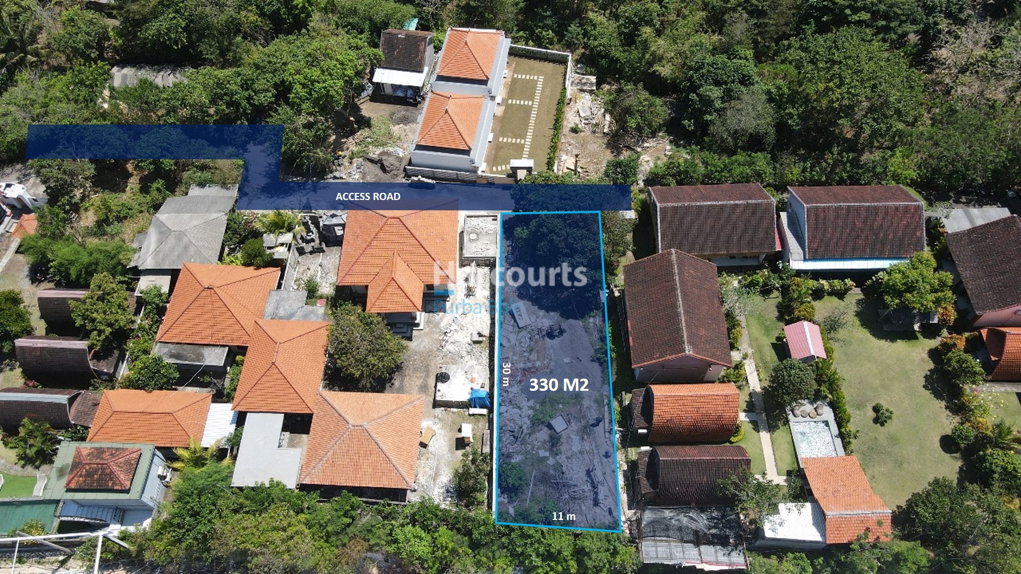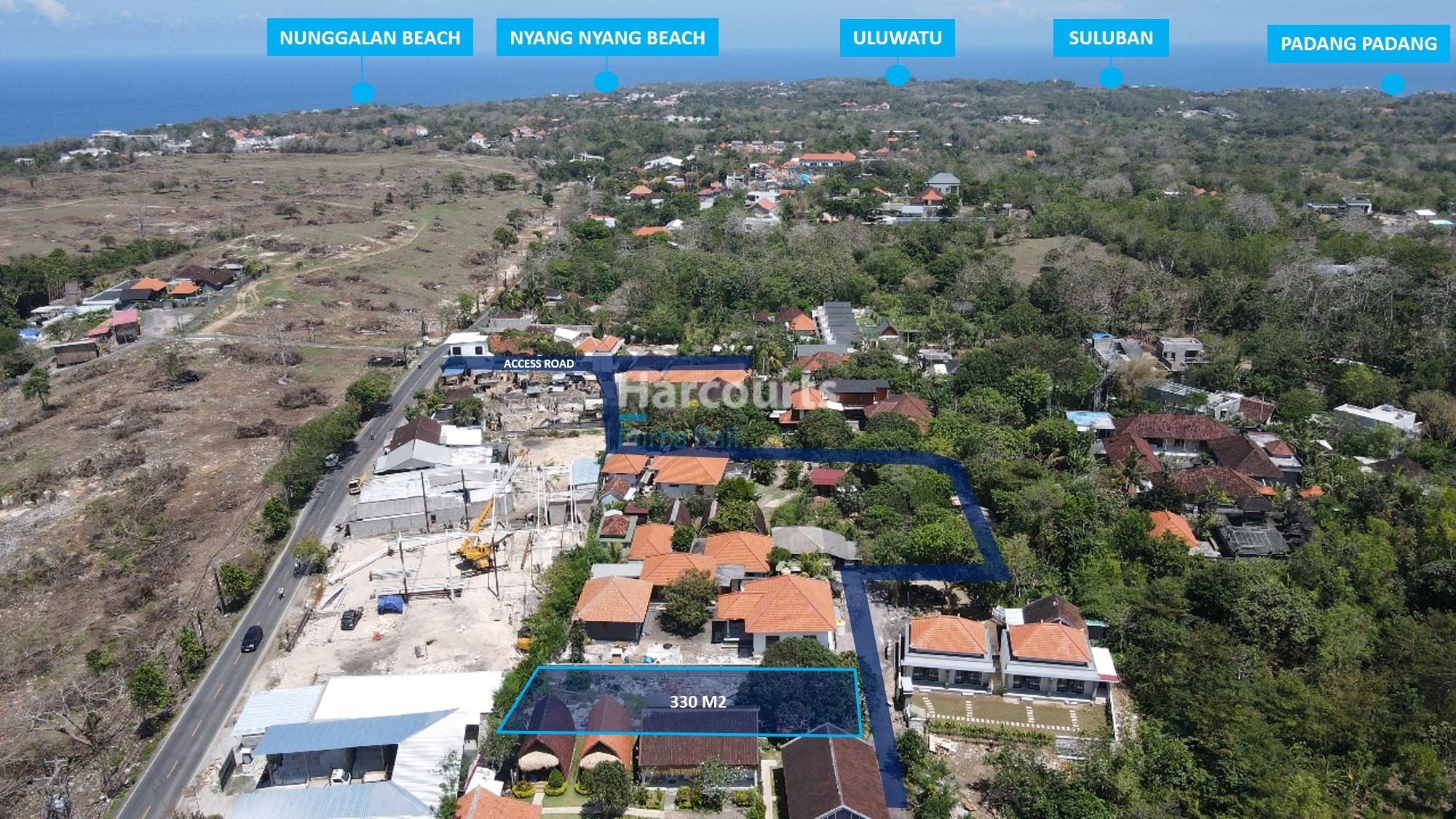 The plot measures approximately 30 m by 11 m and fronts Jalan Raya Uluwatu, offering strong visibility and logistical ease. The immediate setting combines clusters of red-tiled residences, semi-wooded pockets of trees and some active construction nearby, while a distant ocean glimpse provides a valuable coastal aspect and orientation for future design schemes.