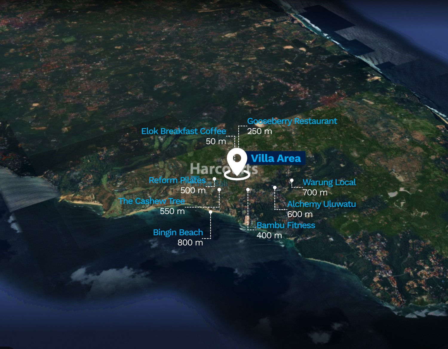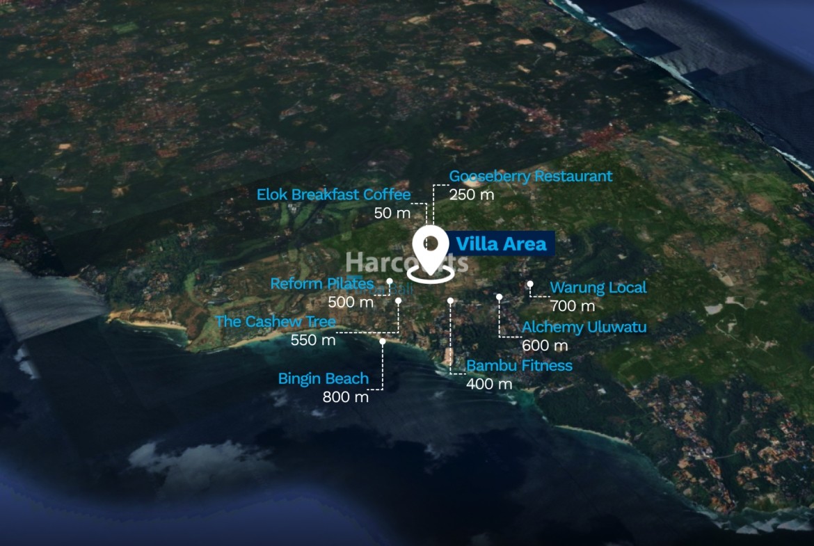 Nearby: Elok Breakfast Coffee 50 m, Gooseberry Restaurant 250 m, Bambu Fitness 400 m, Reform Pilates 500 m, The Cashew Tree 550 m, Alchemy Uluwatu 600 m, Warung Local 700 m, Bingin Beach 800 m,