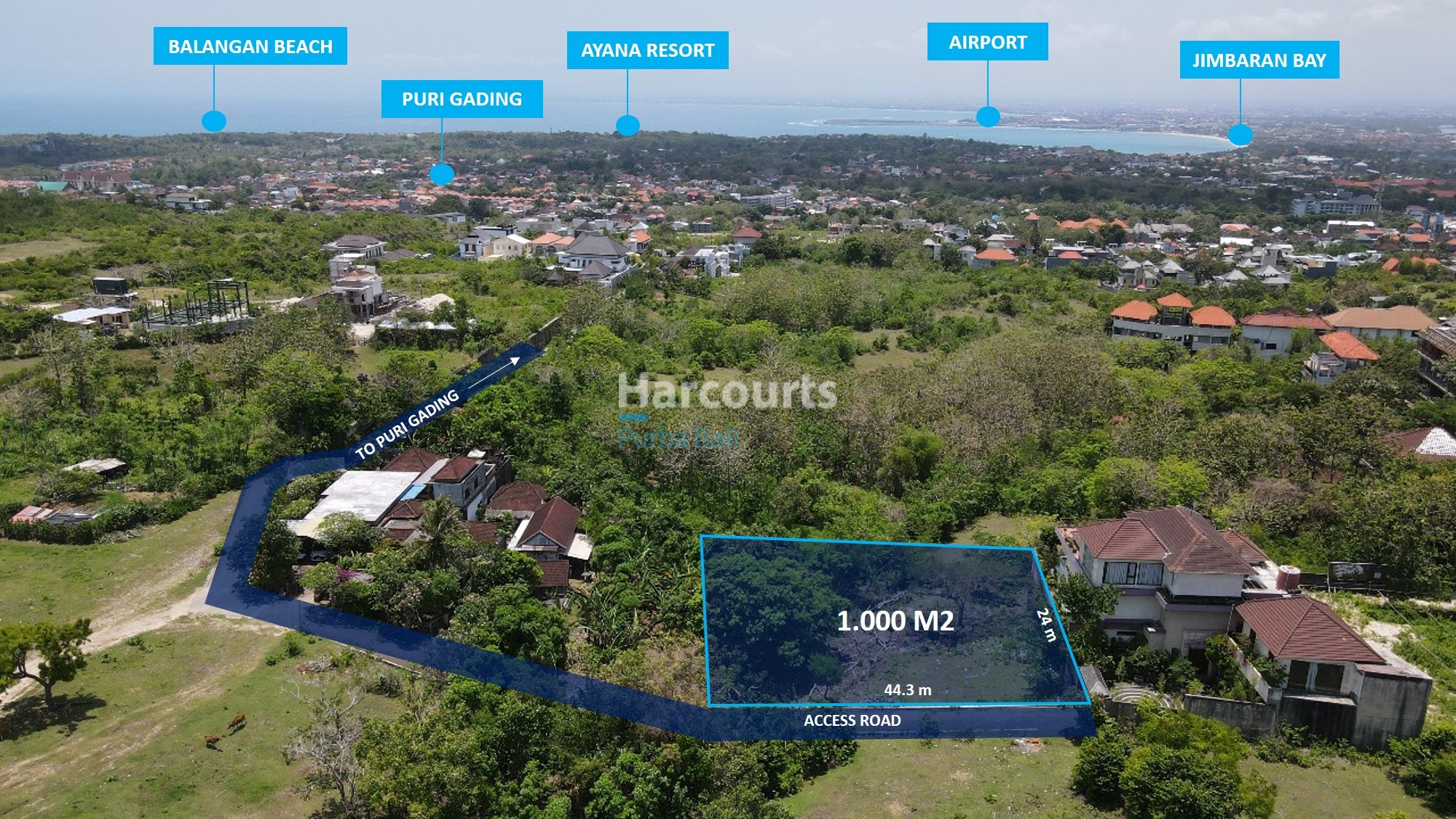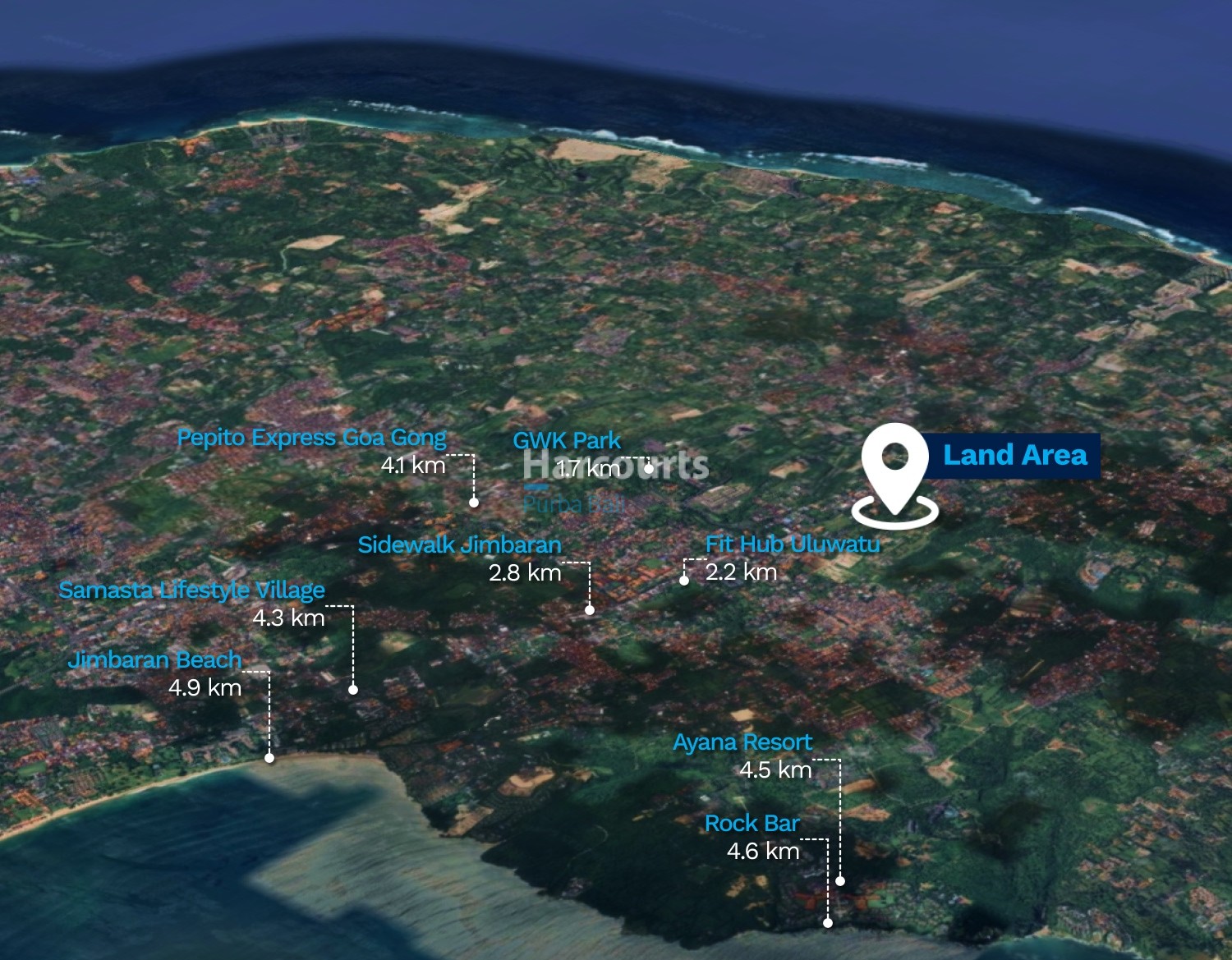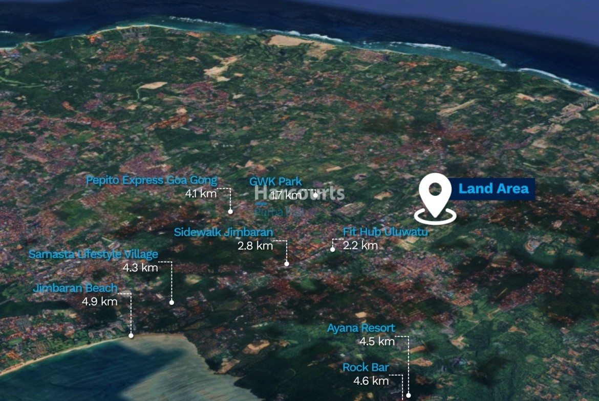 The setting is tranquil yet strategically placed for the Bukit Peninsula lifestyle — world-class surf breaks, exclusive beach clubs and acclaimed dining within easy reach — while the semi-rural streetscape and distant urban silhouette create a balanced, private atmosphere. Zoned for Pariwisata (Tourism), the land is generally suitable for developing commercial accommodation or a private luxury residence for short-stay use, with ample space for gardens, a swimming pool and private parking. Offered at Rp 6,500,000,000, this freehold opportunity is well positioned in a market of steady appreciation.