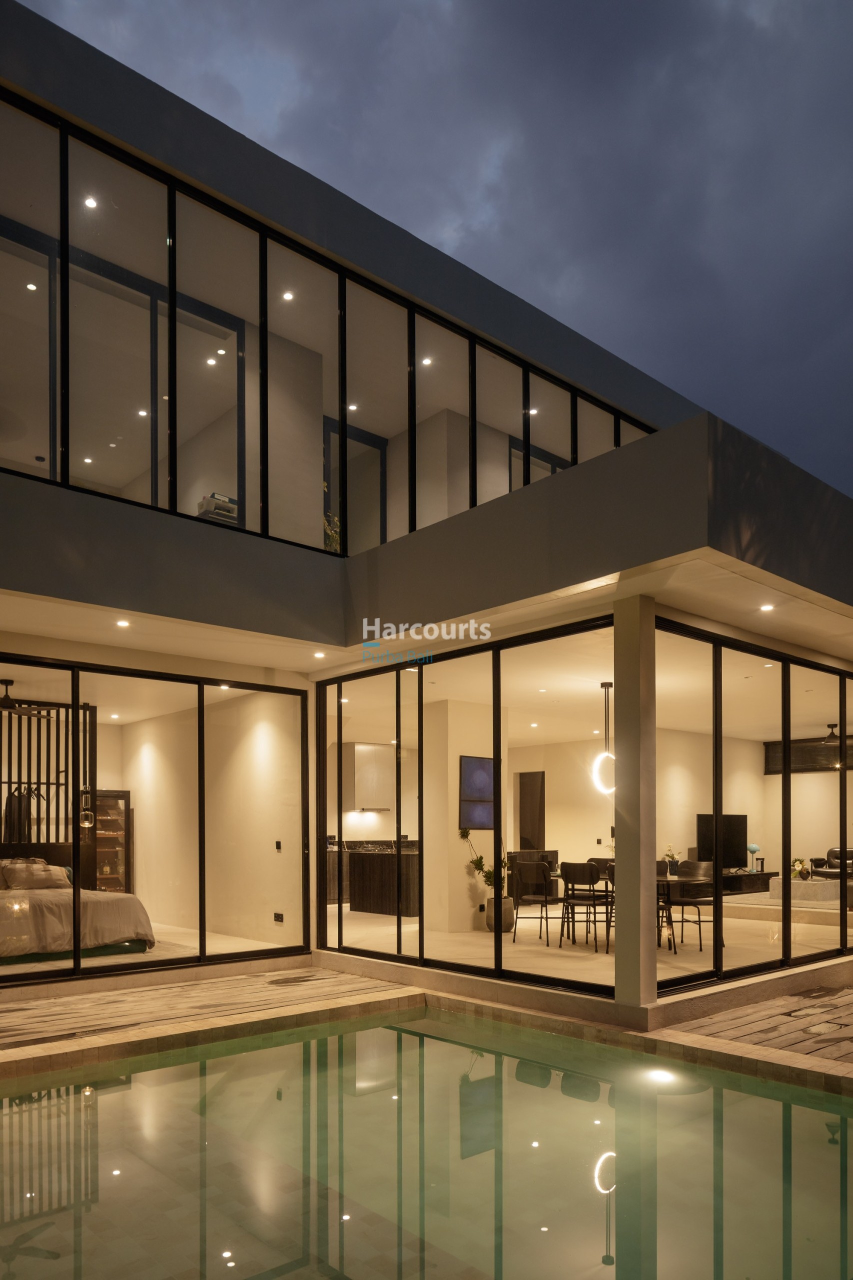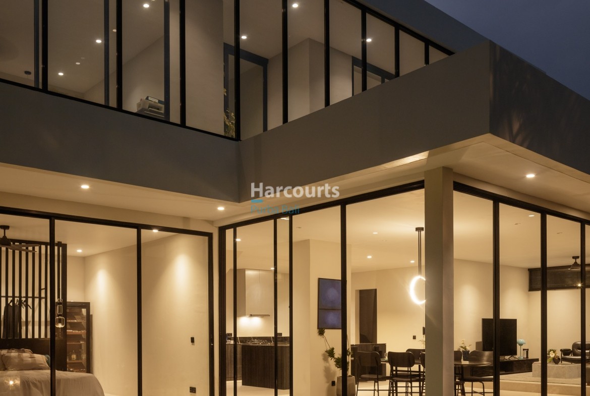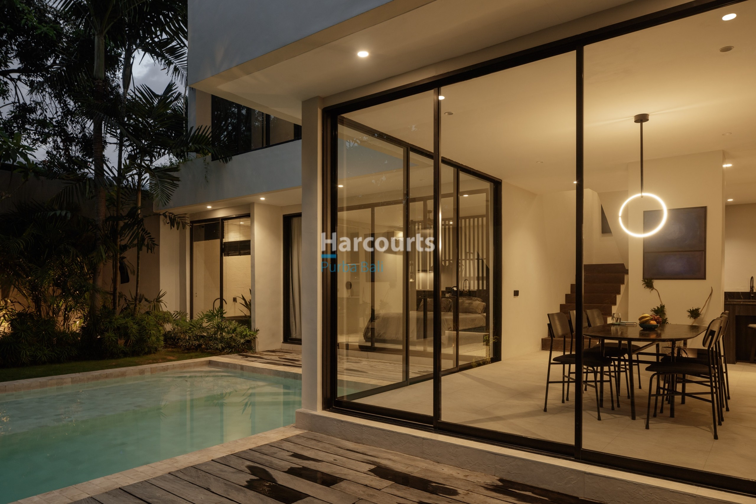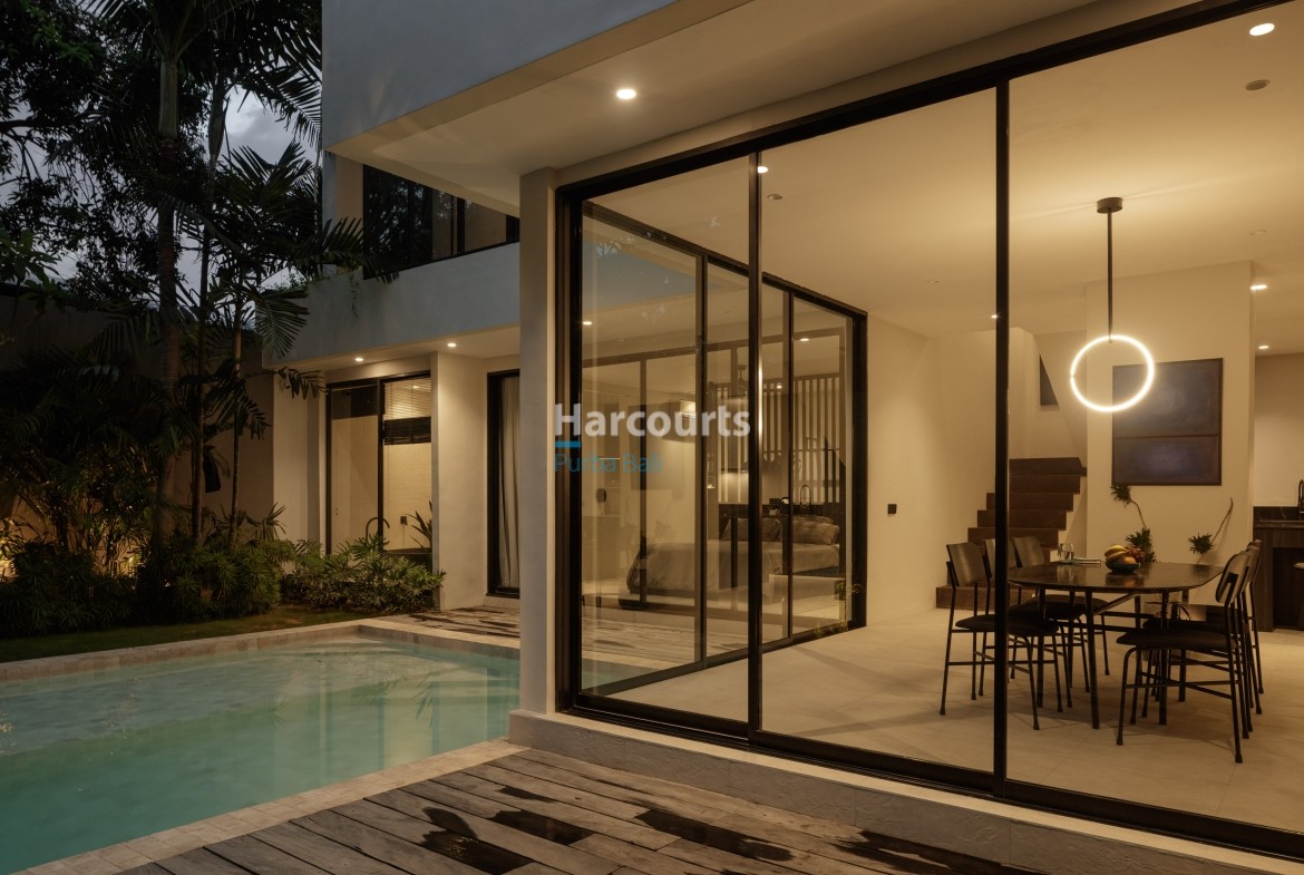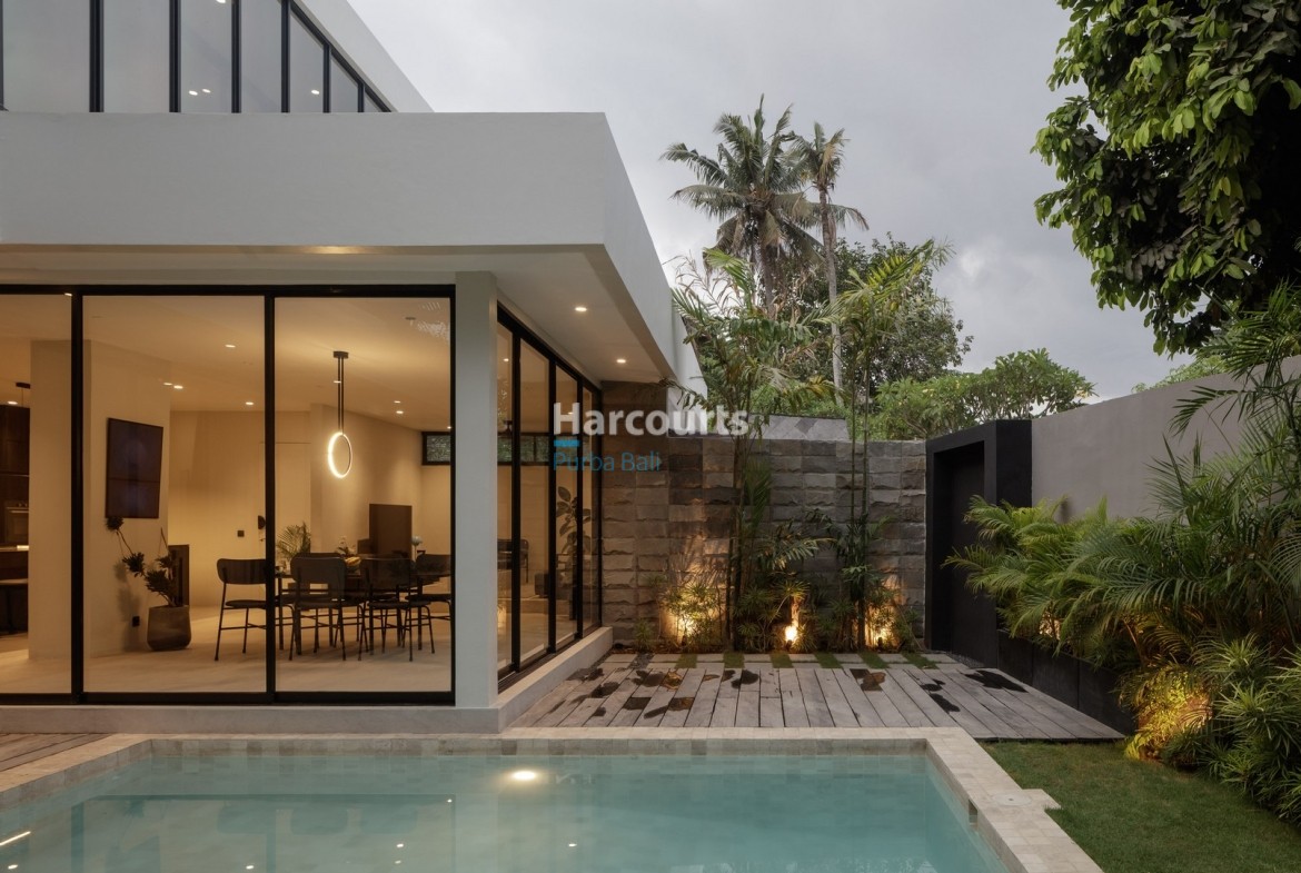 Outside, the pool sits neatly alongside a timber deck and garden space, with ambient lighting that transforms the villa at dusk. A large car garage with an electric gate provides a rare urban convenience, especially this close to the beach. Offered fully furnished, the property also comes with a building permit (IMB) issued in 2014 and was fully renovated in the past year.