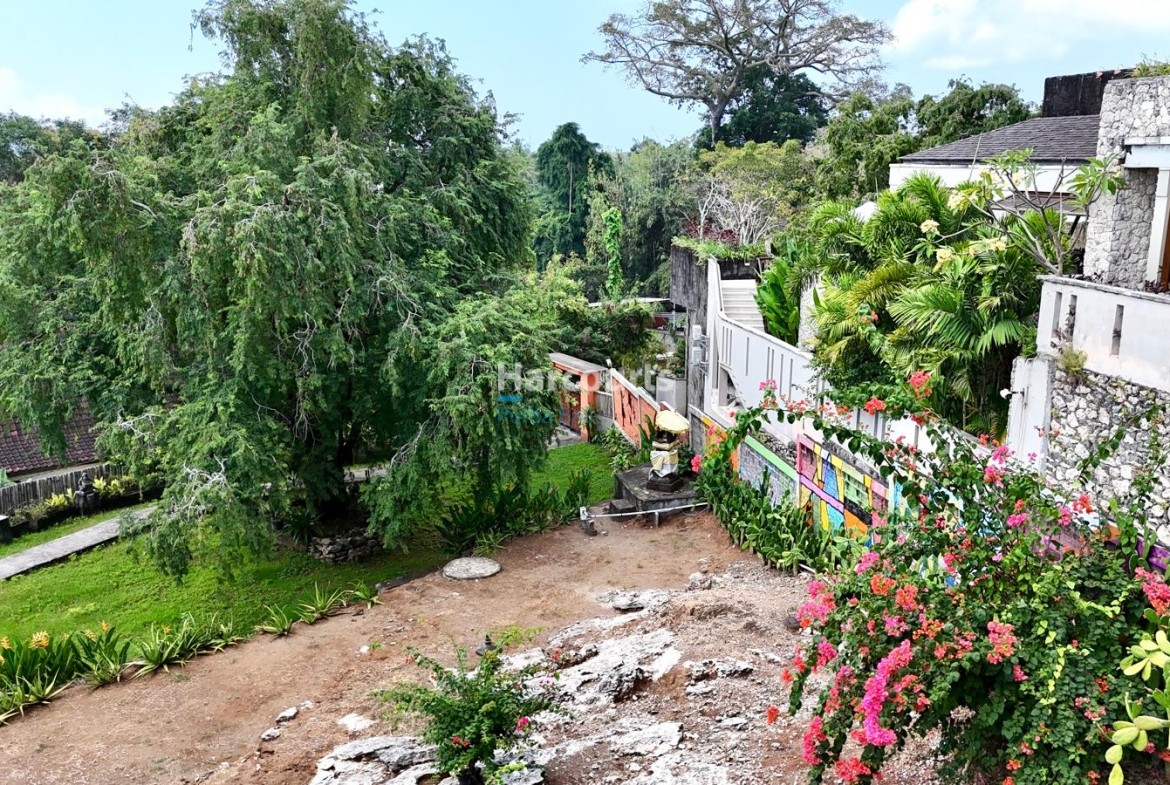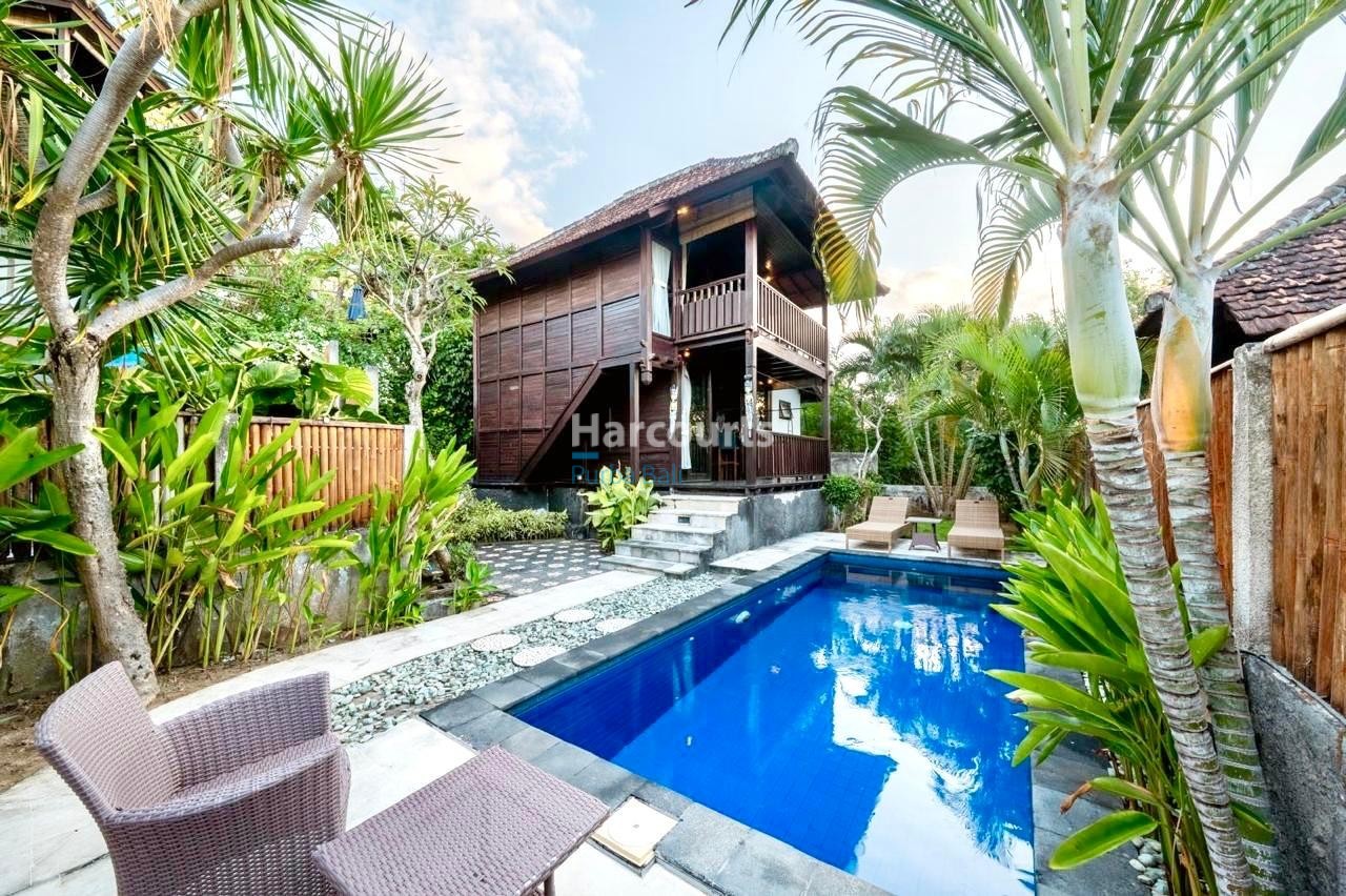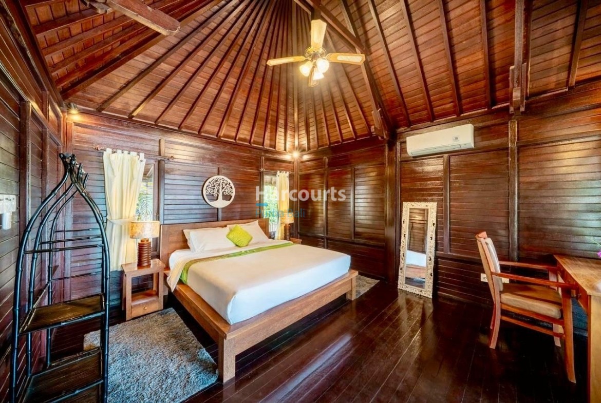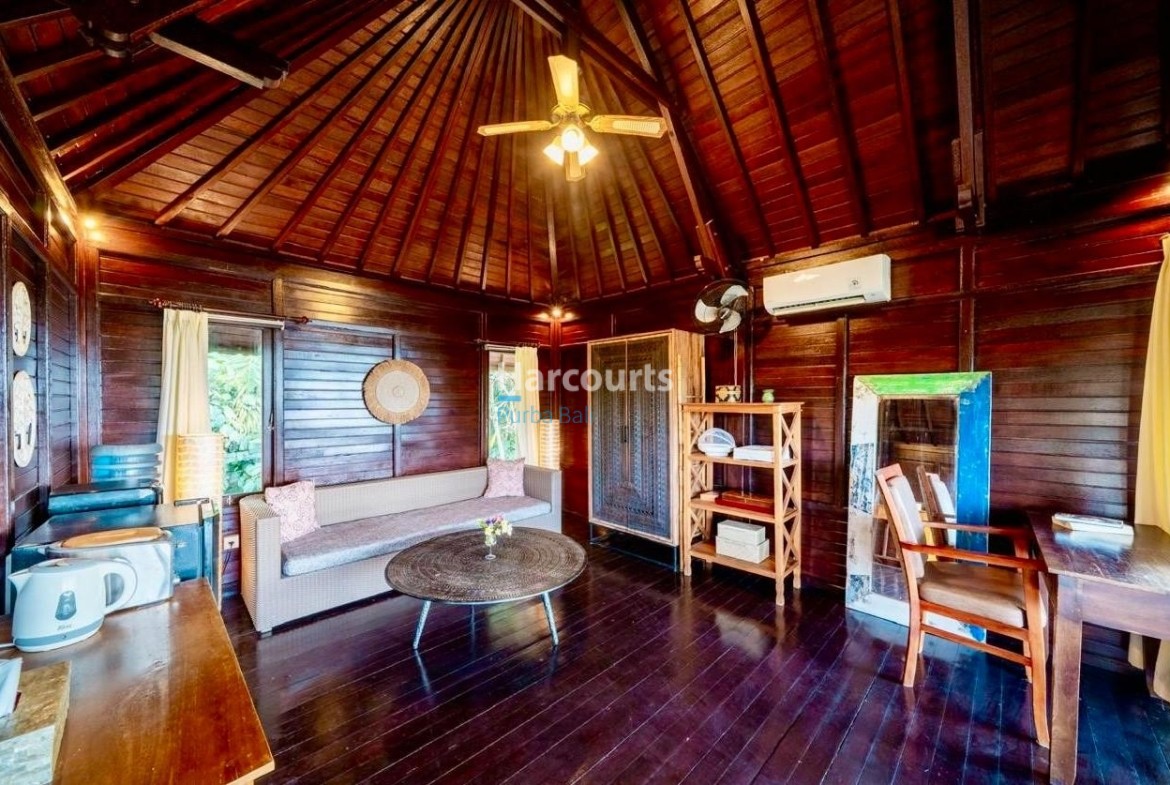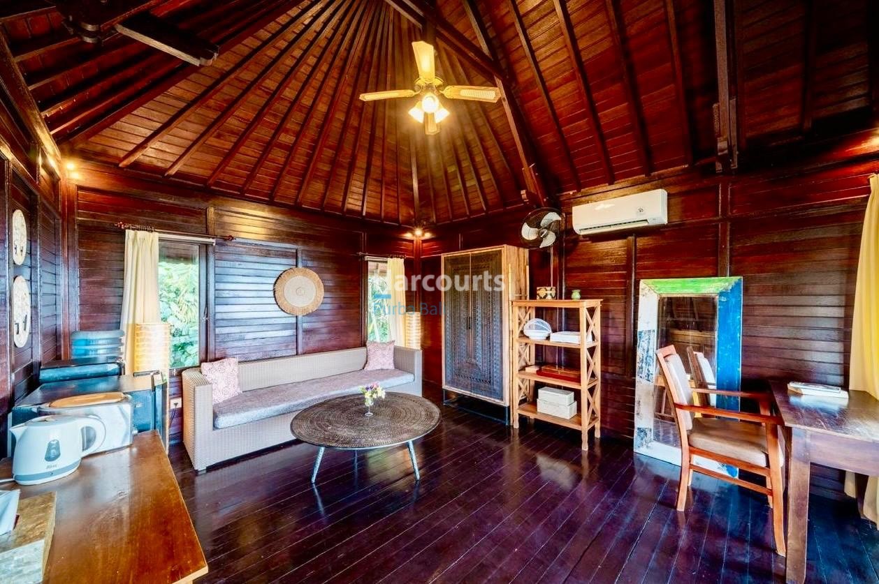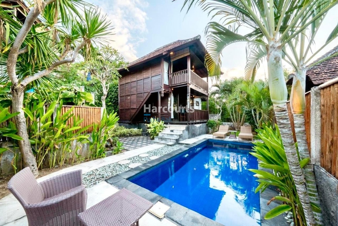 The property already has 2 x 2 level traditional style villas positioned at the western corner of the land that could be taken to the next level with a stylish cosmetic renovation. The villas are constructed of quality teak throughout with traditional tiled roofs. The top villa has the bedroom on the upper floor with a lounge area and bathroom on the ground floor. The lower villa has the opposite configuration with the bedroom and lounge area reversed. Both villas also have nice size balcony’s (both levels) with ocean and sunset glimpses to the west as well as come with private ceramic tiled pools and grassed areas. Situated below the bottom villa is a seperate maids/storage room.