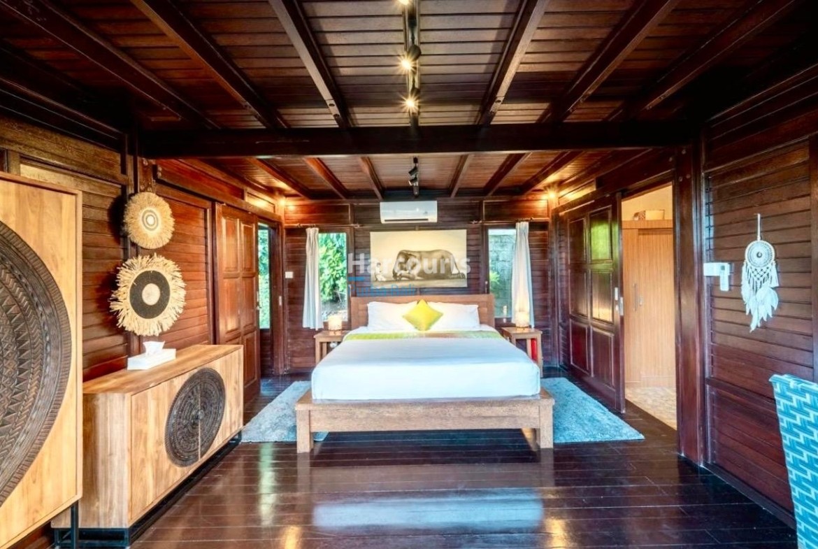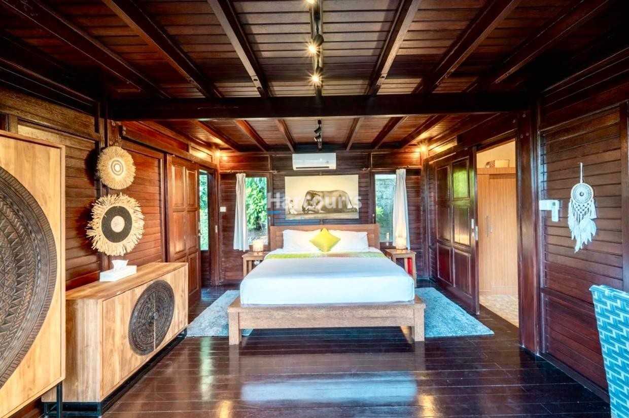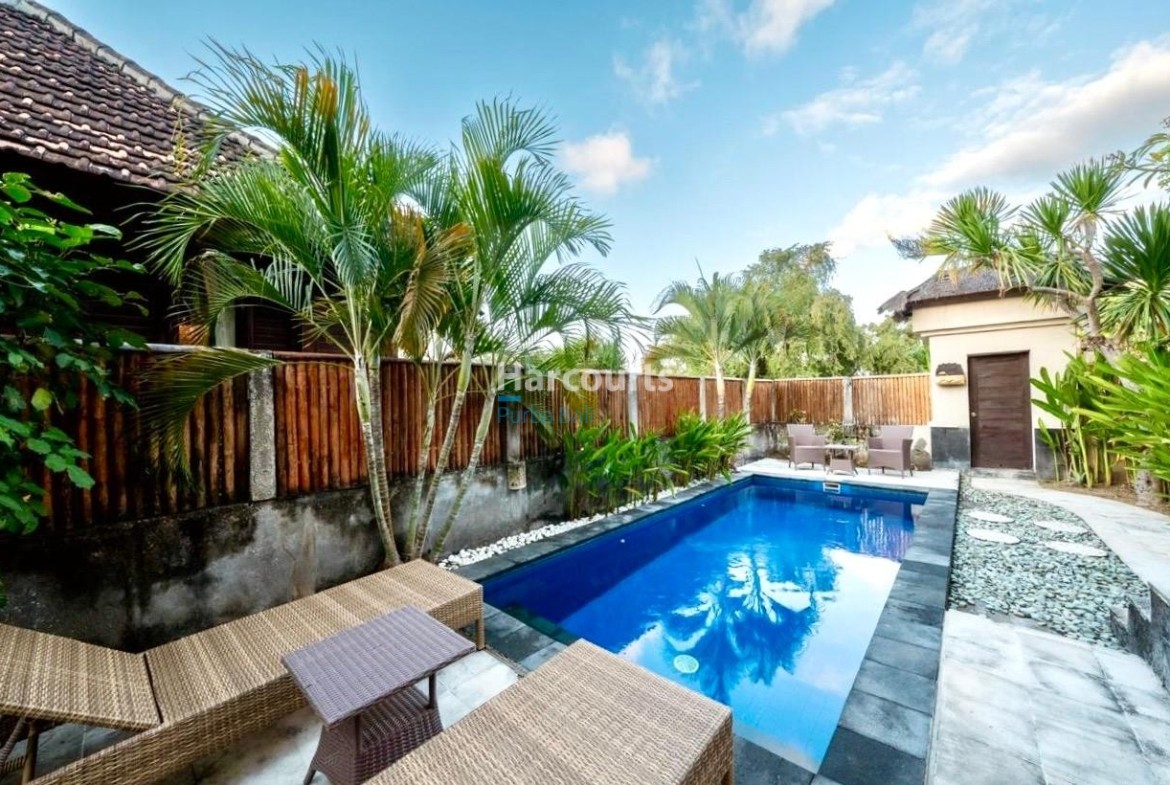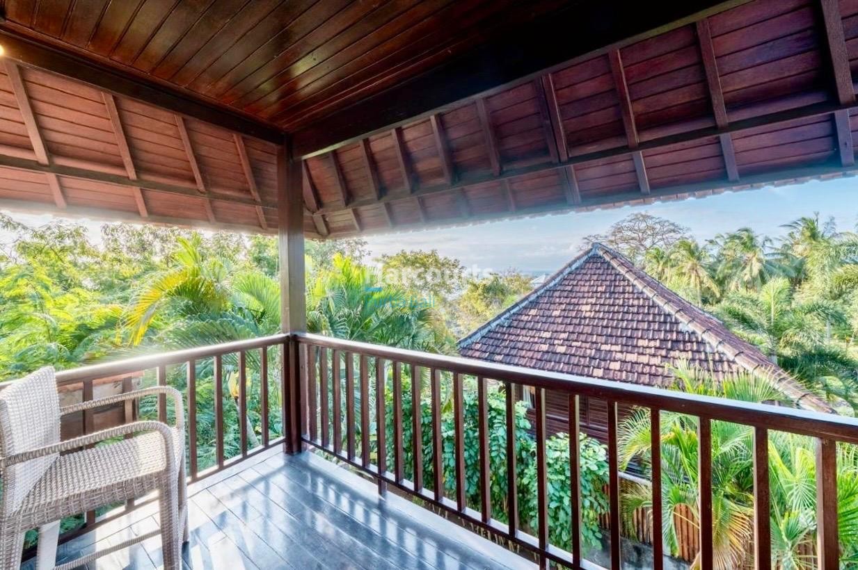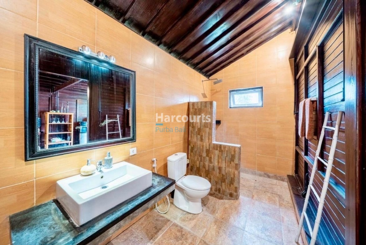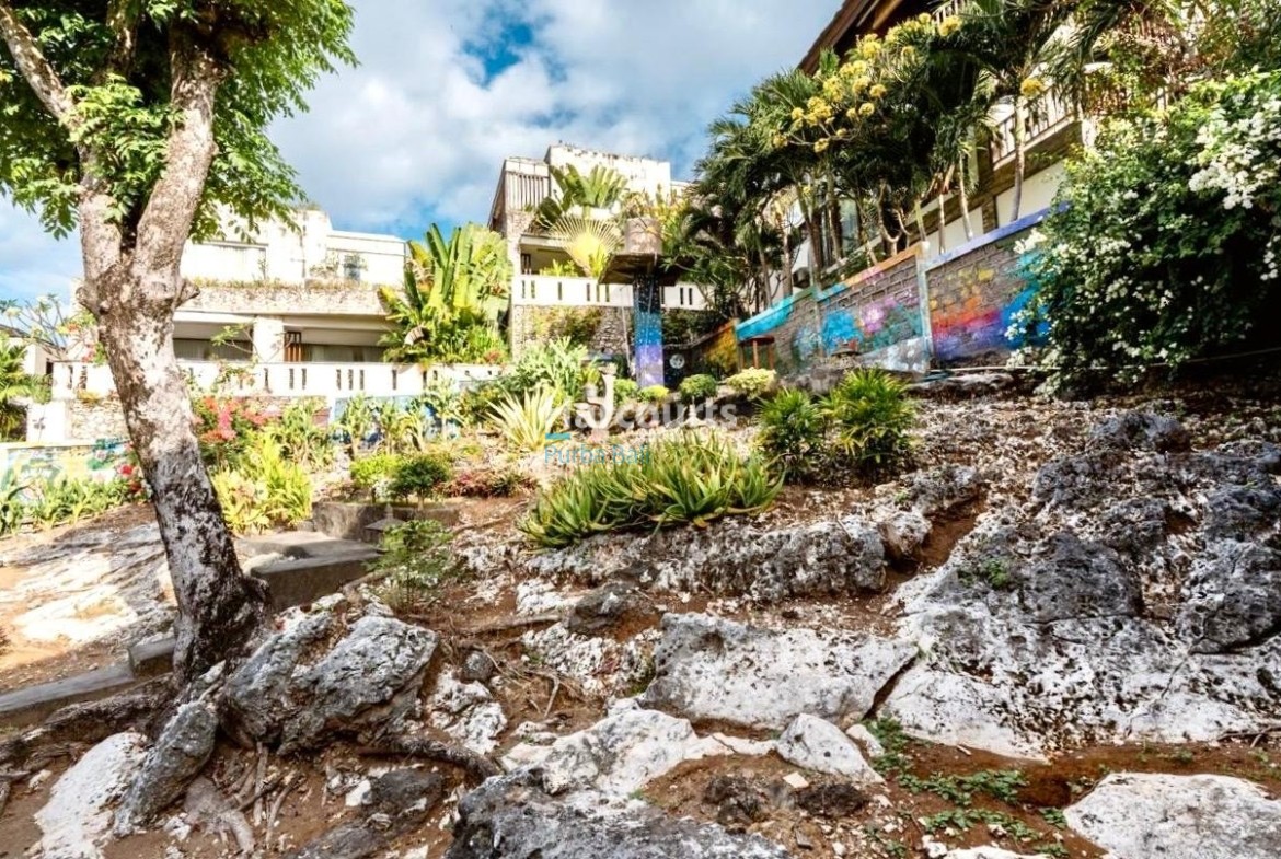 The property already has 2 x 2 level traditional style villas positioned at the western corner of the land that could be taken to the next level with a stylish cosmetic renovation. The villas are constructed of quality teak throughout with traditional tiled roofs. The top villa has the bedroom on the upper floor with a lounge area and bathroom on the ground floor. The lower villa has the opposite configuration with the bedroom and lounge area reversed. Both villas also have nice size balcony’s (both levels) with ocean and sunset glimpses to the west as well as come with private ceramic tiled pools and grassed areas. Situated below the bottom villa is a seperate maids/storage room.