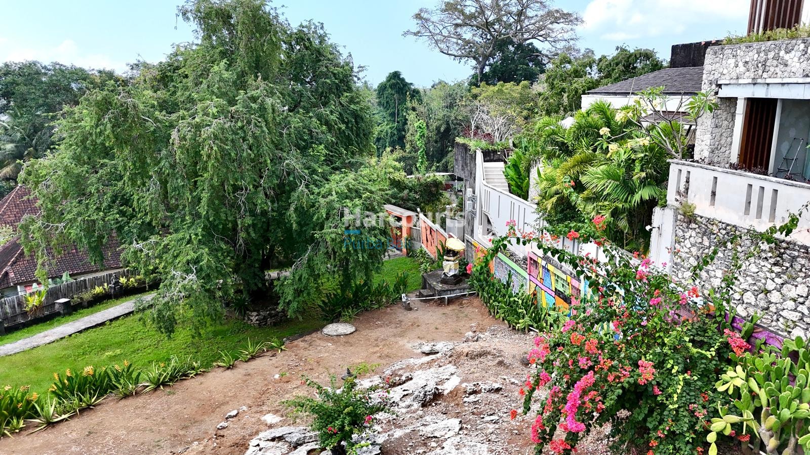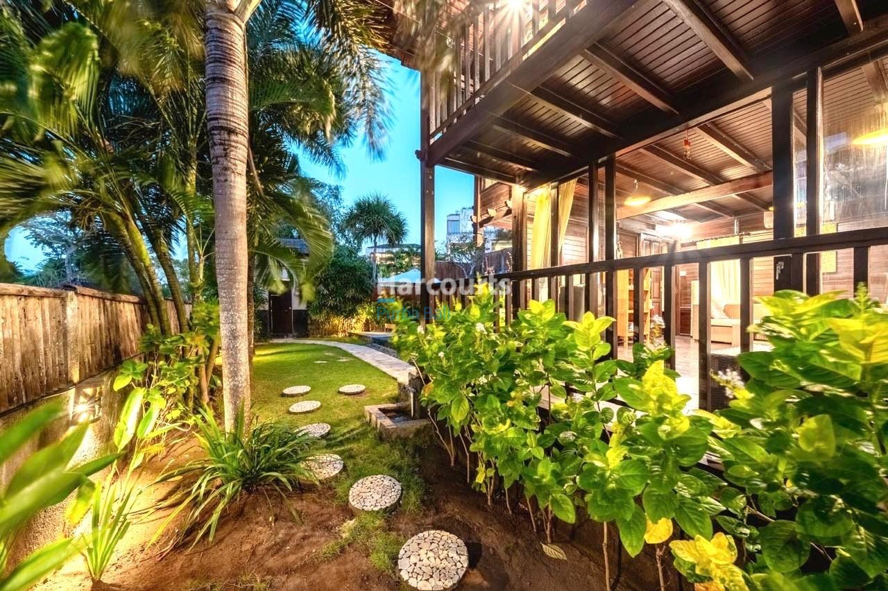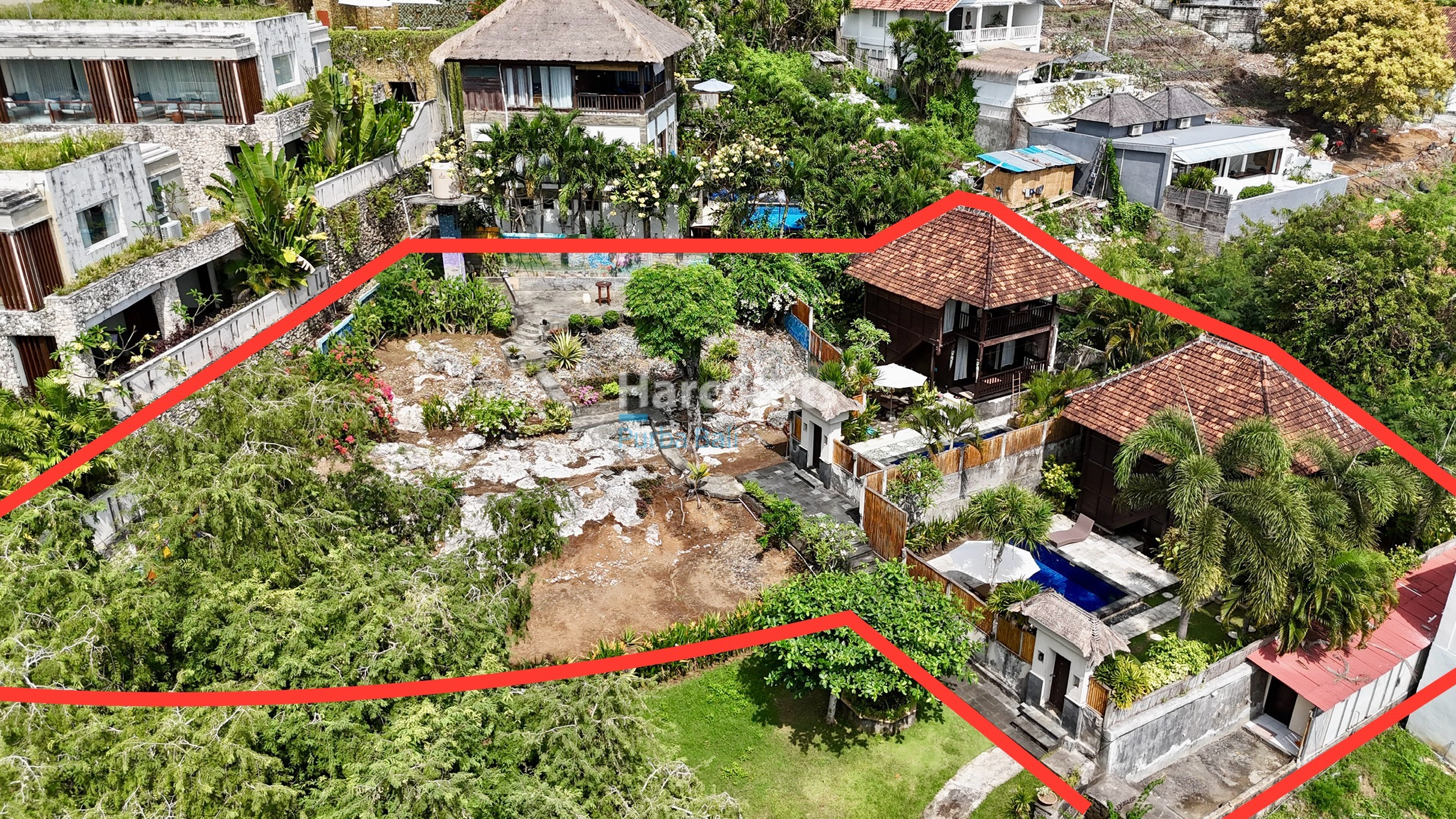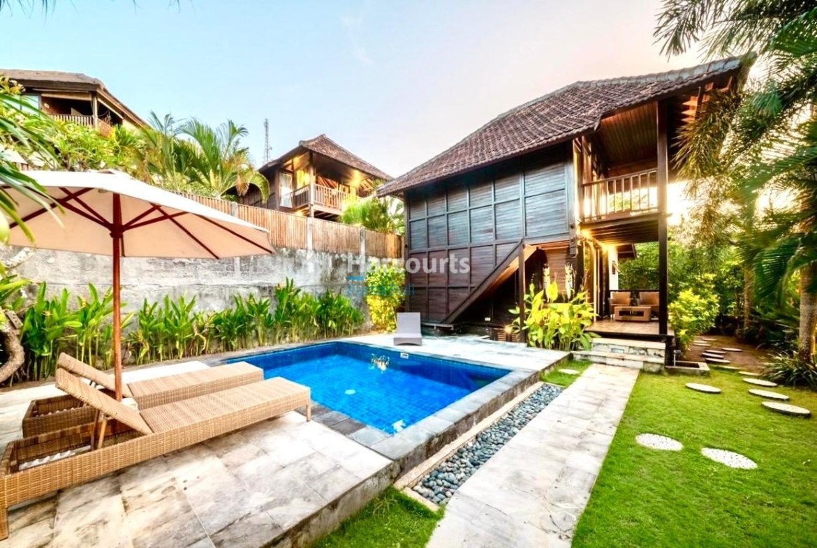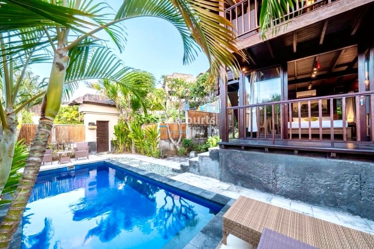 The property already has 2 x 2 level traditional style villas positioned at the western corner of the land that could be taken to the next level with a stylish cosmetic renovation. The villas are constructed of quality teak throughout with traditional tiled roofs. The top villa has the bedroom on the upper floor with a lounge area and bathroom on the ground floor. The lower villa has the opposite configuration with the bedroom and lounge area reversed. Both villas also have nice size balcony’s (both levels) with ocean and sunset glimpses to the west as well as come with private ceramic tiled pools and grassed areas. Situated below the bottom villa is a seperate maids/storage room.