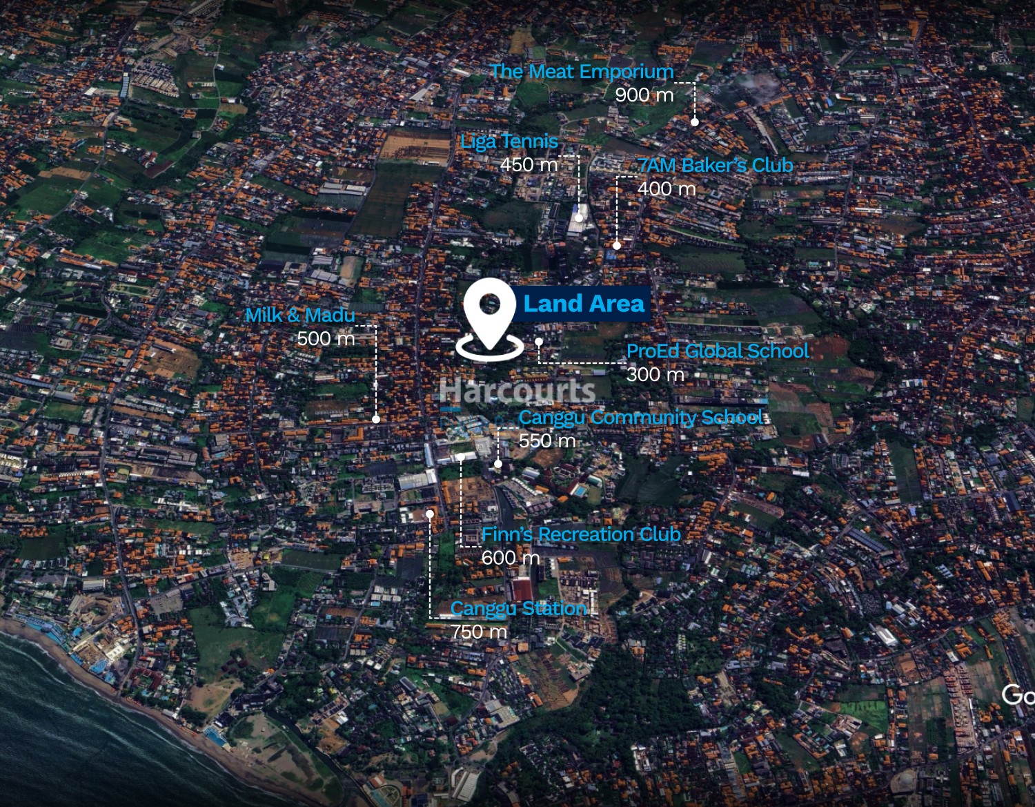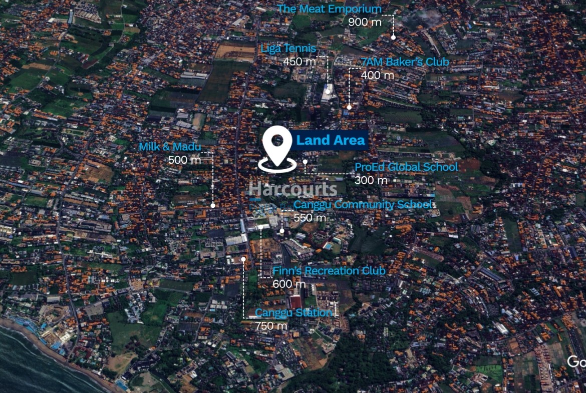 Nearby: ProEd Global School 300 m, 7AM Baker’s Club 400 m, Liga Tennis 450 m, Milk & Madu 500 m, Canggu Community School 550 m, Finn’s Recreation Club 600 m, Canggu Station 750 m, The Meat Emporium 900 m