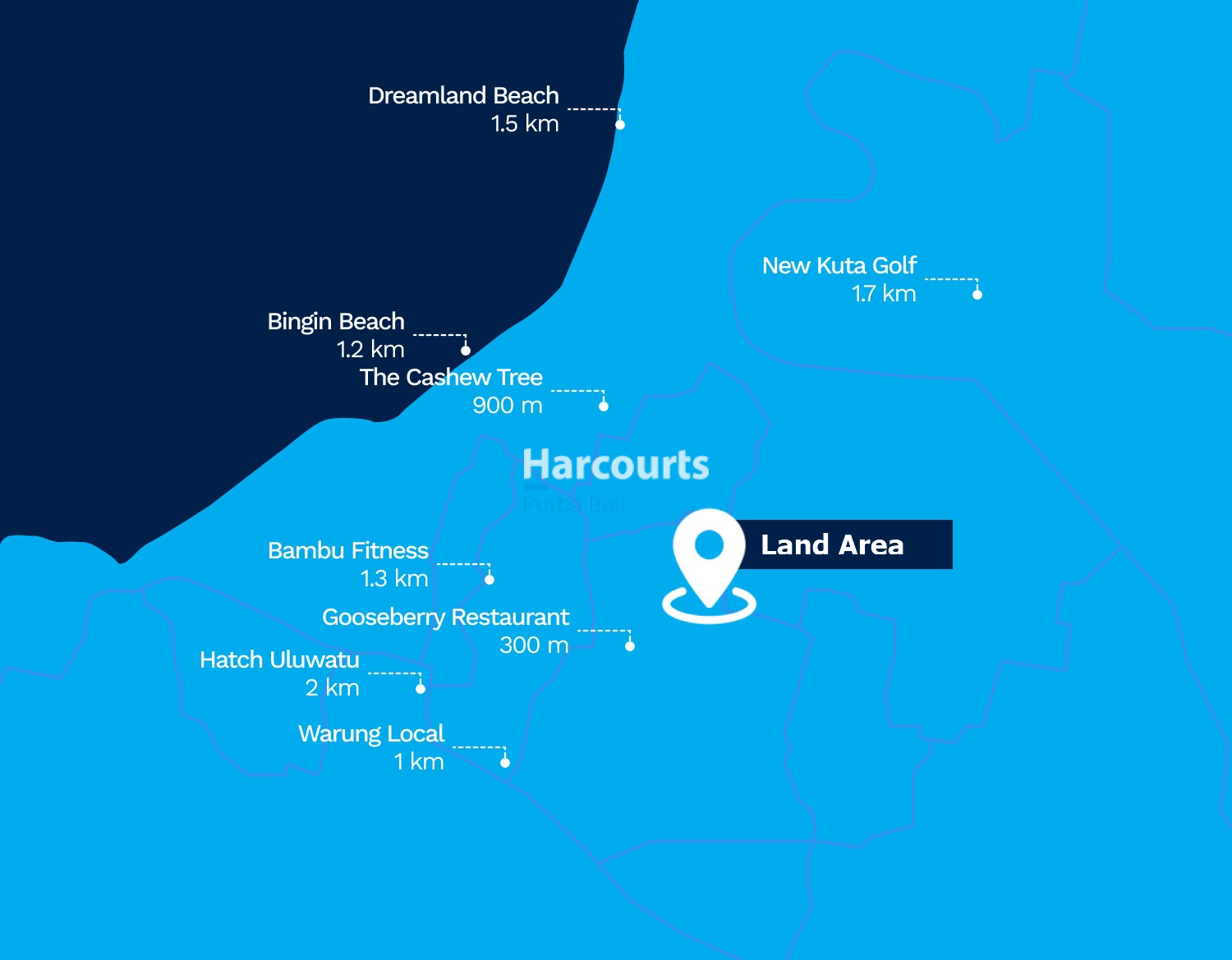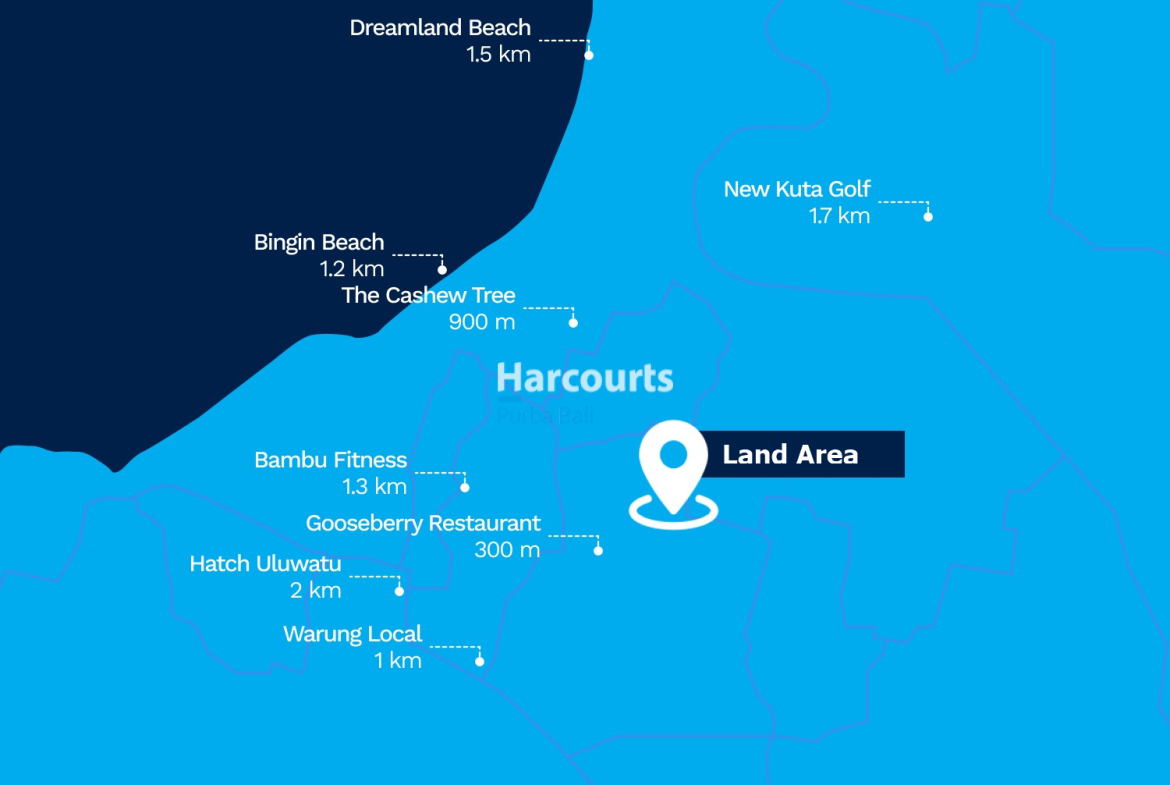 Nearby: Gooseberry 300 m, The Cashew Tree 900 m, Warung Local 1 km, Bingin Beach 1.2 km, Bambu Fitness 1.3 km, Dreamland Beach 1.5 km, New Kuta Golf 1.7 km, Hatch 2 km