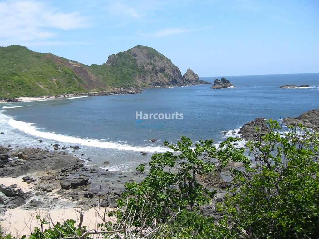 The bay presents a gently curving shoreline punctuated by rocky headlands and calm blue waters where small waves lap the sand. Lush green hills rise steeply from the beach to rolling ridgelines that enclose a broad valley floor, offering layered ocean and coastal panoramas, pockets of sparse vegetation and small clearings, and the intimate character of a tucked-away coastal landscape.