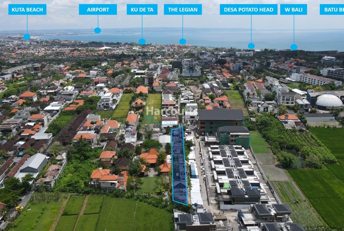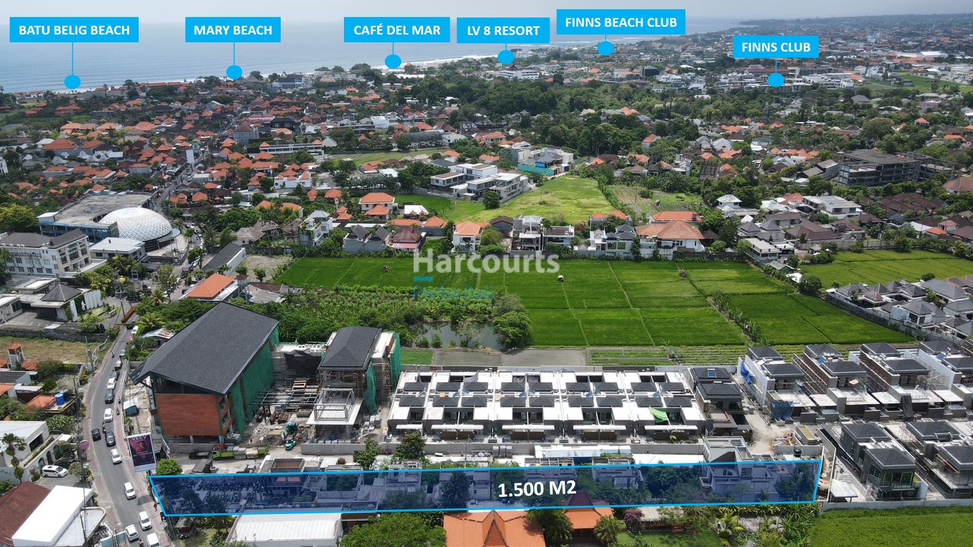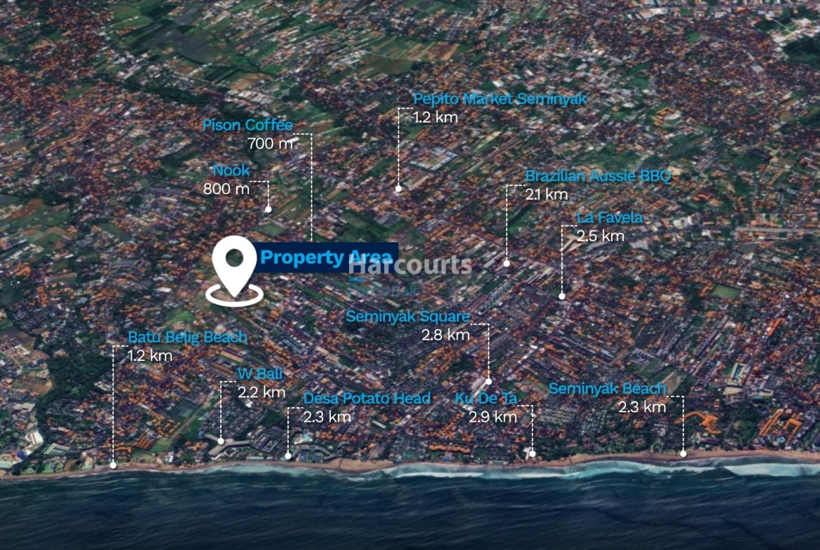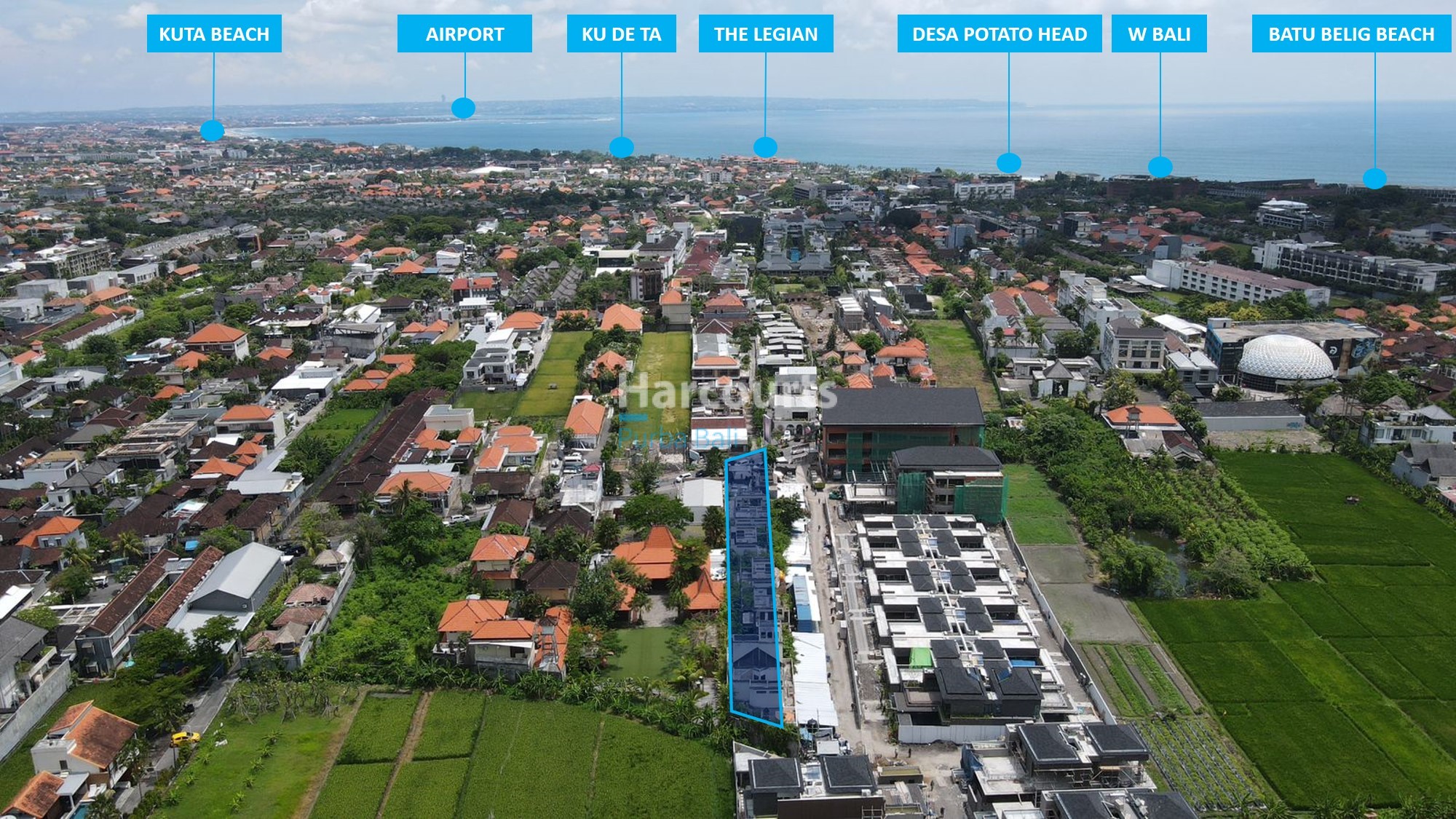 The rectangular land enjoys exceptional visibility and access, surrounded by upscale restaurants, cafes, beach clubs, and boutique retail. From its elevated position, the property captures glimpses of the coastline and is bordered by rice fields and landscaped gardens, combining urban convenience with Bali’s tropical charm. The surrounding area is defined by a mix of luxury villas, modern developments, and active construction projects, reflecting Batu Belig’s strong commercial growth and ongoing transformation.