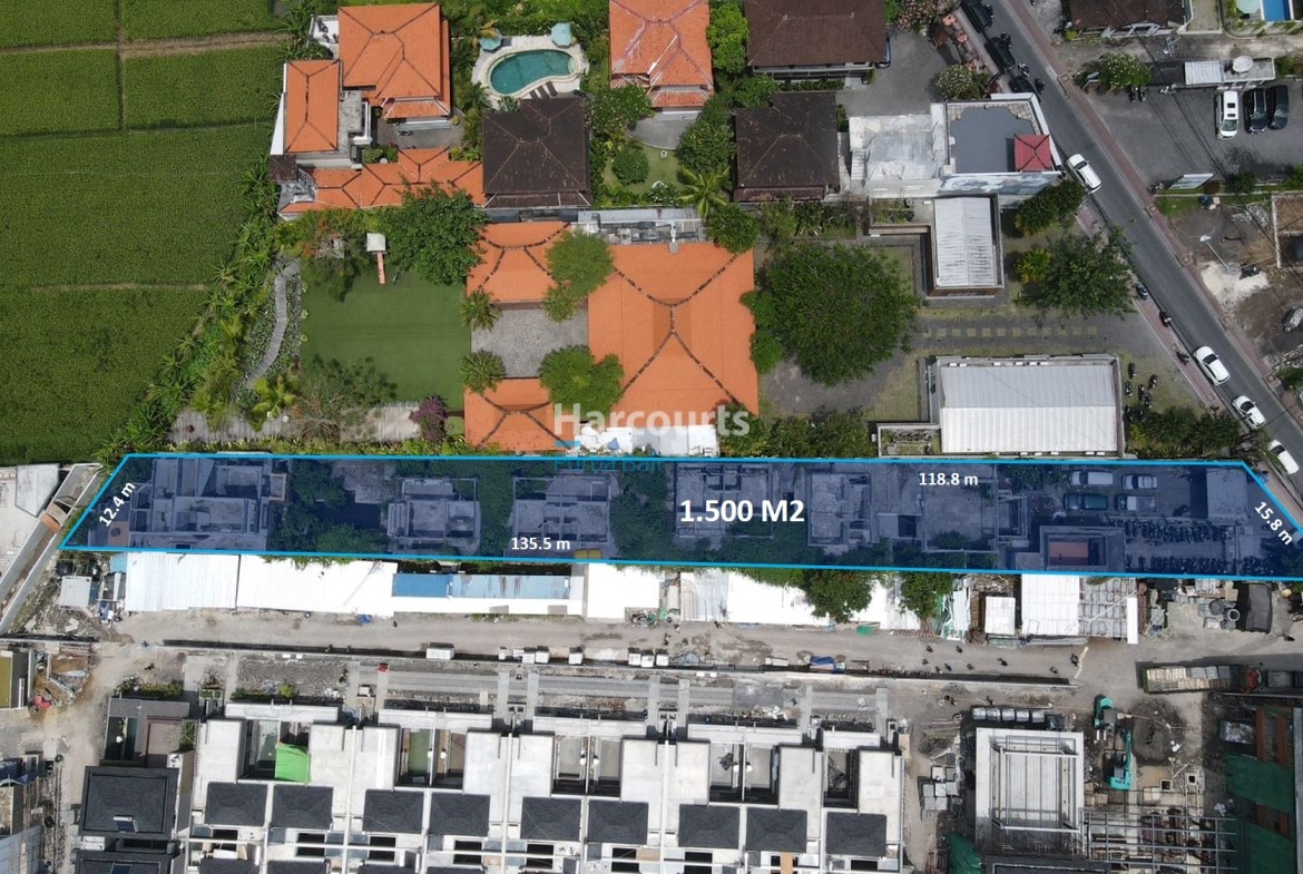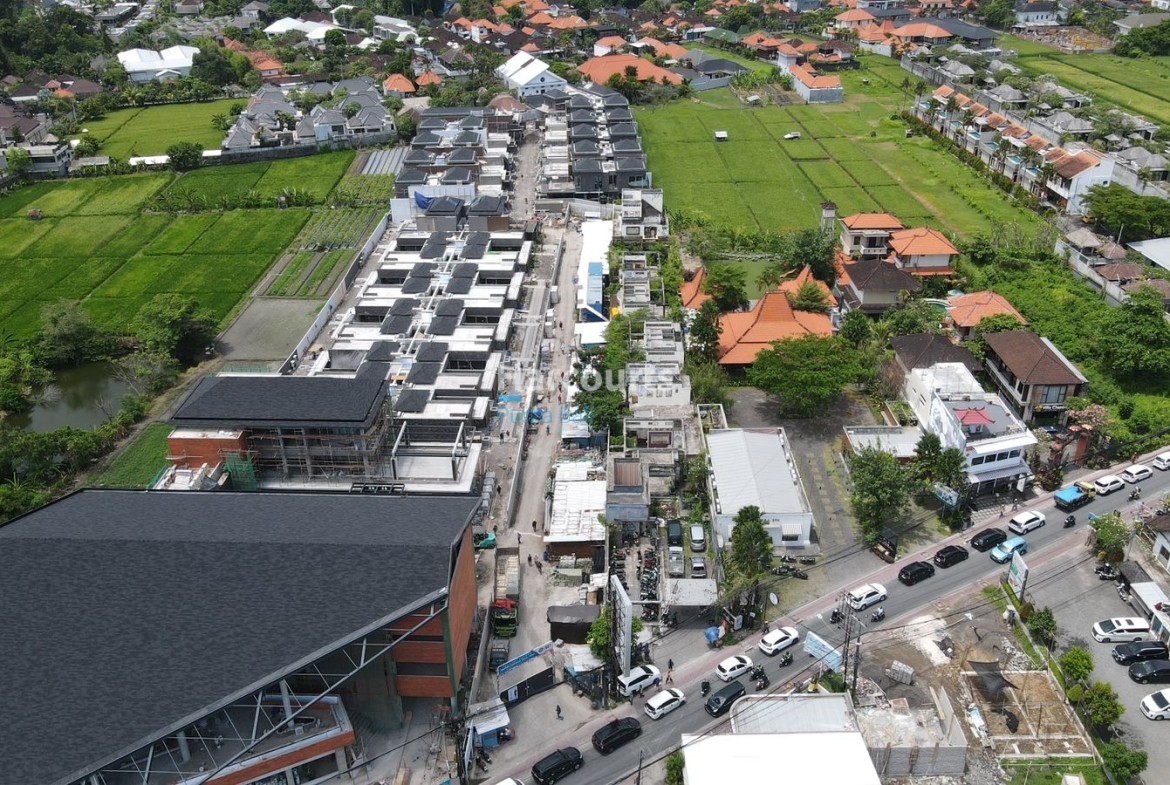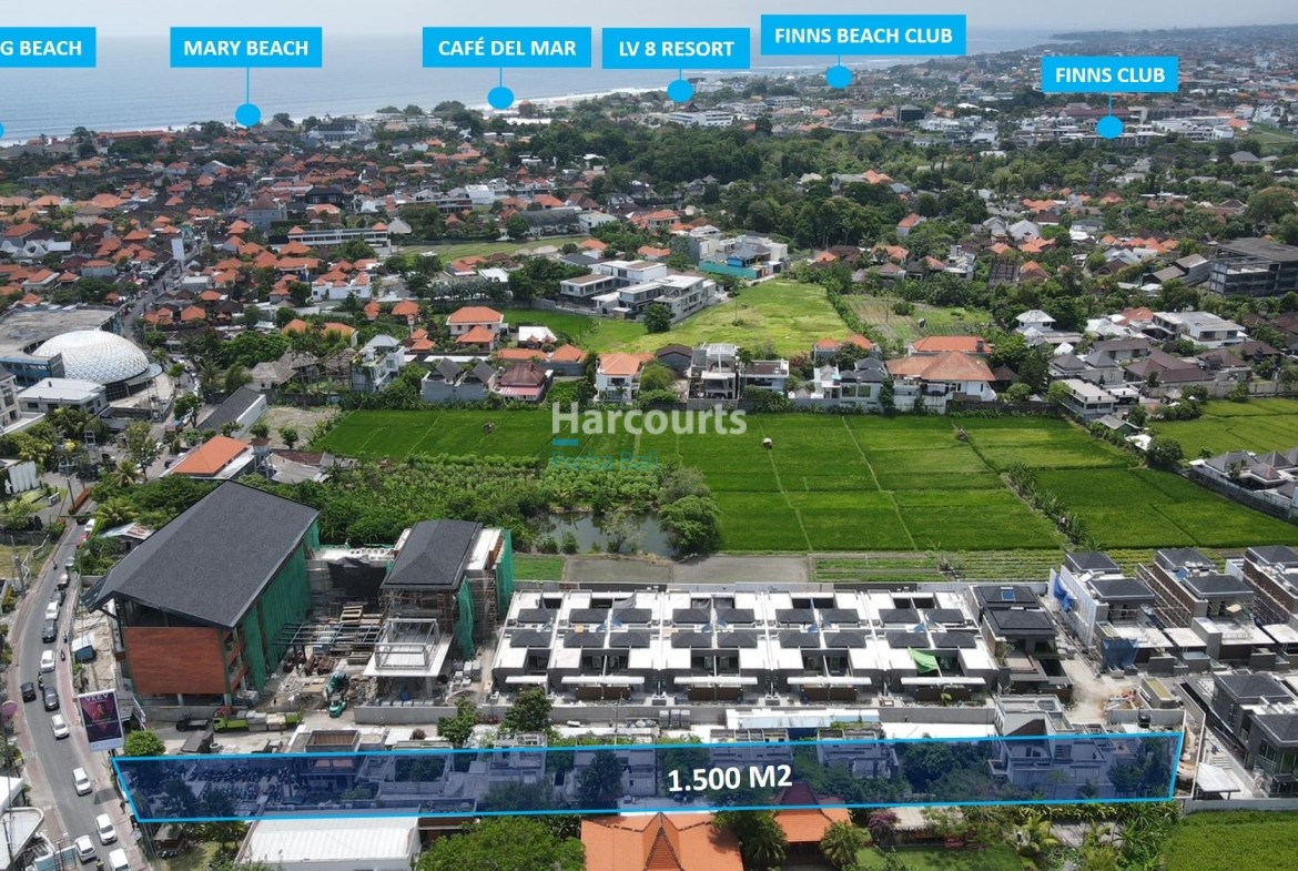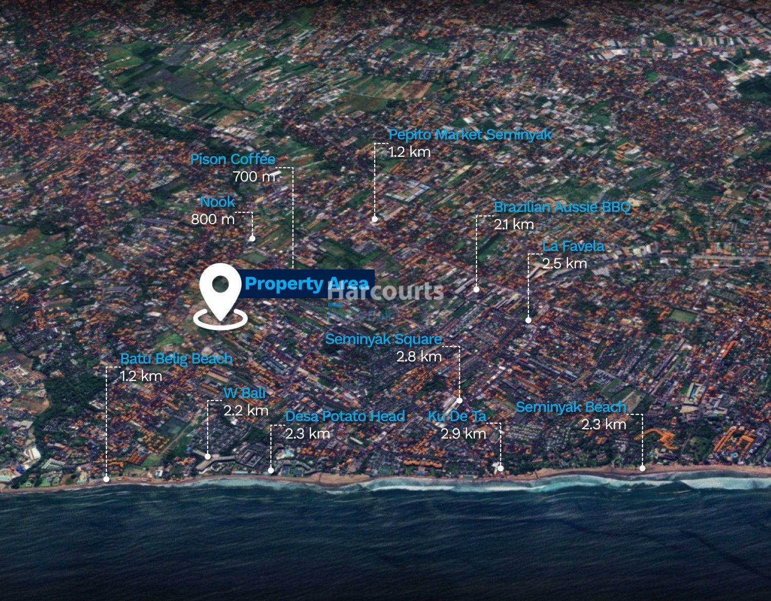 The rectangular land enjoys exceptional visibility and access, surrounded by upscale restaurants, cafes, beach clubs, and boutique retail. From its elevated position, the property captures glimpses of the coastline and is bordered by rice fields and landscaped gardens, combining urban convenience with Bali’s tropical charm. The surrounding area is defined by a mix of luxury villas, modern developments, and active construction projects, reflecting Batu Belig’s strong commercial growth and ongoing transformation.