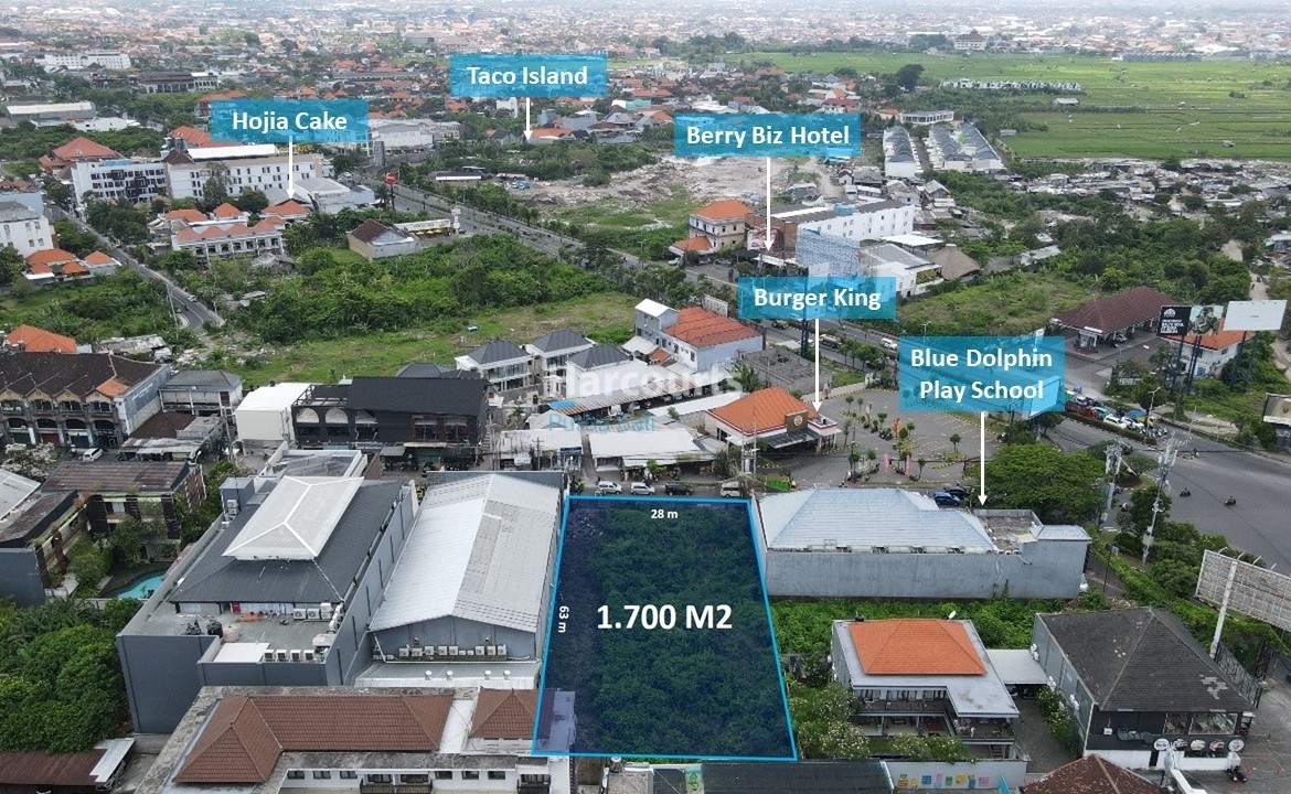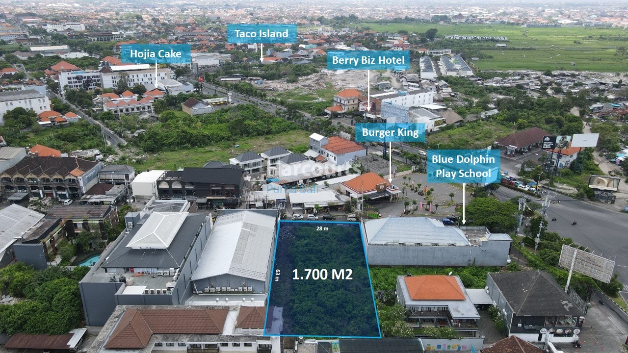 Prime commercial land in the heart of Seminyak offered on Leasehold (Hak Sewa) — 25 years remaining, with a commanding 28 metres of direct main road frontage that guarantees unrivalled exposure and ease of access for any flagship venture. This regularly shaped plot of 17 are (~1,700 m²) presents a clear, level canvas ready for immediate development and strong street presence.