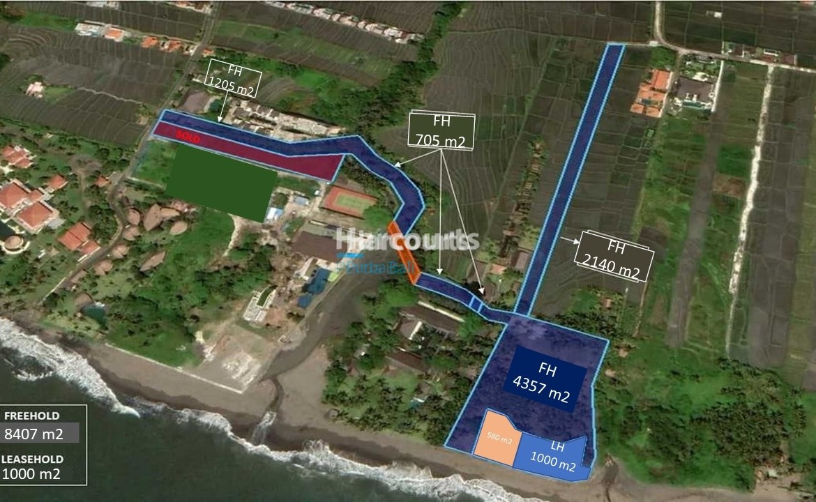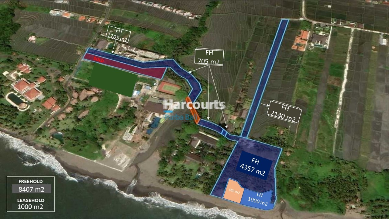 The potential of this stunning piece of 87-metre-wide, prime oceanfront land in Canggu, Badung regency, is only limited by the imagination. With fantastic sea and sunset views, the 8,407 sqm freehold plot and 1000 sqm leasehold plot (27 years) of tourism-zoned land would suit a large villa development or a large villa complex. The plot is directly accessed via a 5-metre-wide road; electricity & water supplies are nearby, certificates have been issued meaning it’s ready to build. Positioned beside the rolling surf of the Indian Ocean, the land emanates a tangible energy. There is a feeling of harmony with the environment & all of nature’s elements. Bali’s Ngurah Rai International Airport is 30 minute drive.Offered freehold, this land is one of the best beachfront plots available in Canggu.