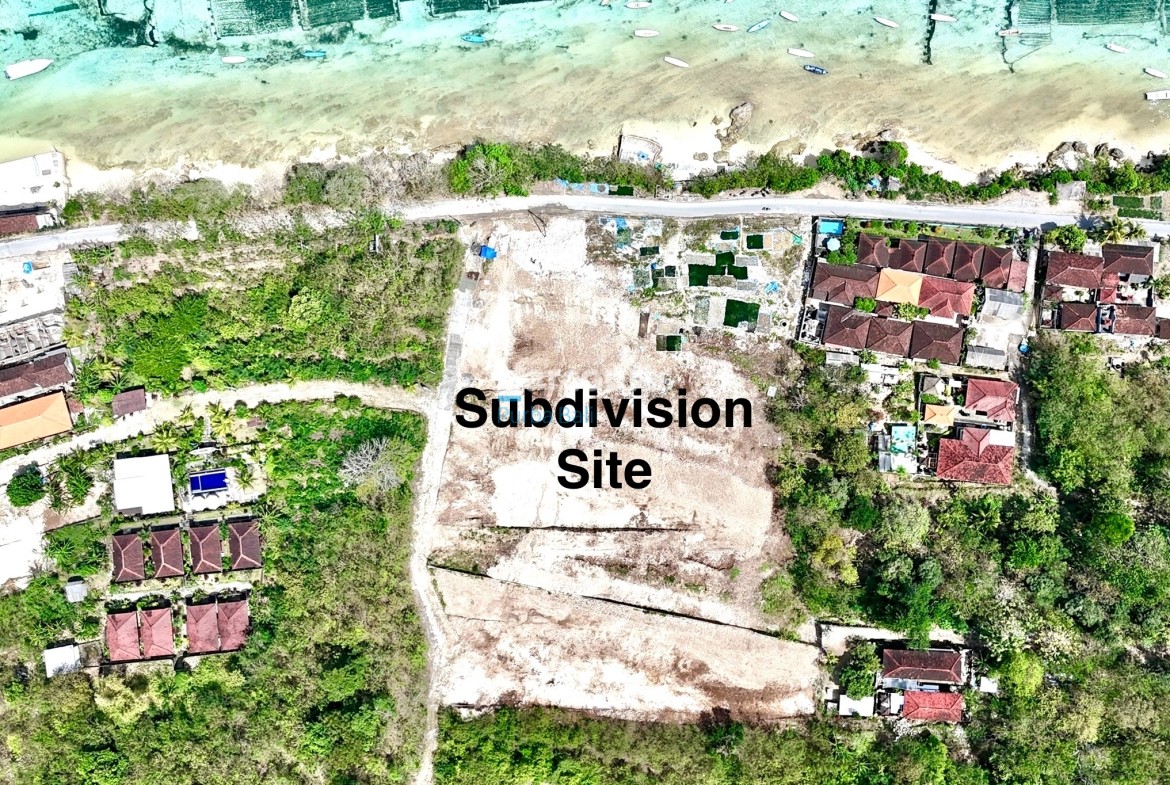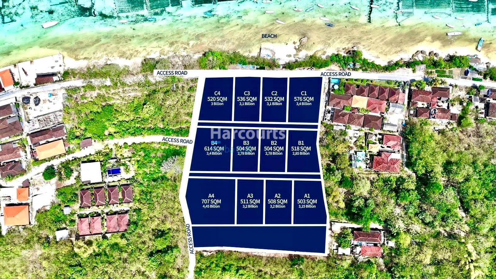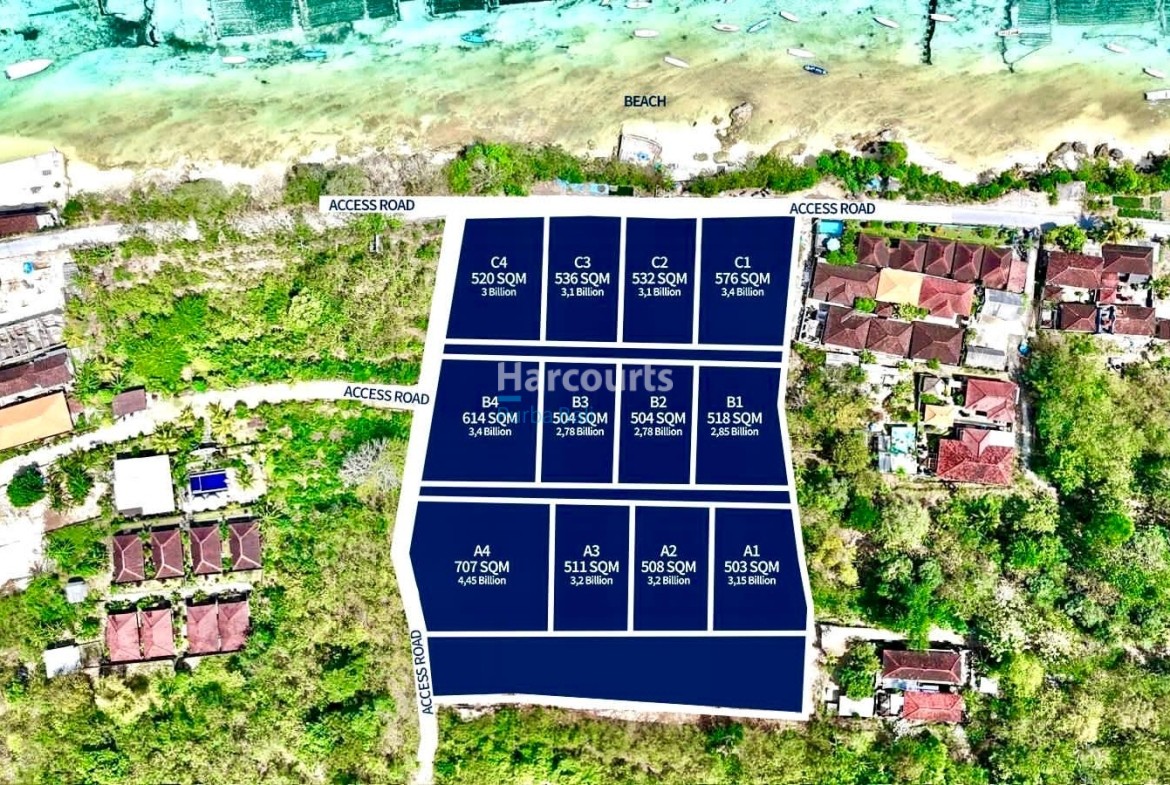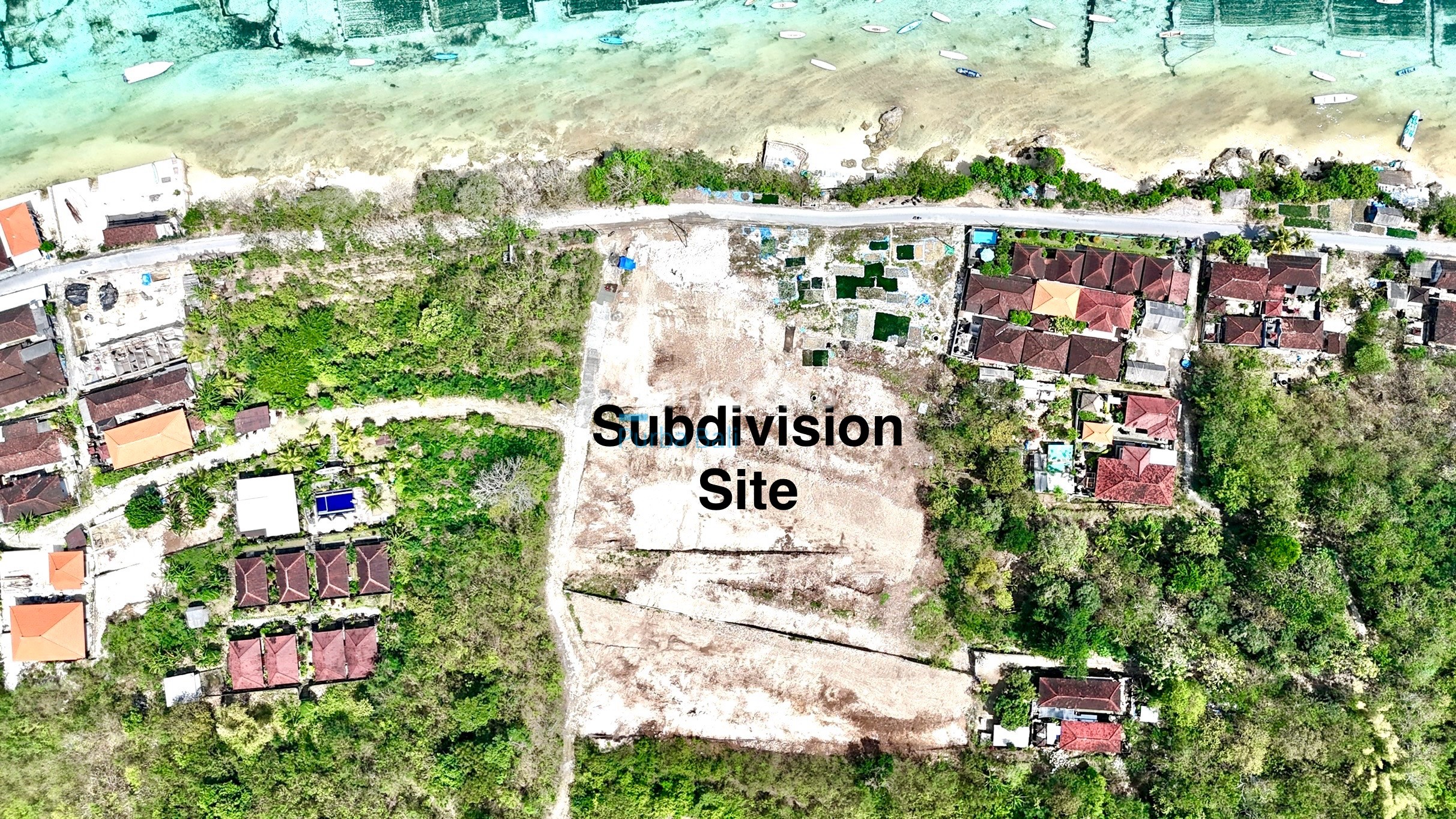 The subdivision consists of 12 freehold lots ranging in size from 503m2 to 707m2. 4 lots (C1, C2, C3 and C4) are positioned waterfront with main road frontage ideal for either commercial space or private villas or a combination of both. The other 8 lots are set in 2 rows of 4 midway up the hill (B1, B2, B3 and B4) and at the very top of the hill (A1, A2, A3 and A4). All lots have impressive channel, ocean, Mahana Point surf break and Nusa Ceningan views, particularly rows A and B. Another amazing view from this land is of the famous seaweed farms that inhabit almost all of the channel between Lembongan and Ceningan. A couple of times each day at low tide you can kick back with Bintang in hand and watch the seasoned seaweed campaigners going about the time honoured tradition of tending to their maritime crops planting and harvesting…Height restrictions in place government registered to ensure views are protected with a maximum of 2 levels only that can be built on each lot giving peace of mind to purchasers.