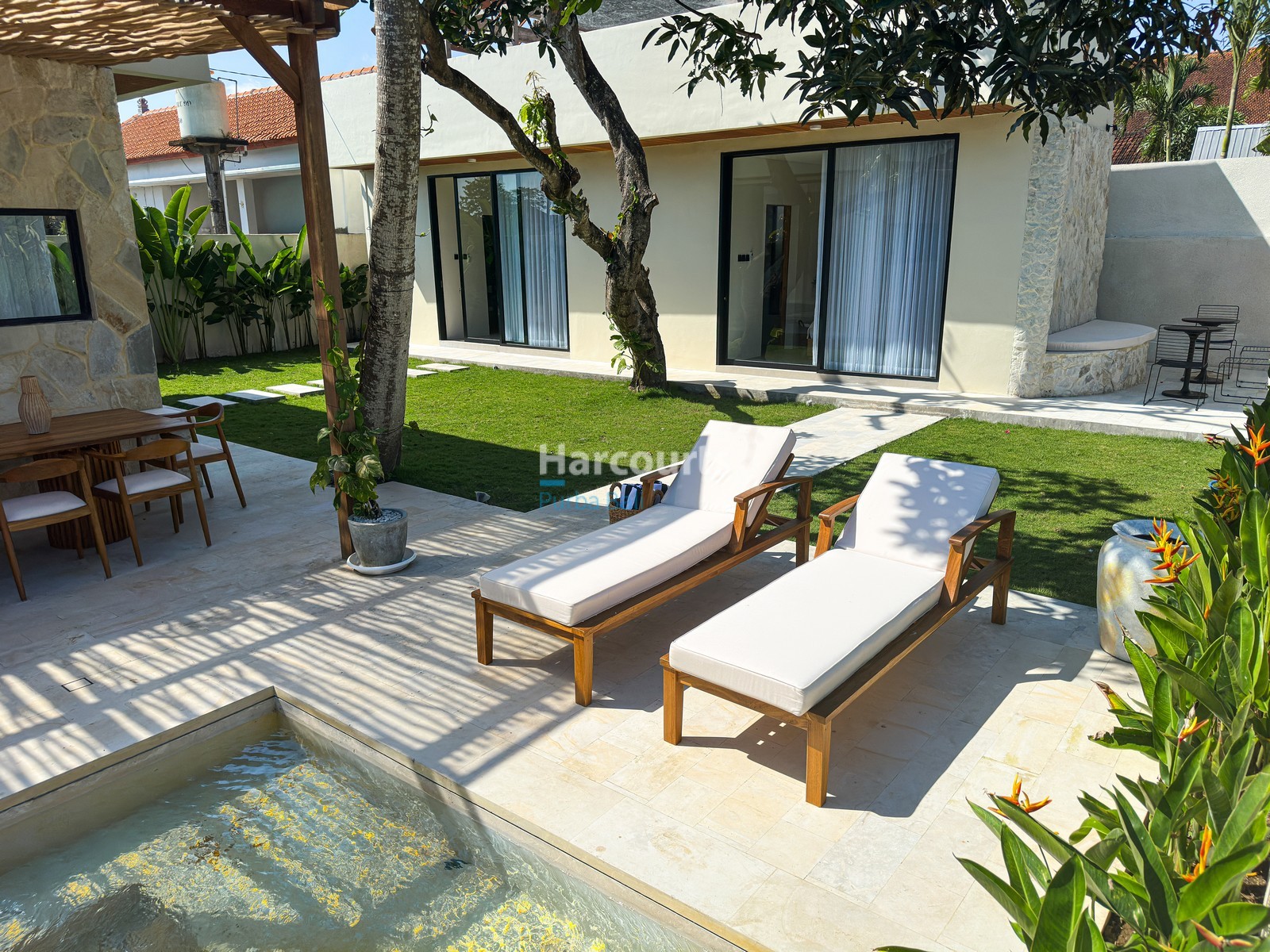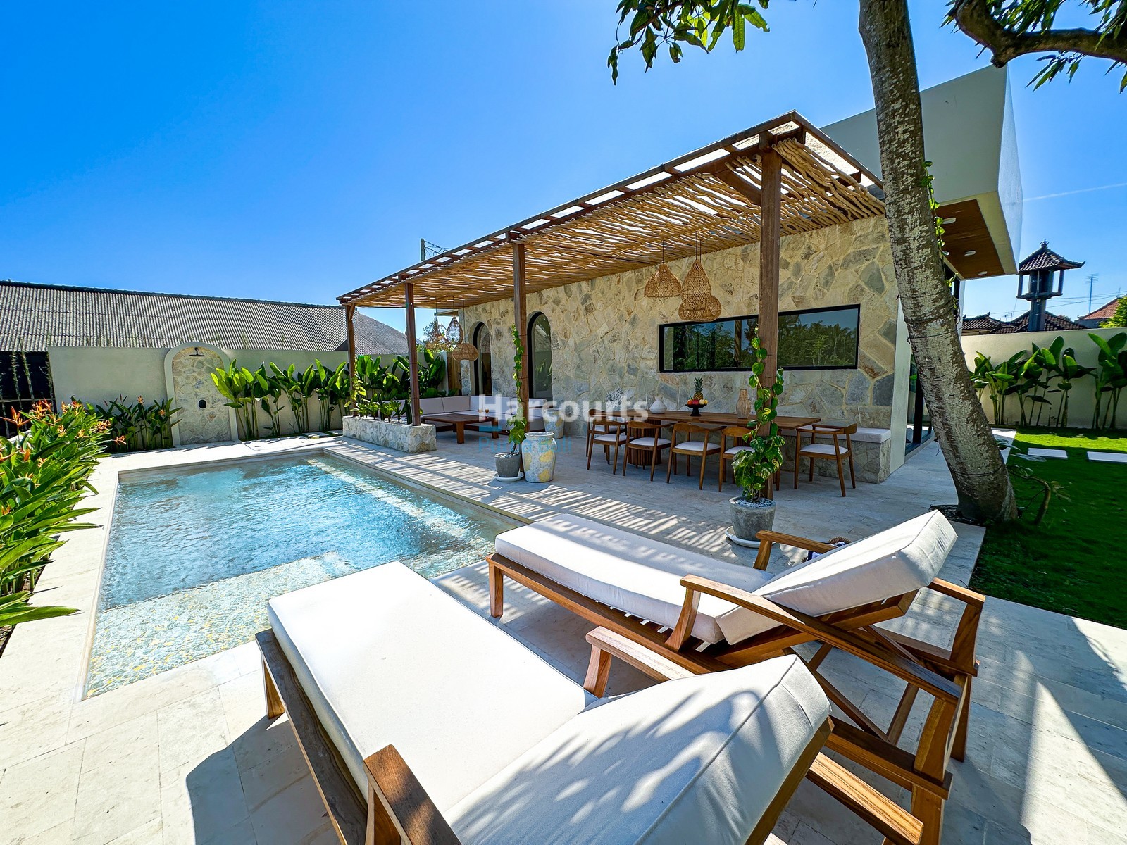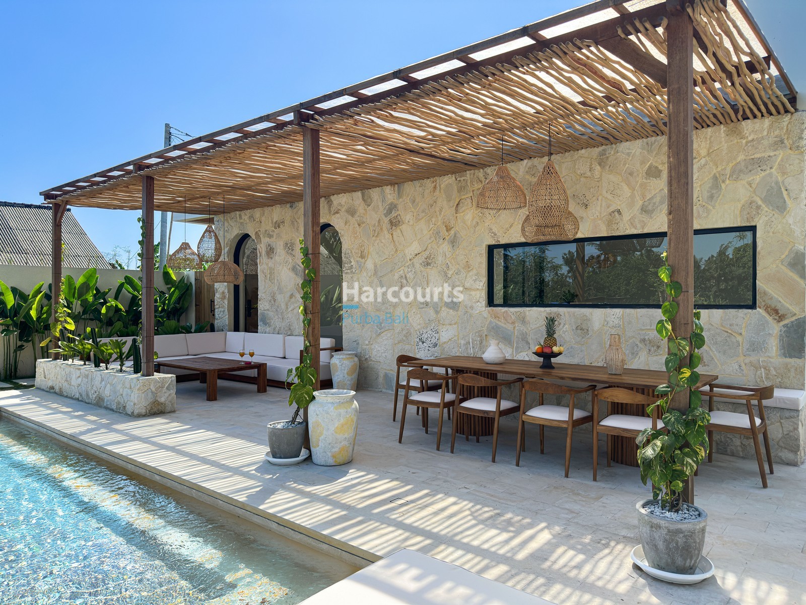 Fully furnished and move-in ready, this single-level 3-bedroom villa has a seamless blend of soft Mediterranean forms and organic modern sensibility. Arched openings, exposed wood beams, and natural stone create a warm, coastal-European feel, while earthy textures and neutral tones reinforce a calming, grounded ambiance. Inside, the layout is functional and stylish—an enclosed living room with integrated dining and a western-standard kitchen opens out to a lush, landscaped garden, where tropical trees and flowering plants frame the 21 sqm swimming pool.