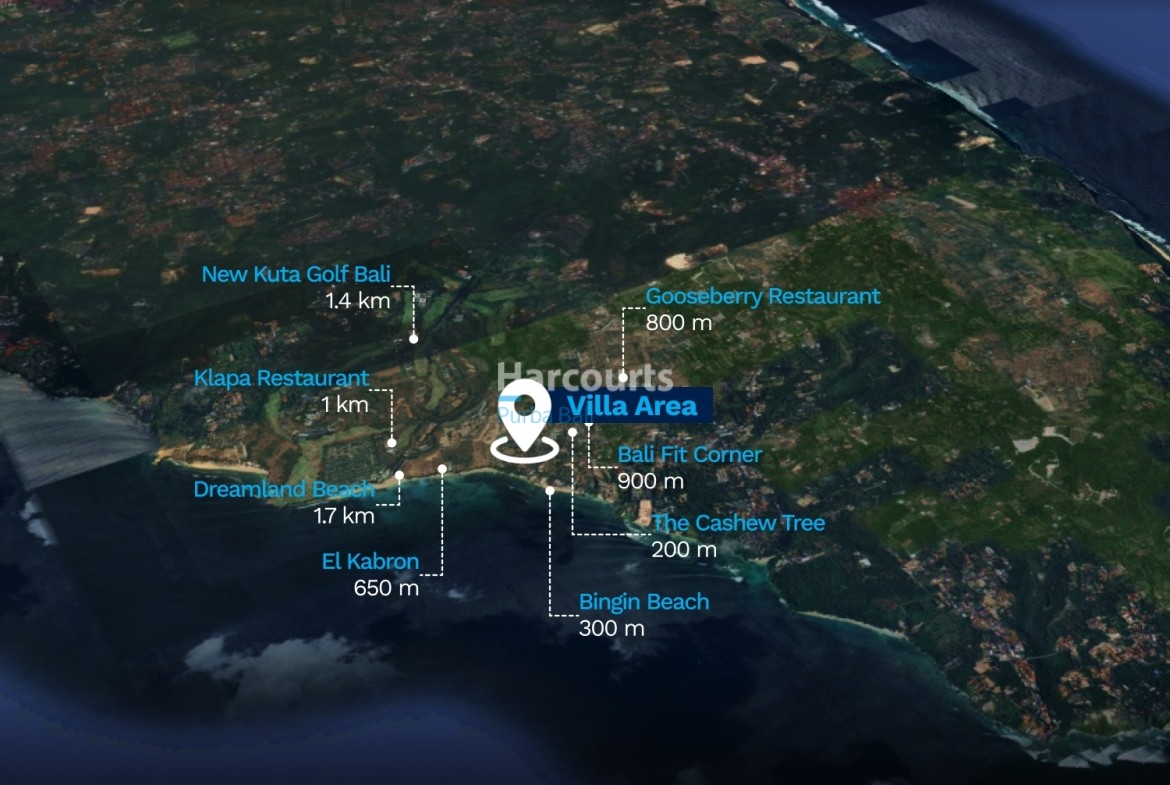 Cashew Tree 200 m, Lakra Spa 350 m, Elkabron 650 m, Salty Coffee 750 m, Bali Fit Corner 900 m, Dreamland Beach 1 km, Klapa Restaurant 1 km, New Kuta Golf 1.4 km, Taman Rama School 3.5 km, Blue Point 3.1 km, Bulgari Resort 4.3 km.