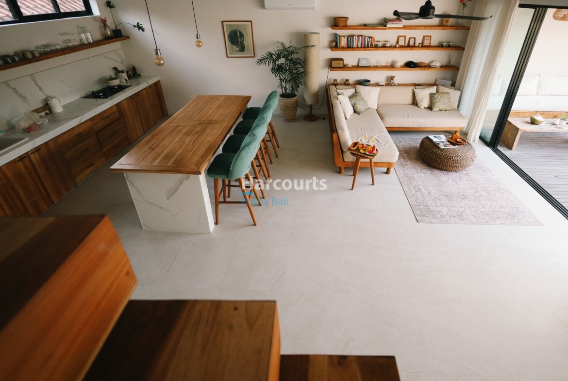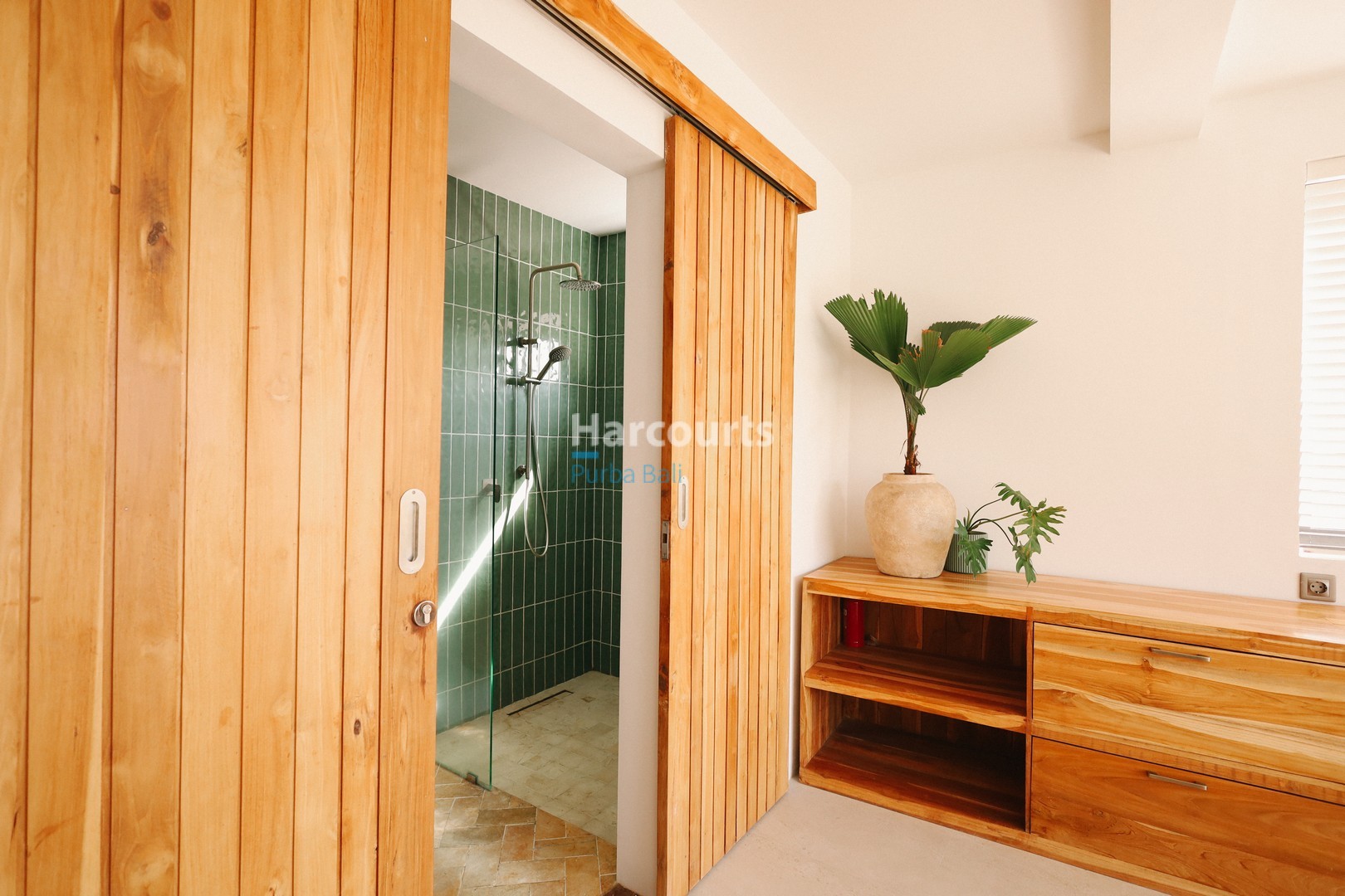 Set on 105 sqm of land with 187.5 sqm of living space, the villa maximizes every corner. The enclosed living and dining area connects seamlessly to a fully equipped kitchen and opens onto a private rectangular swimming pool, perfect for relaxing under the Bali sun. Two spacious bedrooms are complemented by modern bathrooms featuring rain showers and quality finishes, while a guest bathroom adds extra convenience.