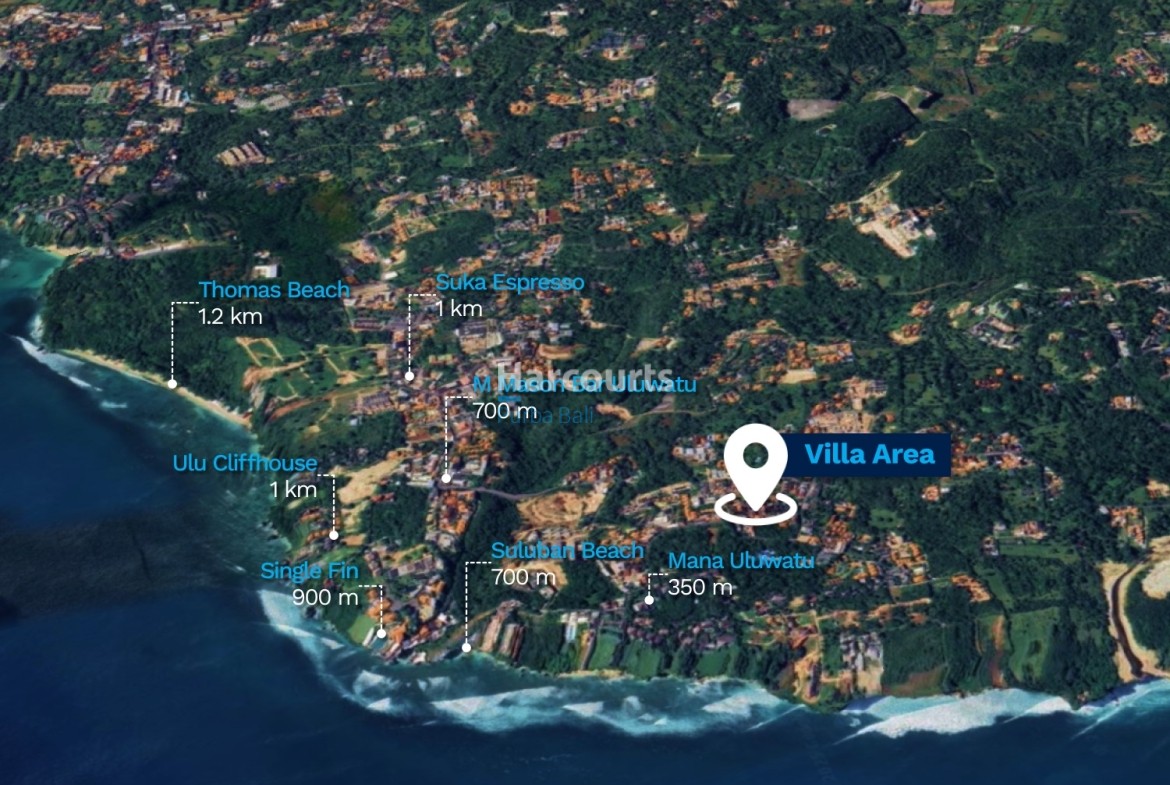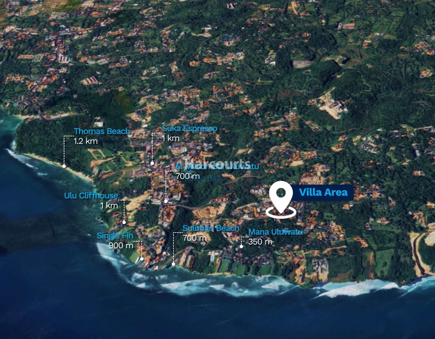 Nearby: Mana Uluwatu 350 m, Suluban Beach 700 m, M Mason Bar Uluwatu 700 m, Single Fin 900 m, Ulu Cliffhouse 1 km, Suka Espresso 1.1 km, Thomas Beach 1.2 km