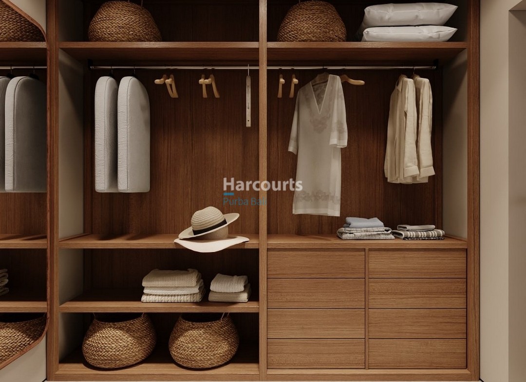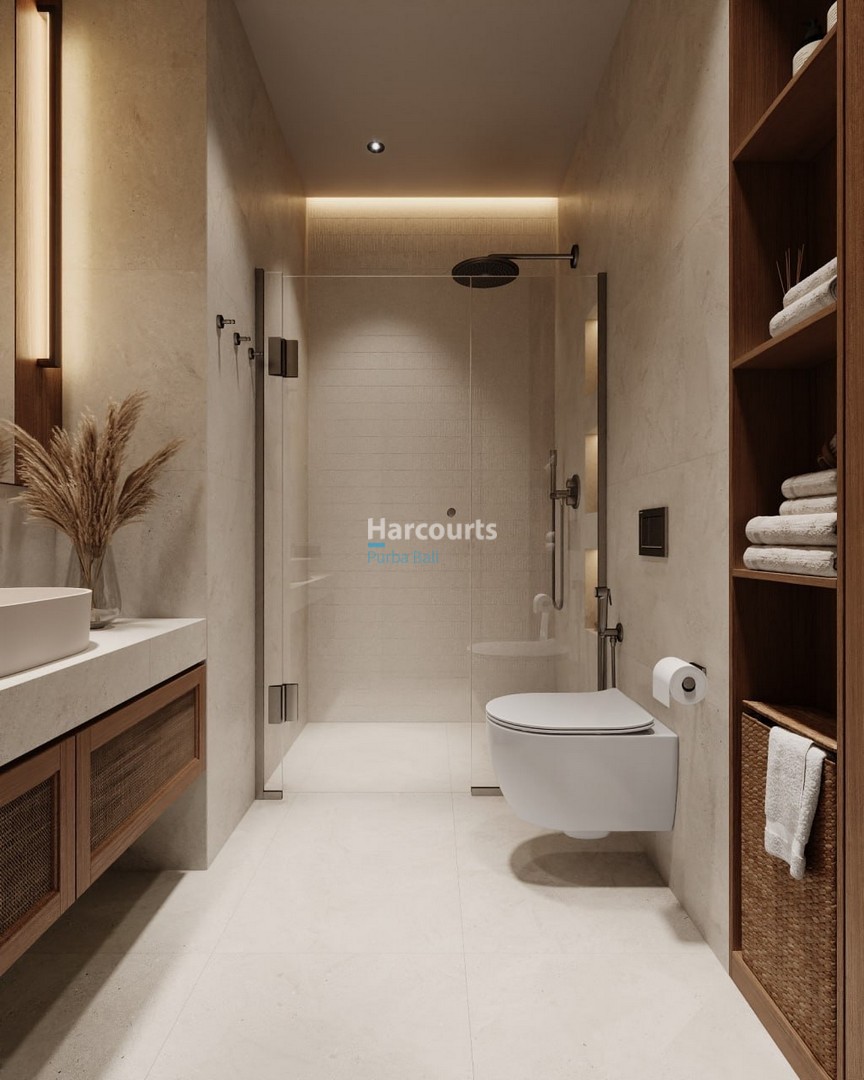 A refined bathroom enhances the apartment’s contemporary feel with a glass-enclosed shower and rainfall showerhead, a wall-mounted toilet, and a wooden vanity topped with a white vessel sink and woven drawers, all set against light neutral tiles and stone-like flooring. Practical touches throughout — integrated shelving, natural textiles and a potted plant — reinforce the understated, tactile palette.