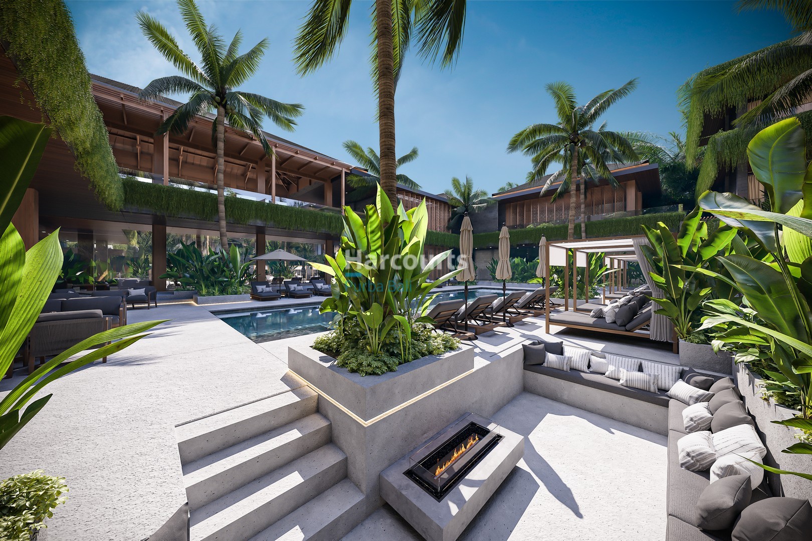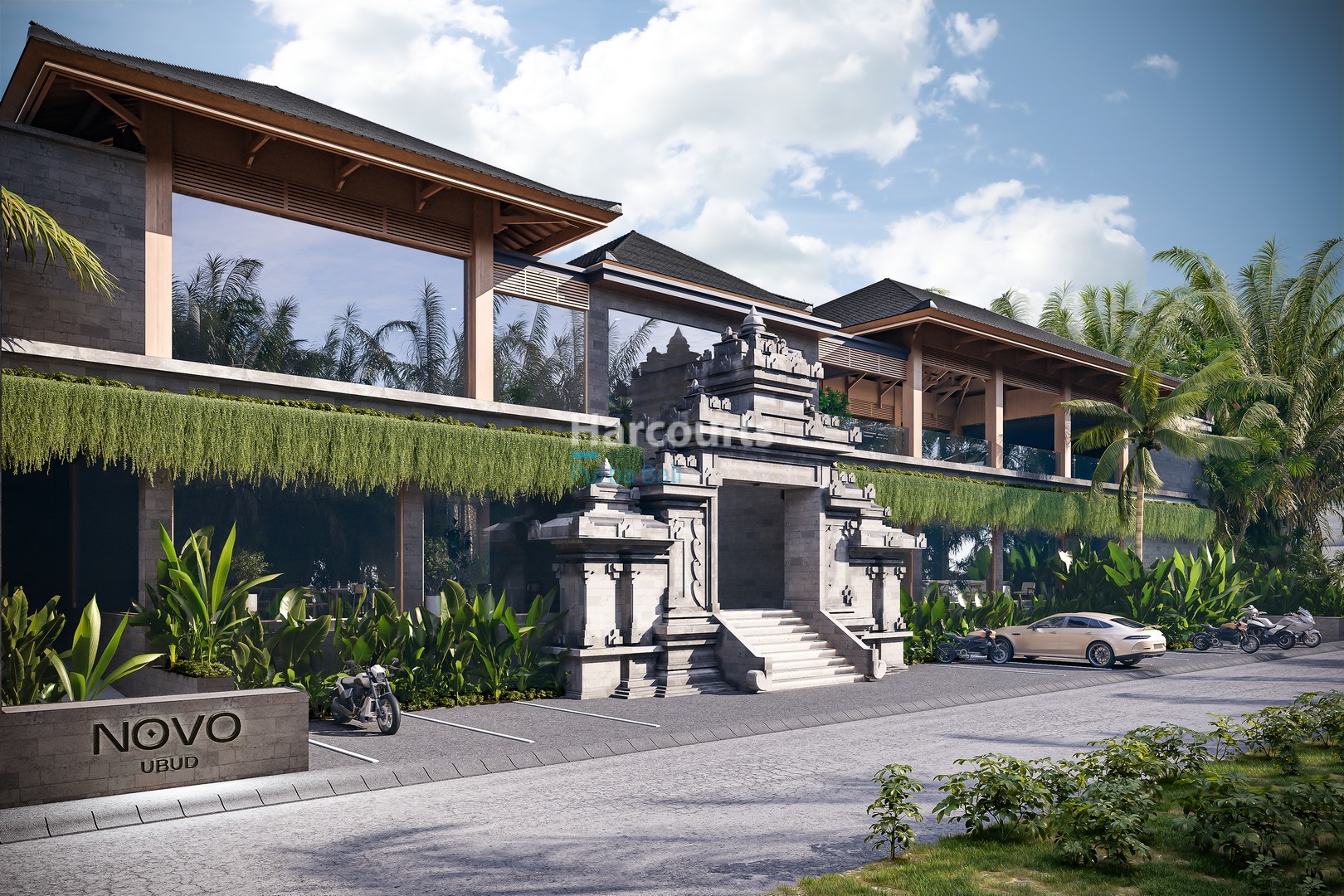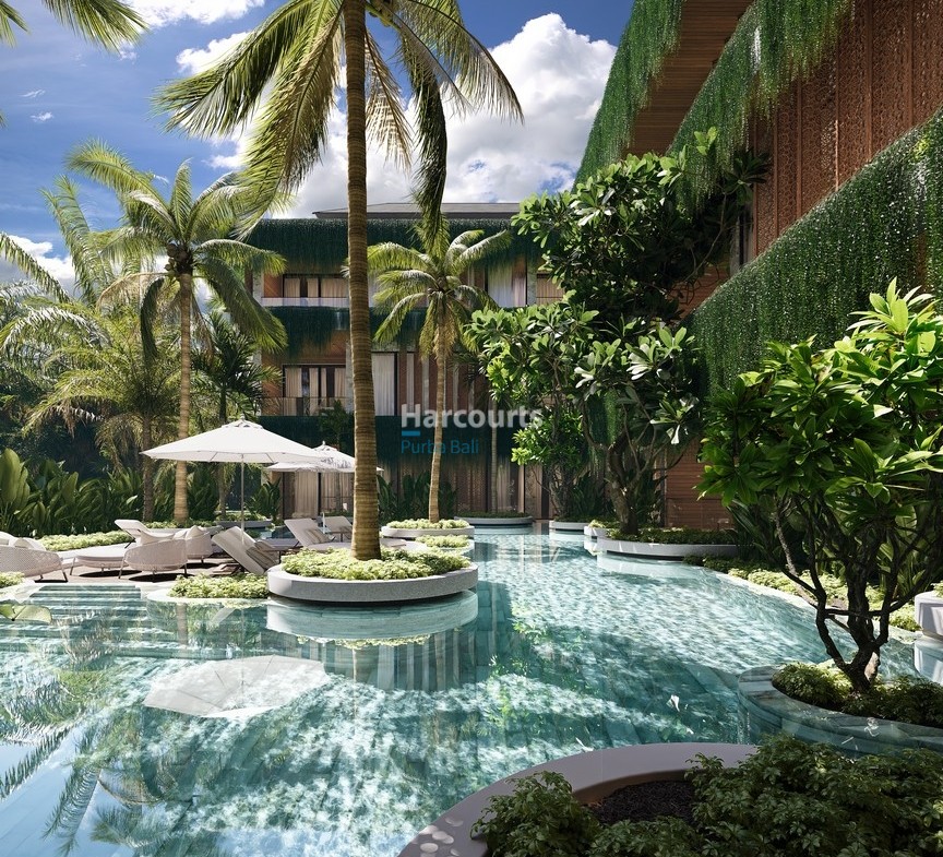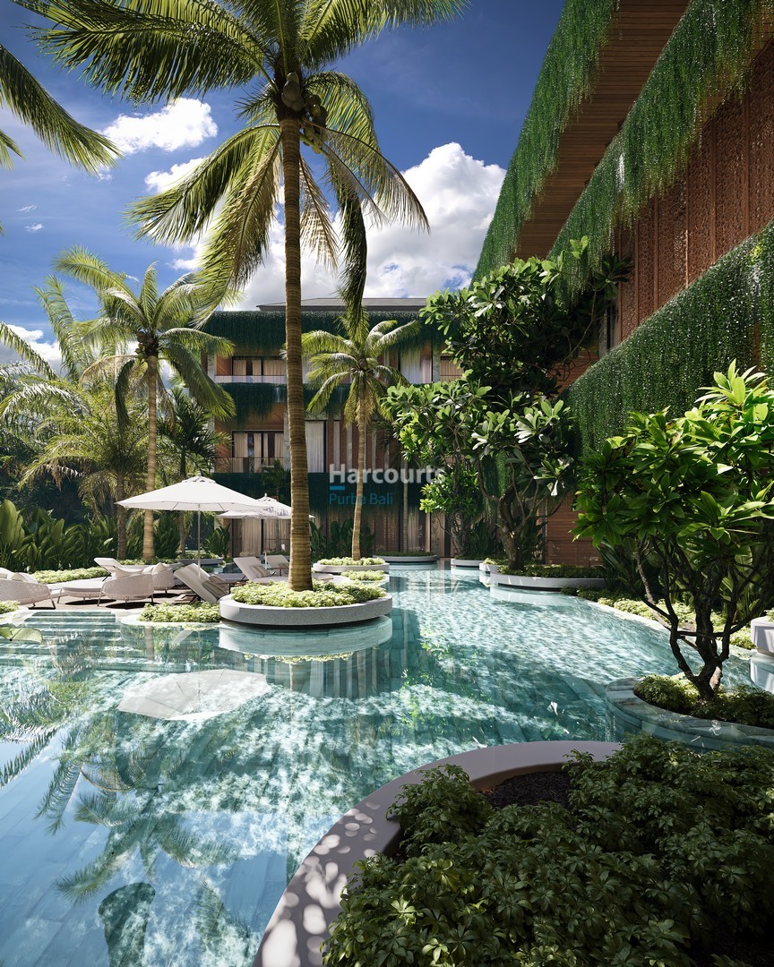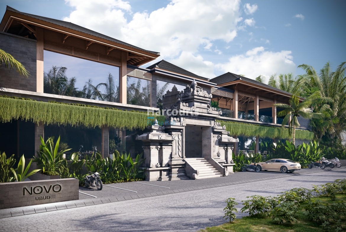 The development offers a full suite of on-site amenities including a fitness club, restaurant and bar, coworking space and a full-service spa with its own pool and relaxation area, all framed by tropical landscaping. The building’s modern architecture is complemented by a traditional Balinese entrance with stone carvings, covered balconies and secure parking provisions. Located on a quiet street yet close to Ubud’s restaurants, wellness centres and cultural a…