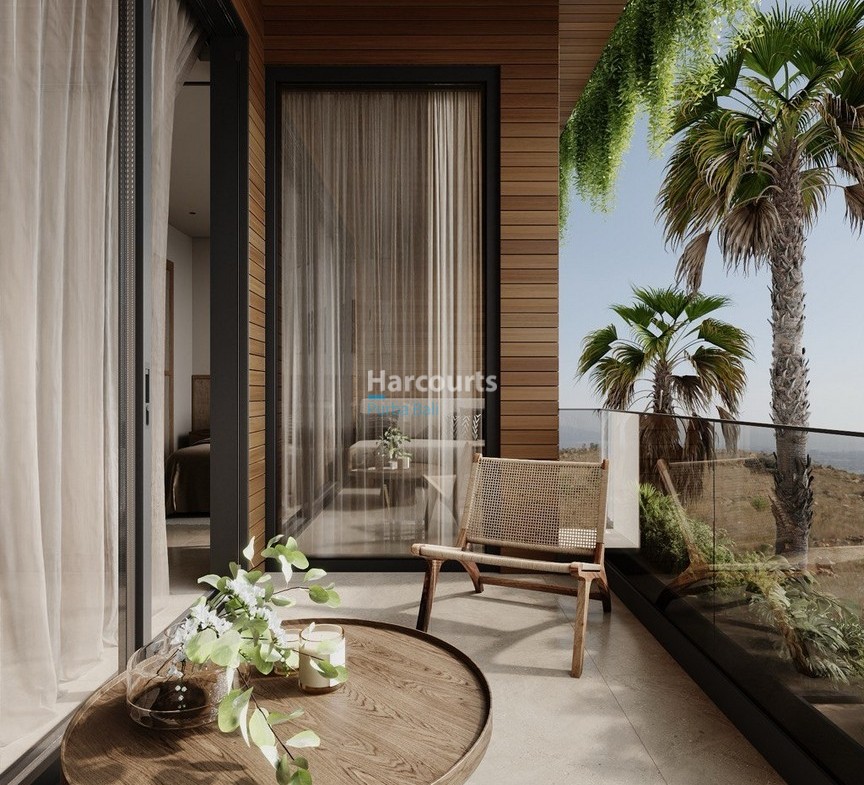 The interior layout emphasizes a seamless indoor–outdoor flow: an open-plan living room and kitchen open to a private terrace, creating a bright, airy atmosphere. Finishes are warm and restrained — light wood cabinetry and shelving, a marble countertop at the kitchen island with two wooden bar stools, ambient shelf lighting, a round wooden coffee table and a light-coloured sofa with textured throws. The separate bedroom is a calm retreat with a large bed dressed in brown and beige tones, abstract artwork, sheer curtains admitting generous natural light, and a dedicated workspace adjacent to a walk-in closet fitted with wooden shelving and woven storage baskets.