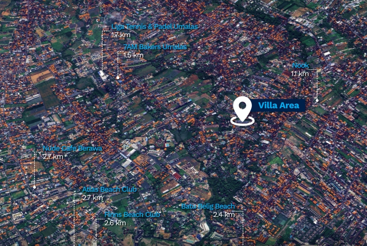 Nearby: French School 500 m, Monsieur Spoon Petitenget 1 km, Liga Tennis Center & Academy 1.3 km, Batu Belig Beach 1.5 km, Finns Recreation Club 1.5 km, Finns Beach Club 1.8 km.